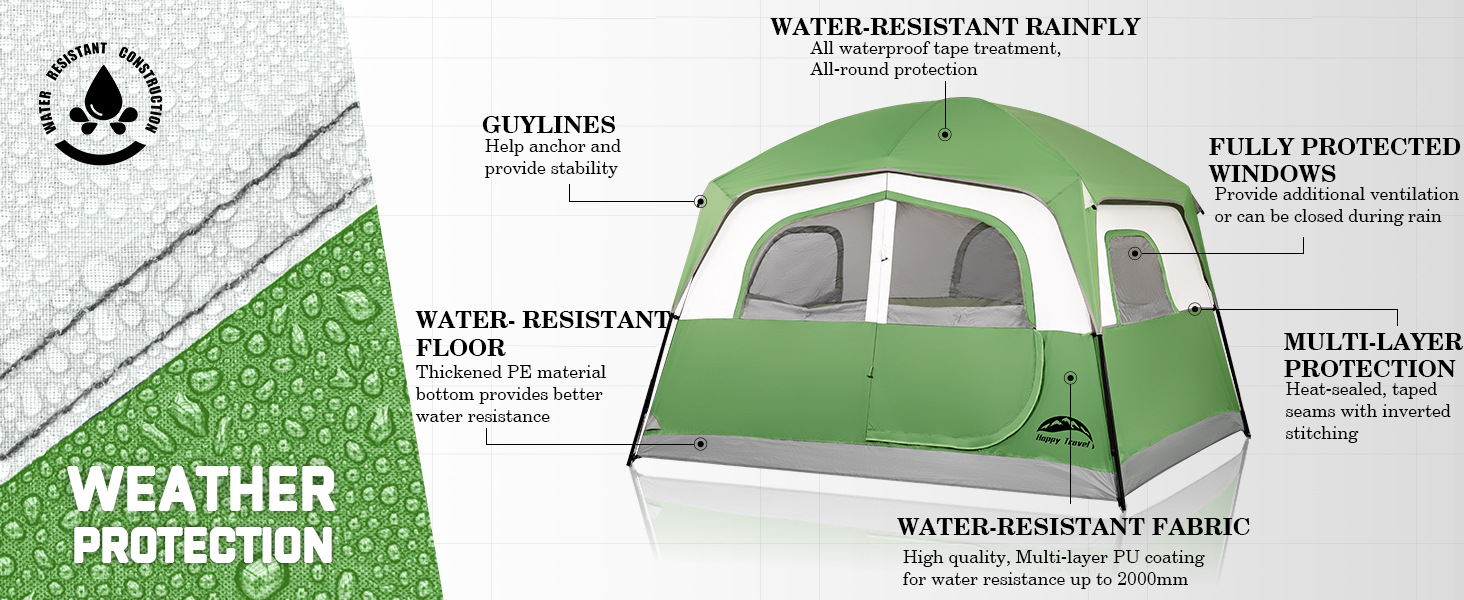 • 【高品质材料和耐用】6人露营帐篷由190T涤纶塔夫绸双层面料制成,涂有PU,防水效果达到2000mm。 门窗的网眼采用高品质的B3网眼,在通风的同时隔离蚊子,地板采用加厚PE,给您更好的防水效果。 快速帐篷的主杆采用19毫米厚的金属杆和4根金属线,在强风或大雨中为您提供全方位保护。