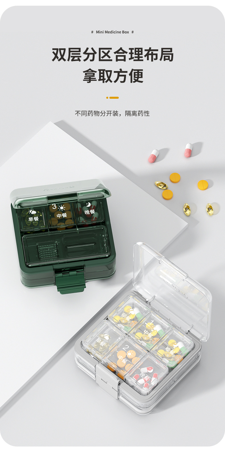 이중 강화 밀봉 3칸 약통 휴대용 약 절단기 및 분쇄기 알약 캡슐 분할 소형 약통