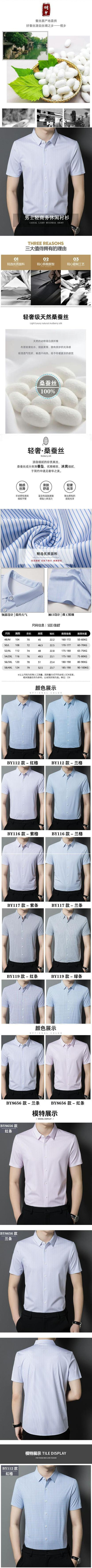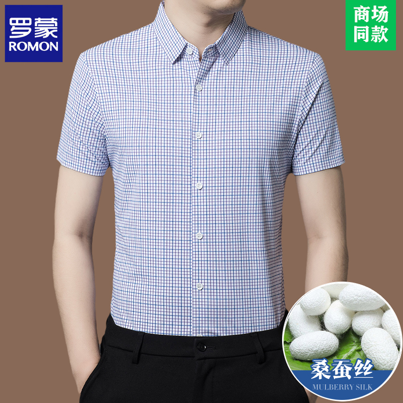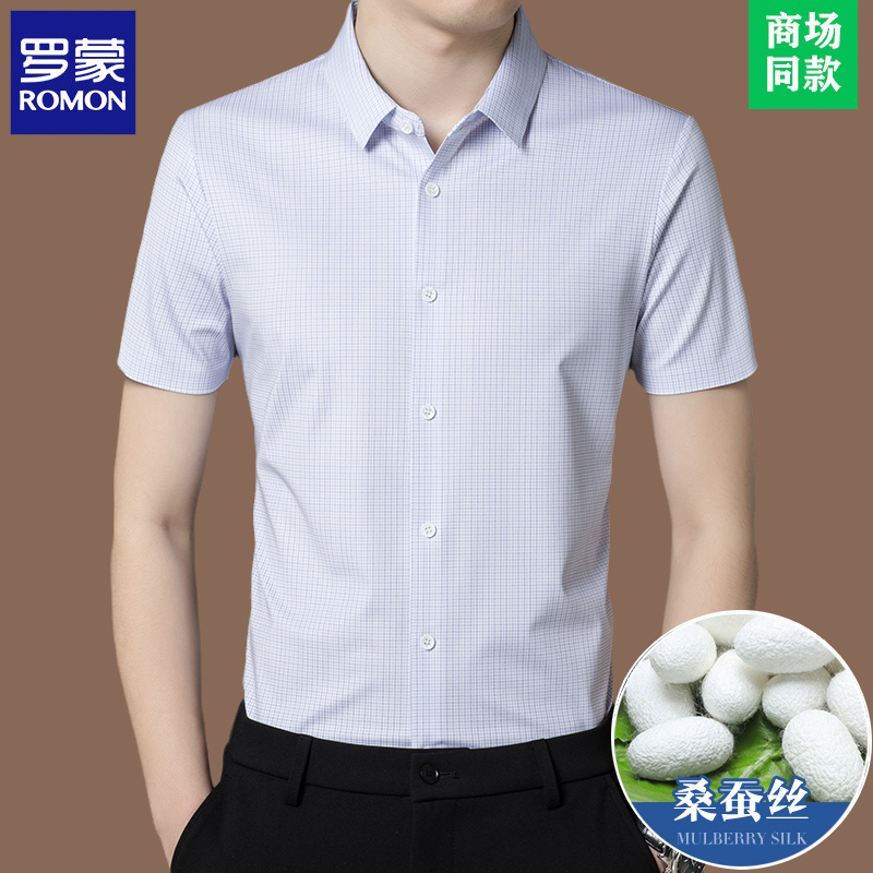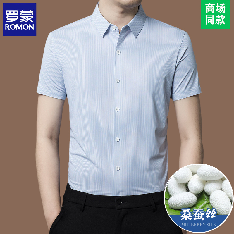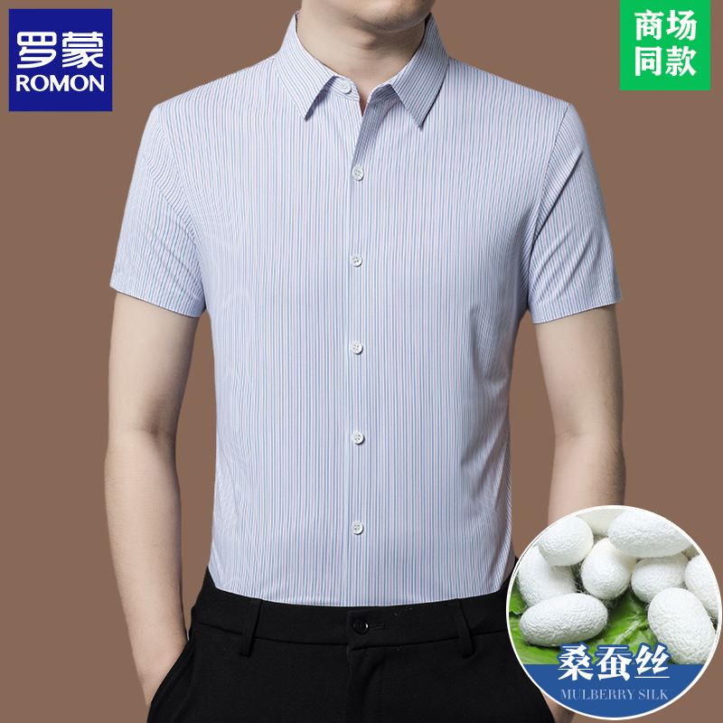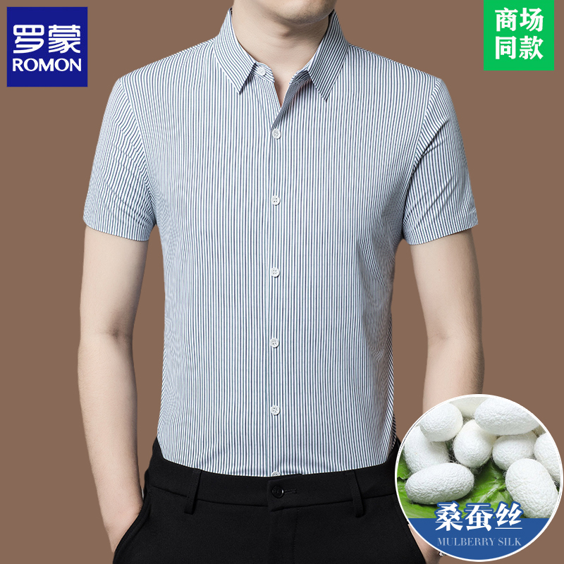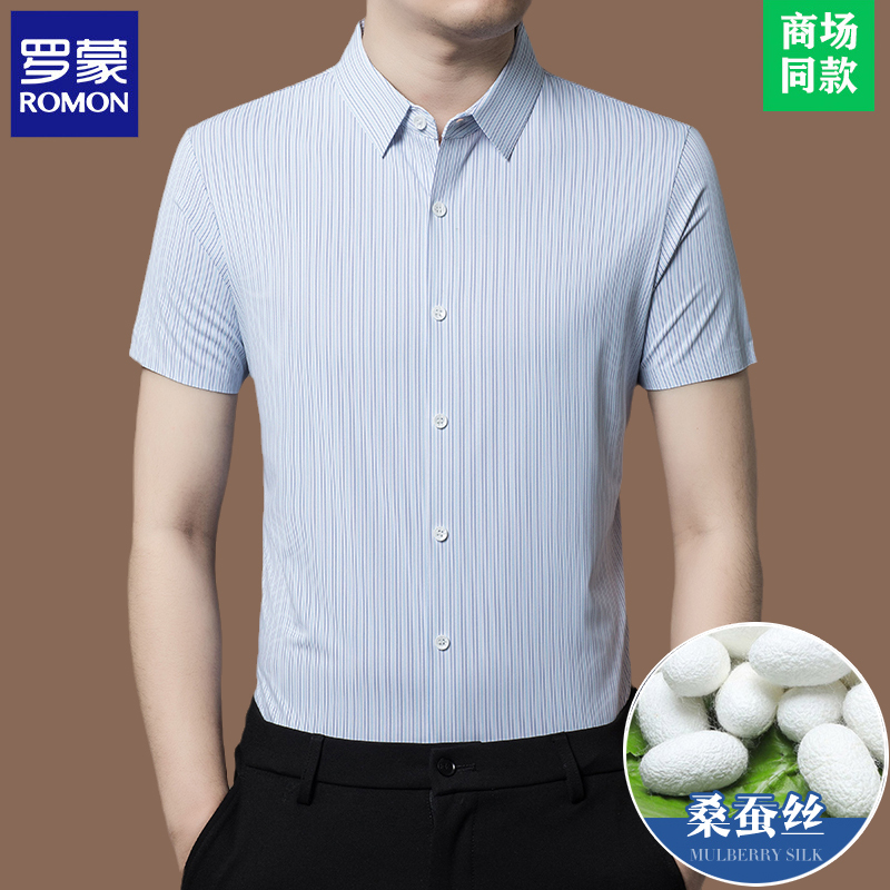 Romon 하이 엔드 멀 베리 실크 반팔 셔츠 남성 여름 신작 중년 캐주얼 남성 스트라이프 아이스 실크 셔츠 얇은스토어 가기