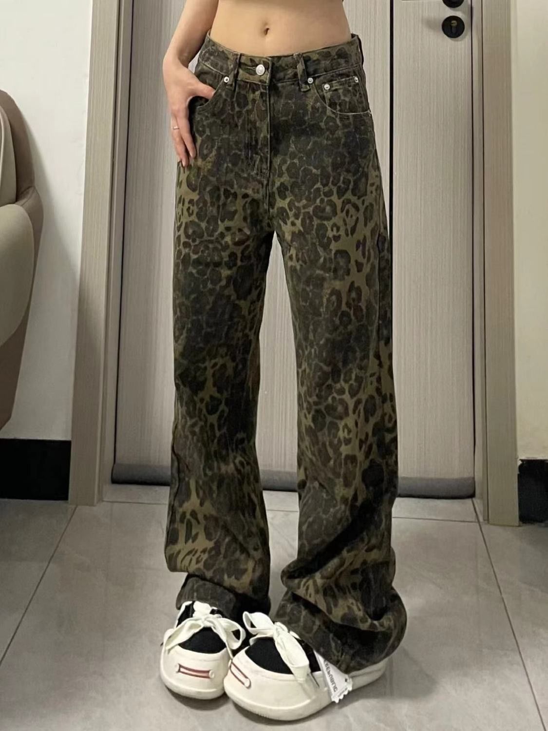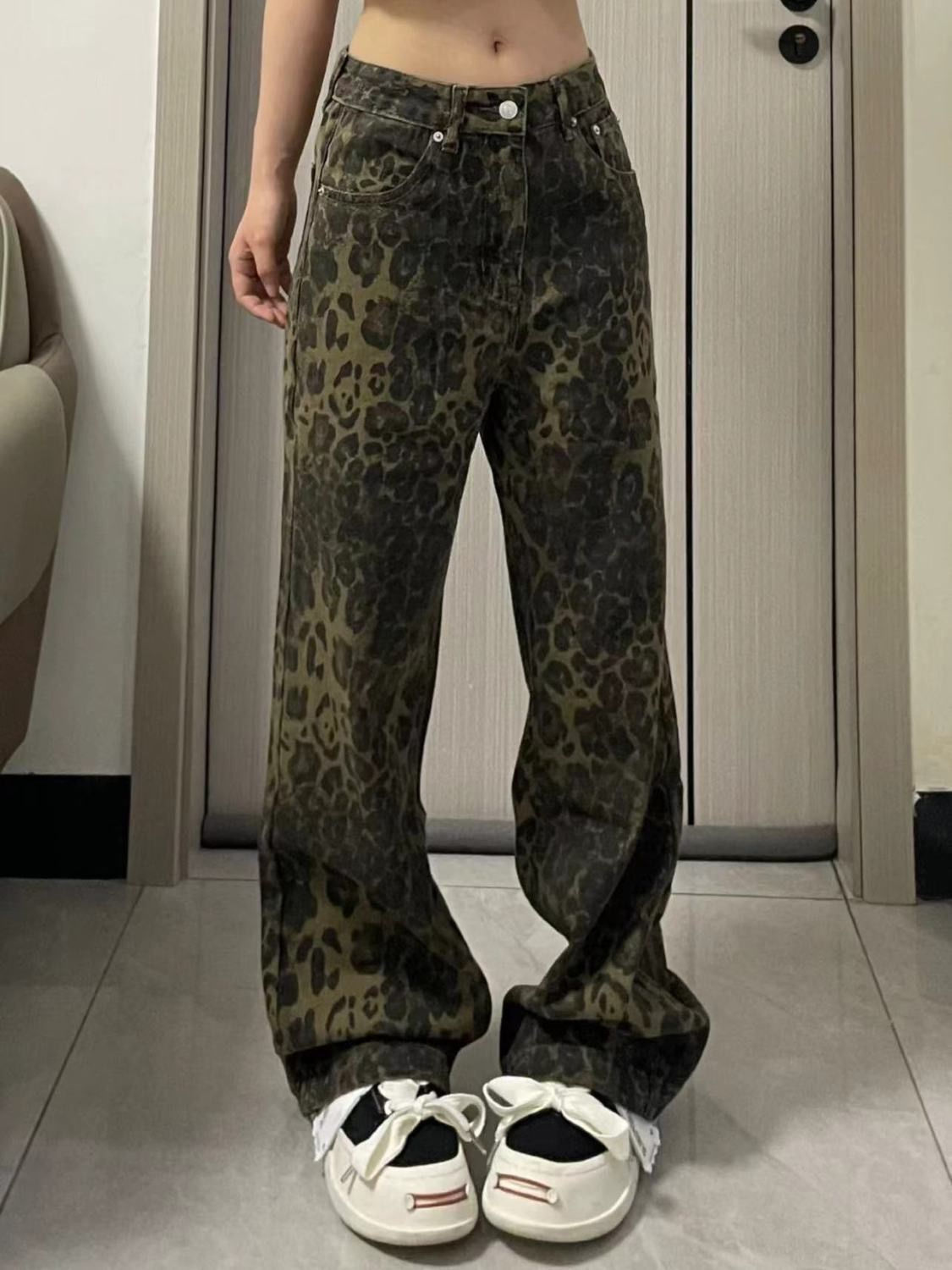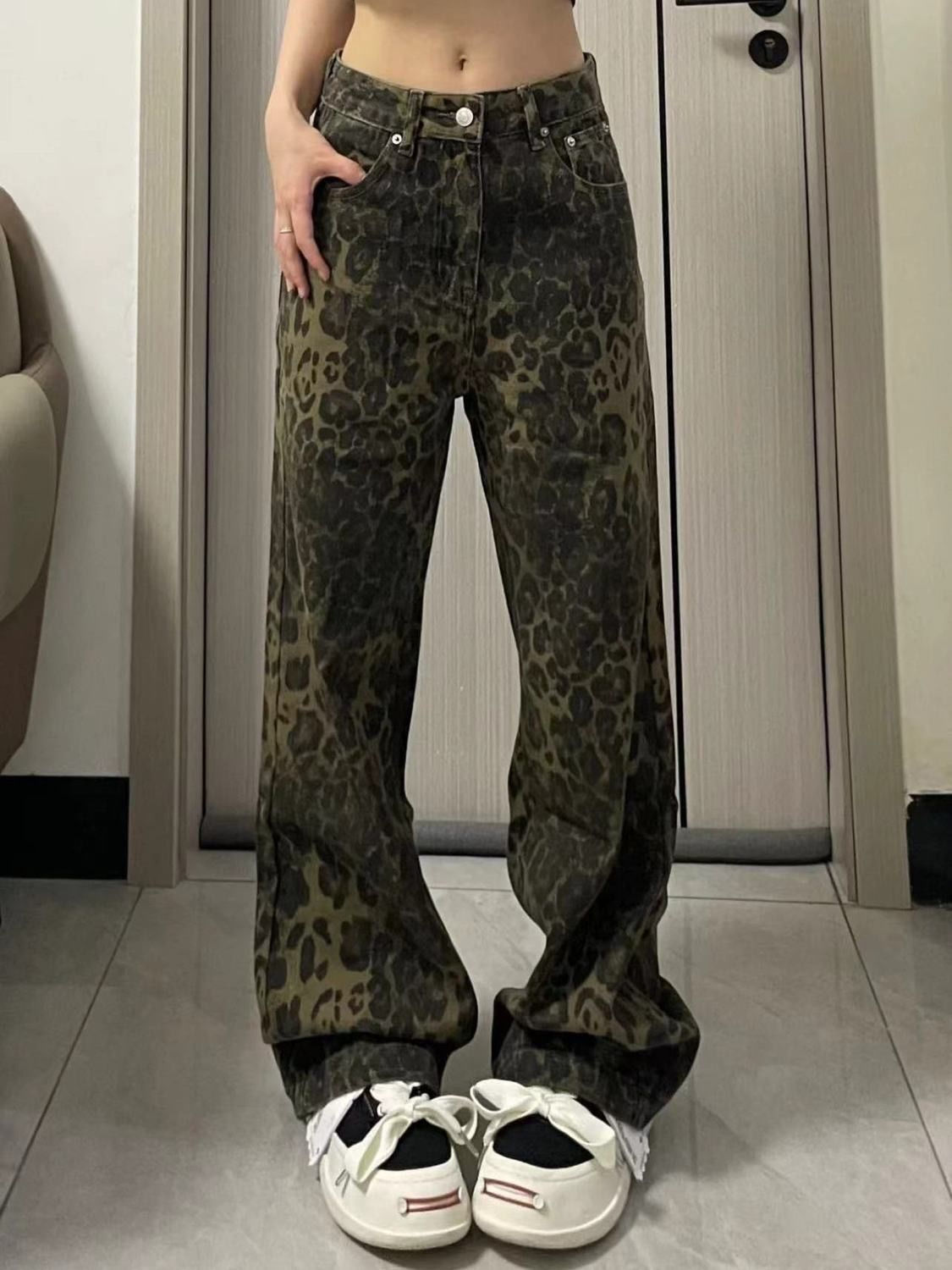 아메리칸 스타일 하이 스트리트 올드 루즈 레오파드 데님 넓은 다리 바지 여성 디자인 높은 허리 스트레이트 바지 2024스토어 가기