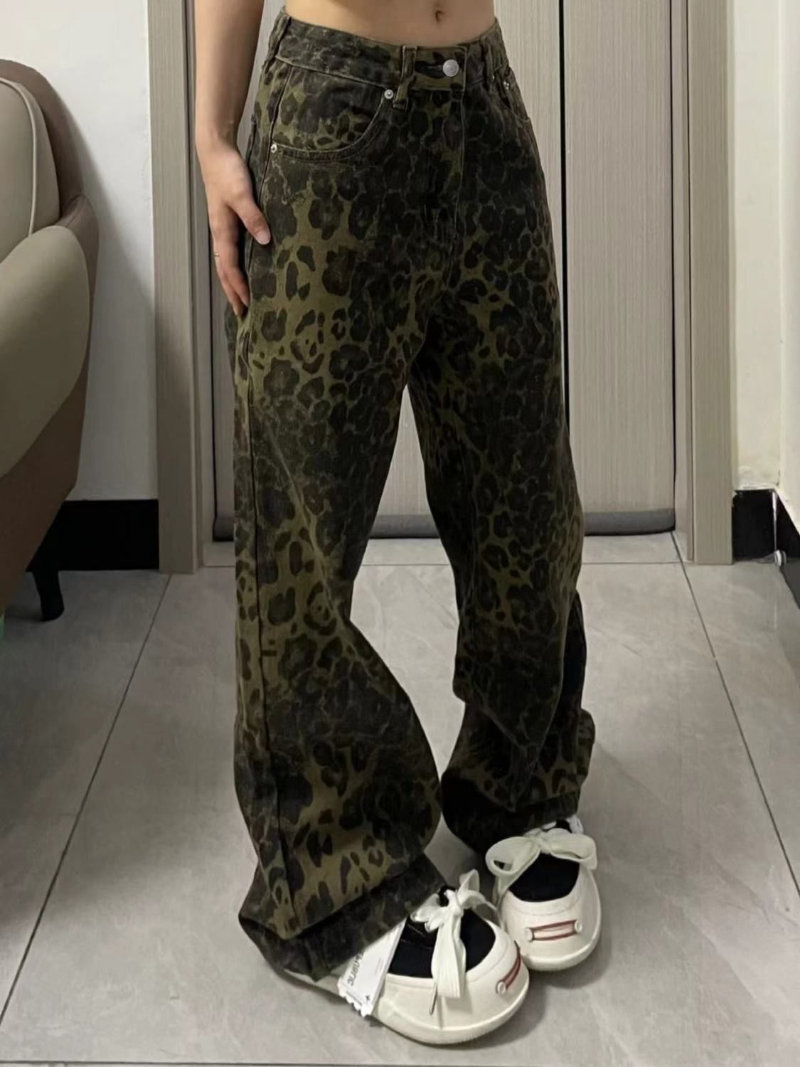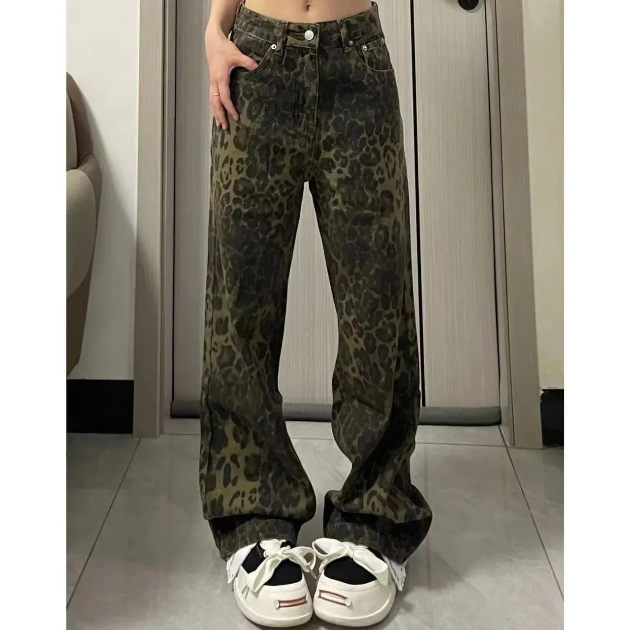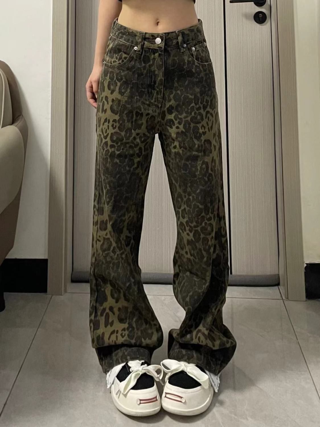 아메리칸 스타일 하이 스트리트 올드 루즈 레오파드 데님 넓은 다리 바지 여성 디자인 높은 허리 스트레이트 바지 2024스토어 가기
