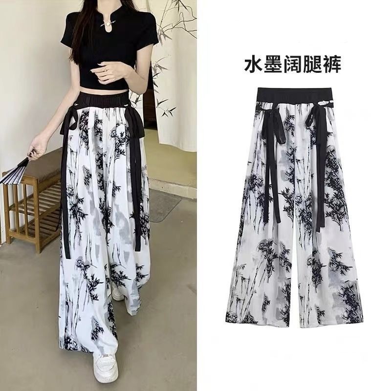 여자 정장 새로운 중국 스타일 잉크 민족 스타일 캐주얼 바지 얼음 실크 패션 인 반팔 티셔츠 서양식 캐주얼 스트레이트 바지스토어 가기