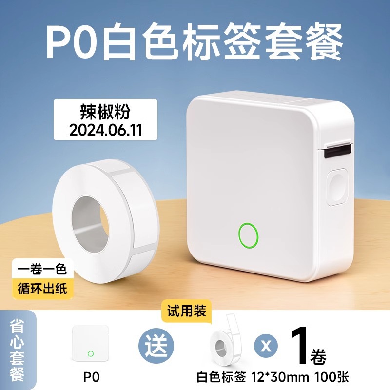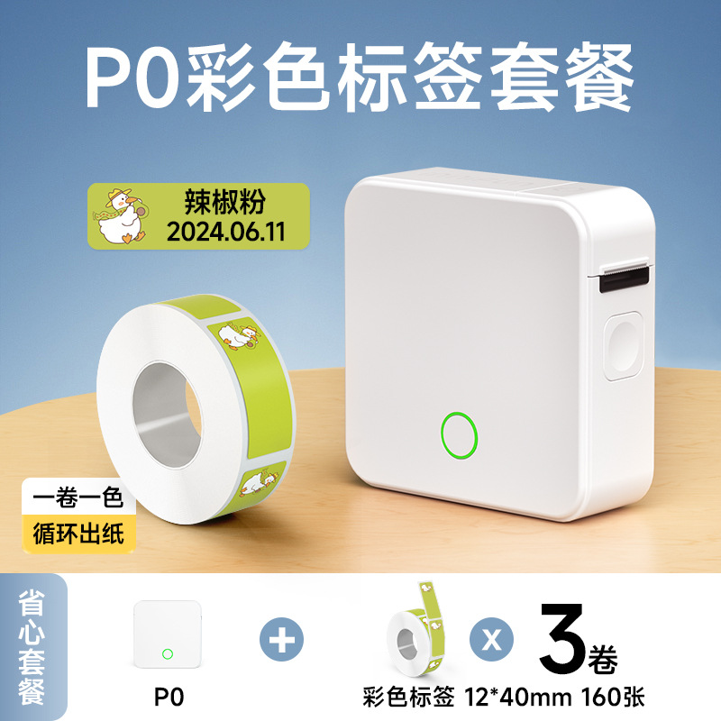 • P0 는 12*40mm 컬러 라벨의 3 롤과 함께 표준으로 제공됩니다.