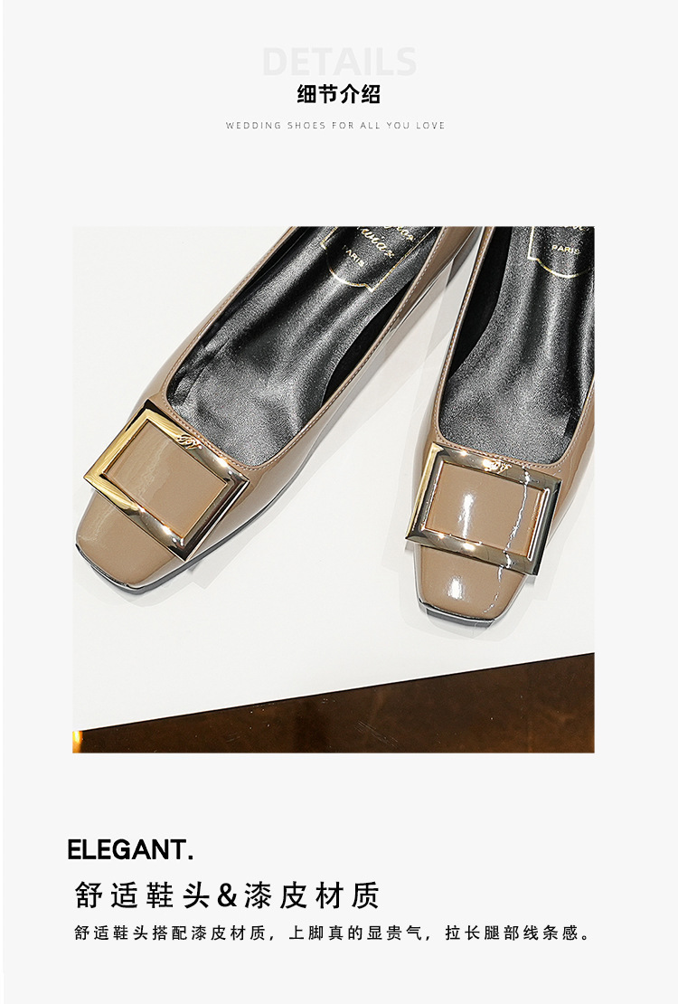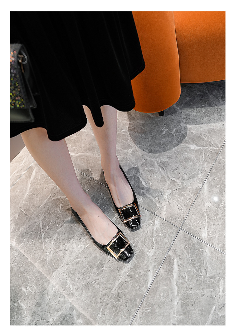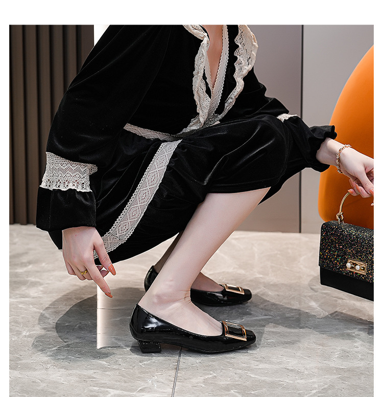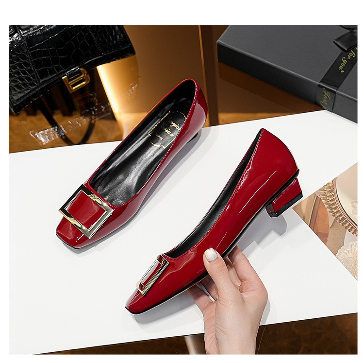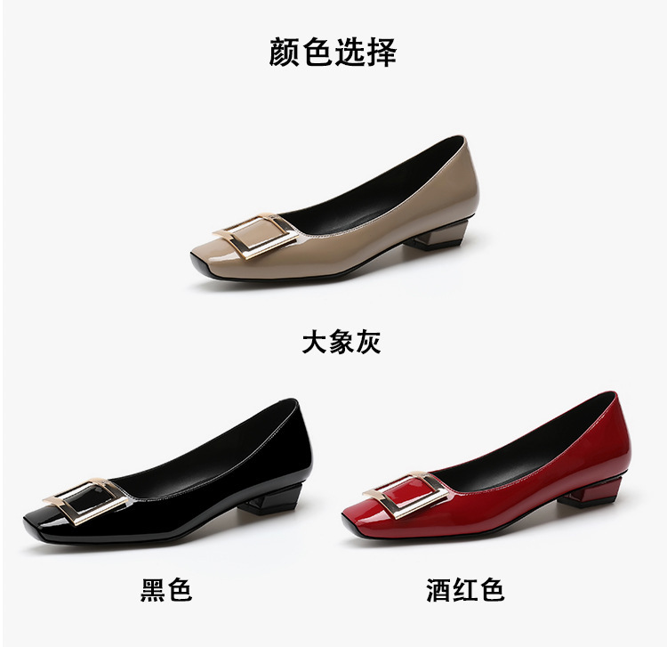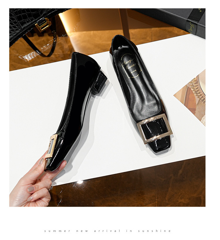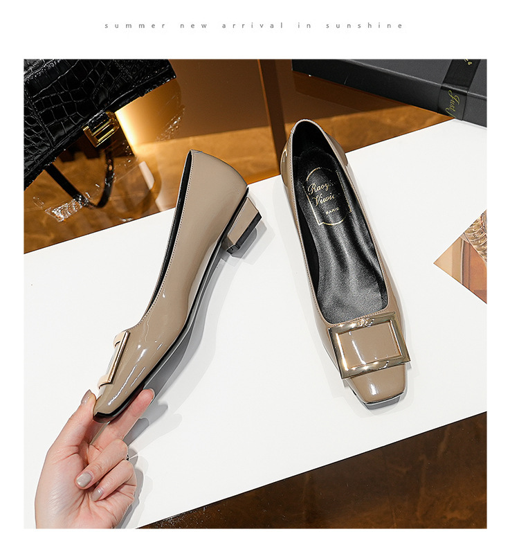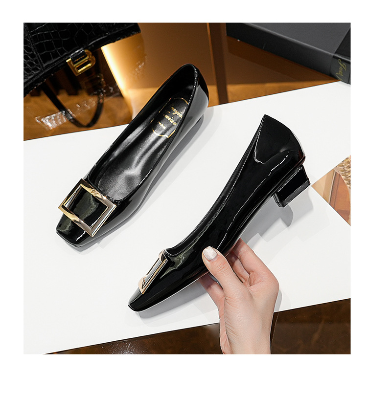 블랙 스퀘어 버클 두꺼운 굽 여성용 신발 2024 여성 신발 코끼리 그레이 래커 가죽 하이힐 스퀘어 토 얕은 굽 2024 신상스토어 가기