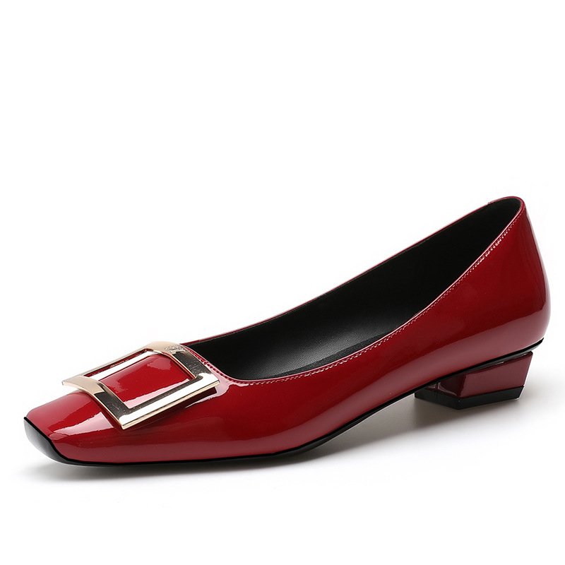 블랙 스퀘어 버클 두꺼운 굽 여성용 신발 2024 여성 신발 코끼리 그레이 래커 가죽 하이힐 스퀘어 토 얕은 굽 2024 신상
