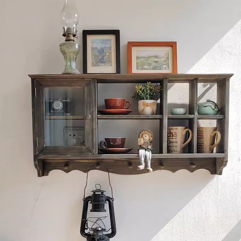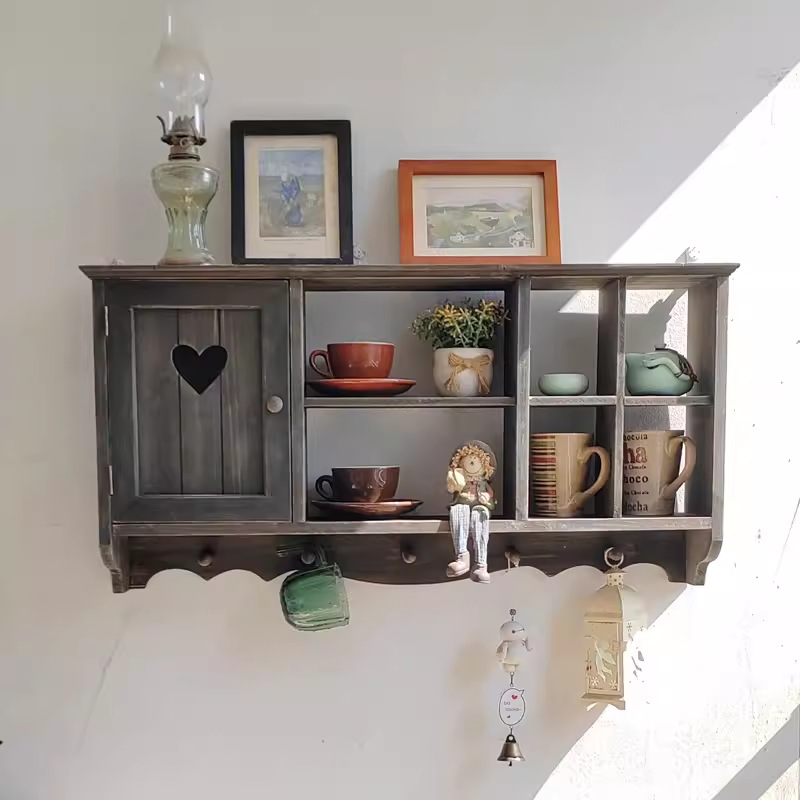 단단한 나무 빈티지 저장 벽 랙 컵 차 세트 테이블 사이드 선반 벽 장식 창조적 인 벽 교수형 캐비닛