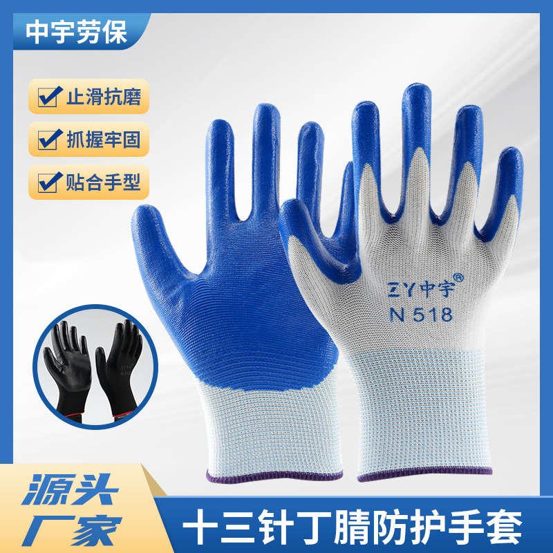 13 핀 니트릴 장갑을 두껍게 한 고무 담근 고무 매달려 미끄럼 방지 내유성 방수 작업장 노동 보호 장갑