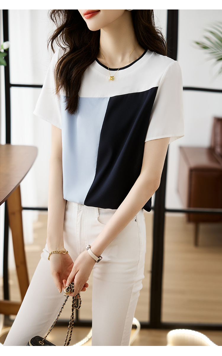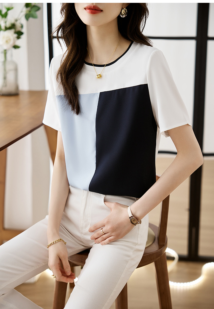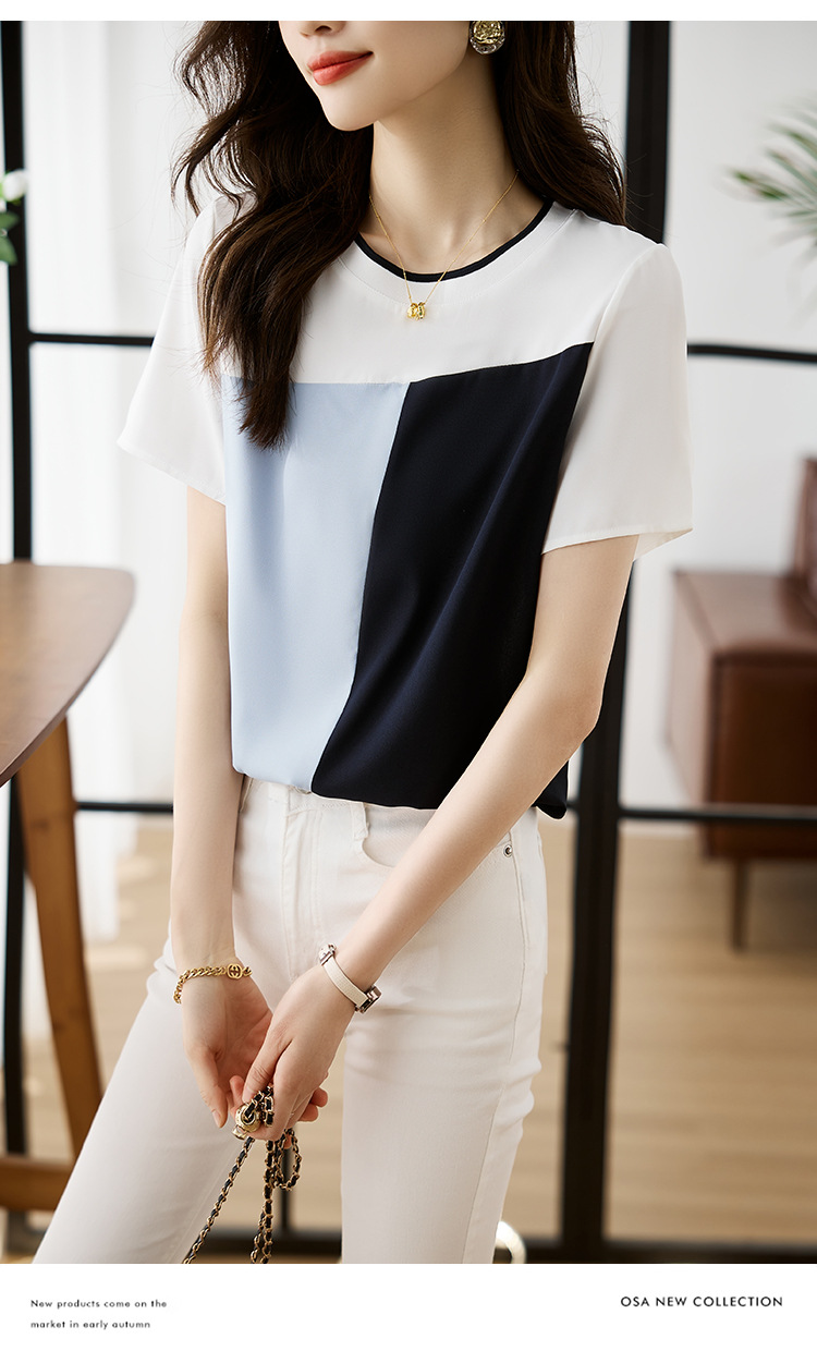 디자인 센스 니치 시폰 바느질 반팔 우아한 캐주얼 여성 여름 새로운 느슨한 올 매치 라운드 넥 티셔츠