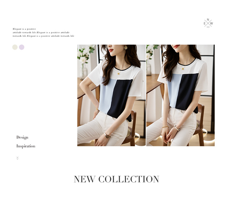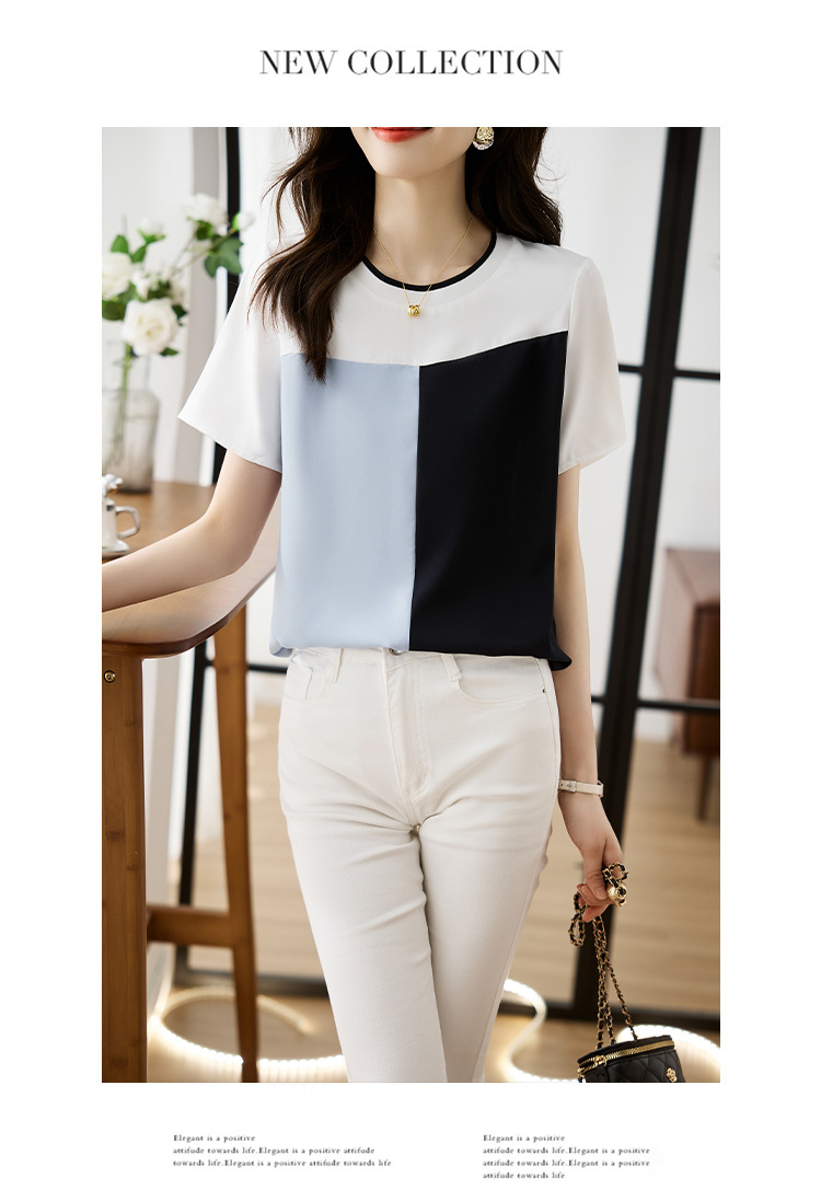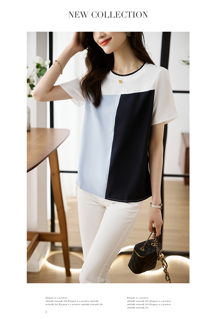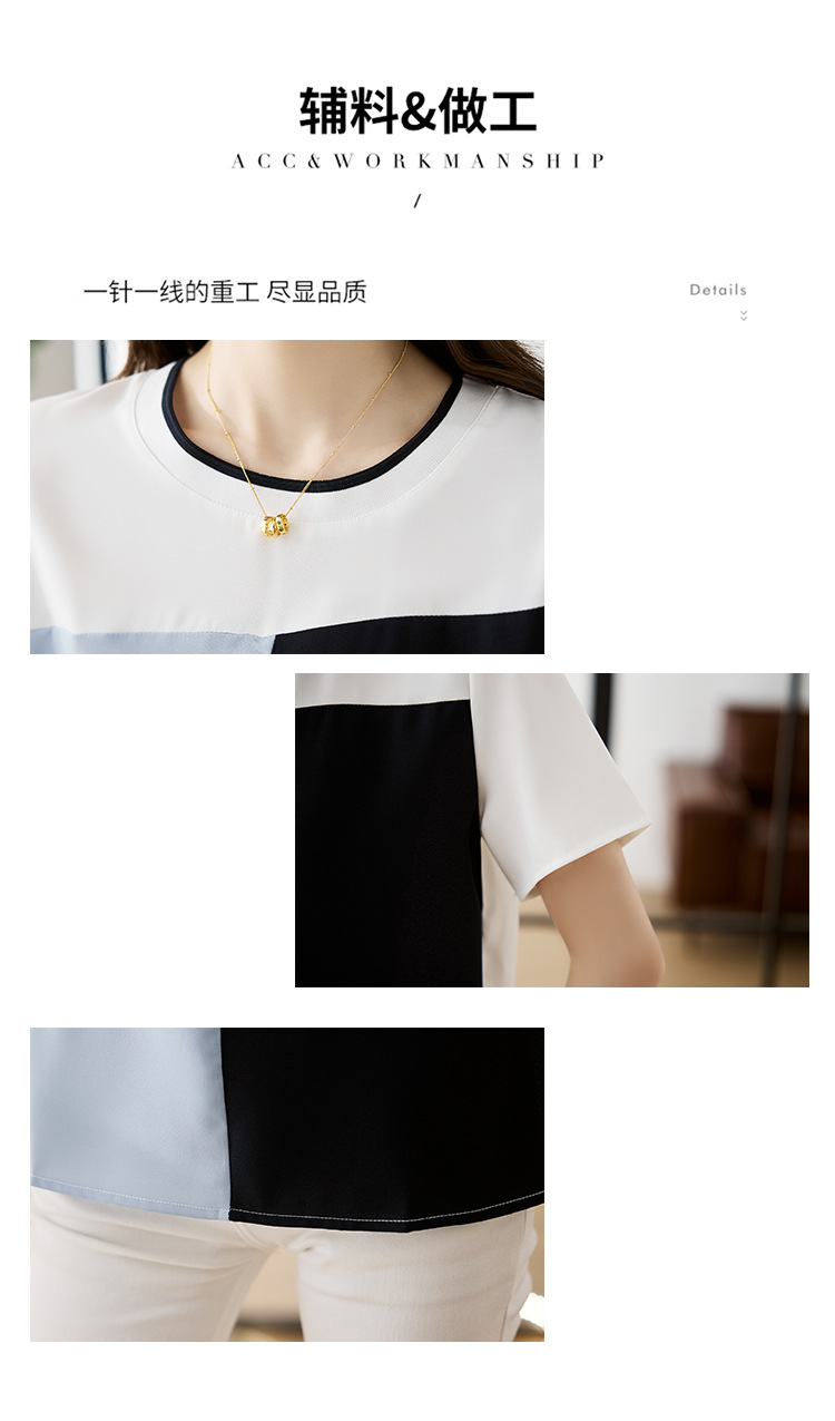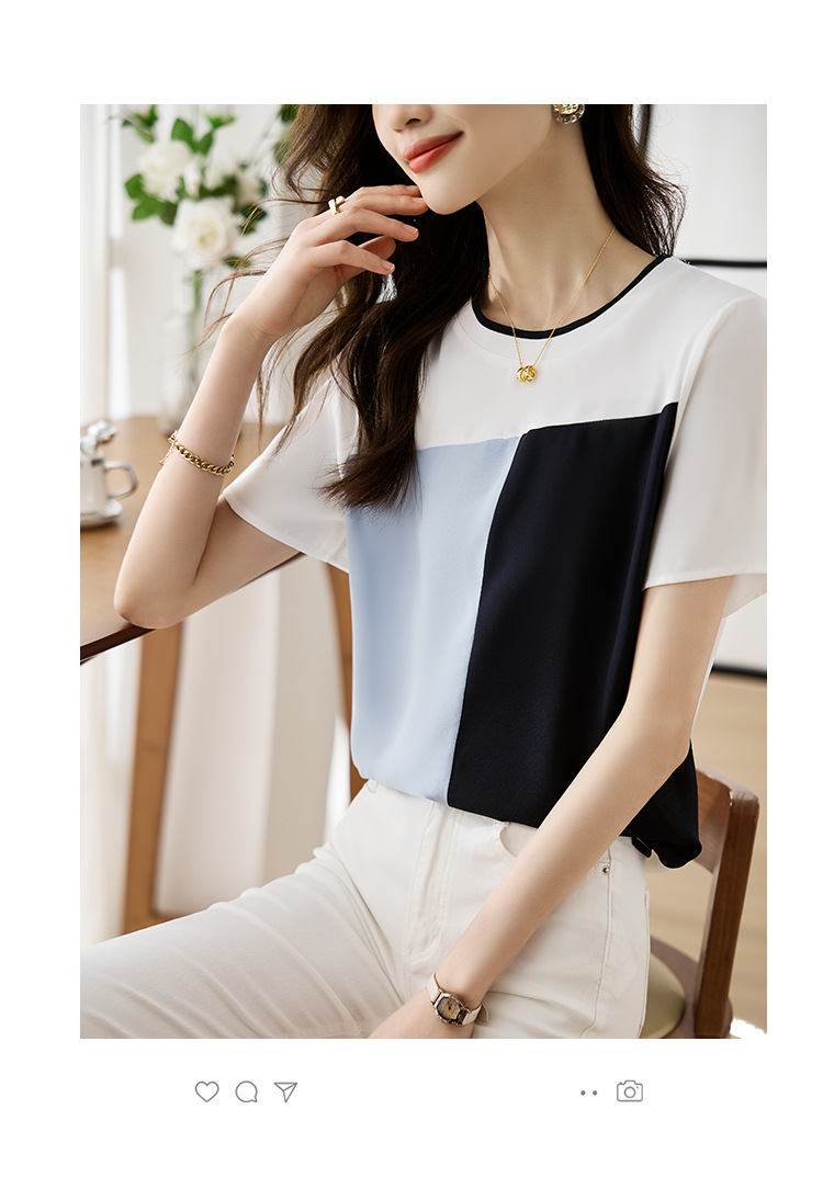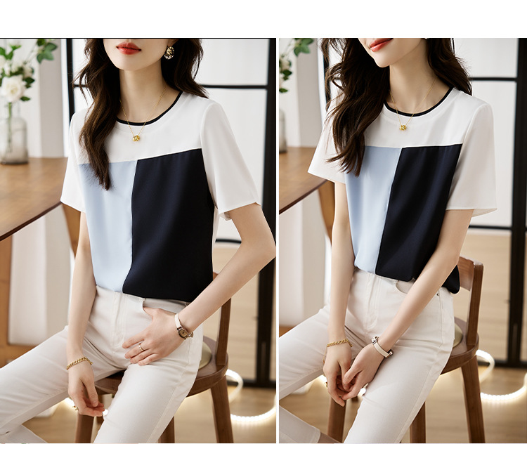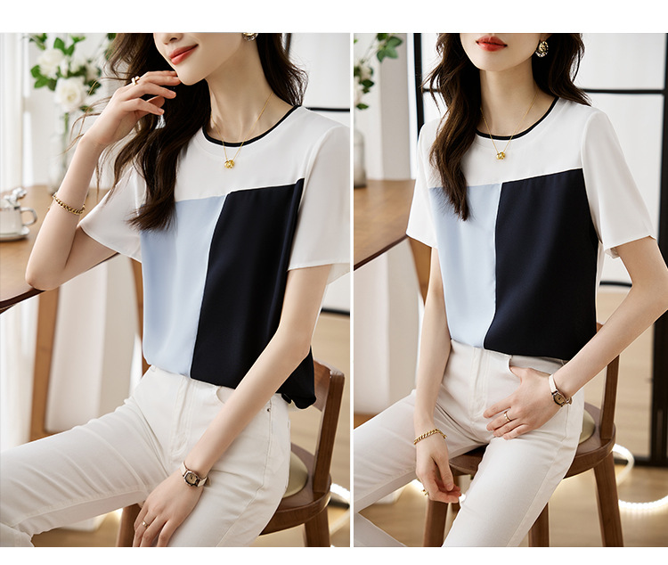 디자인 센스 니치 시폰 바느질 반팔 우아한 캐주얼 여성 여름 새로운 느슨한 올 매치 라운드 넥 티셔츠스토어 가기