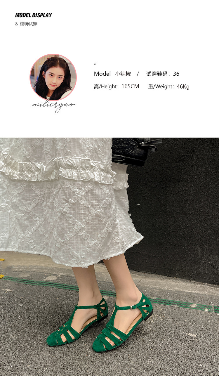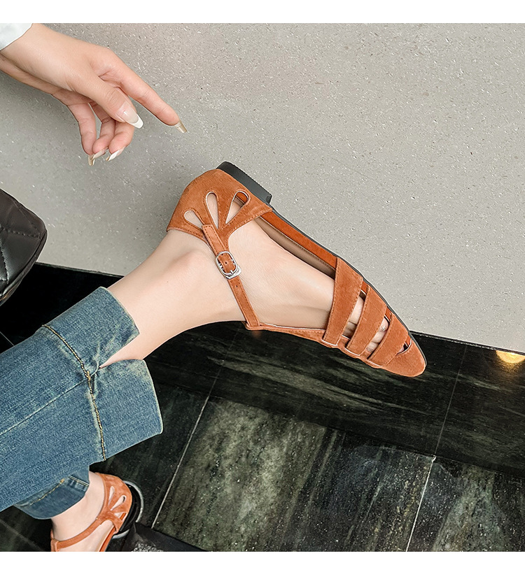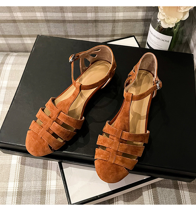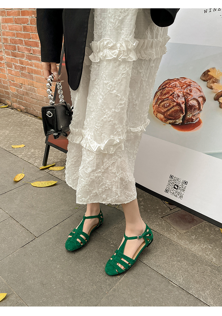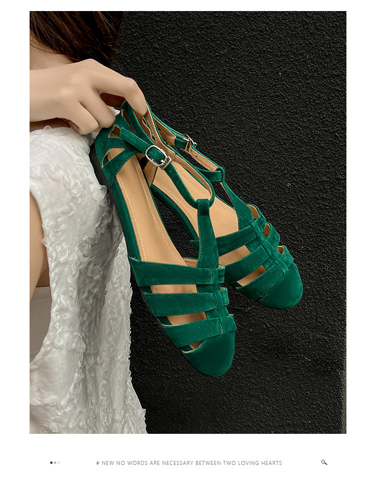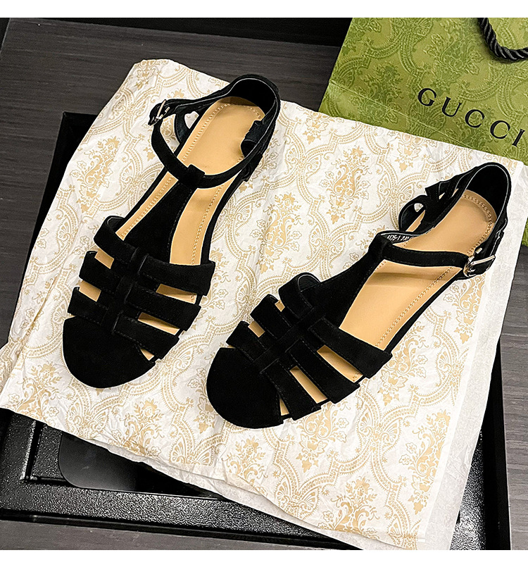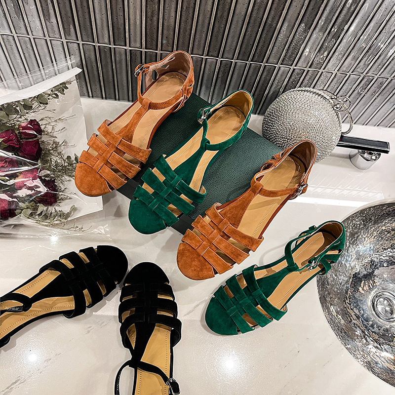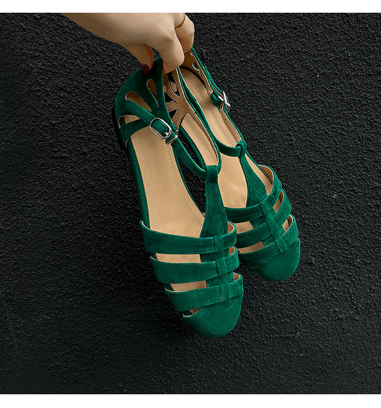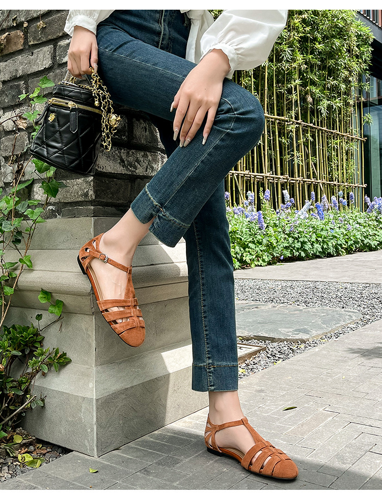 발가락 샌들 여성용 2024 년 여름 새로운 레트로 로마 스타일 할로우 가죽 버클 플랫 샌들 여성용