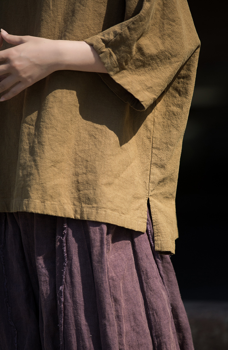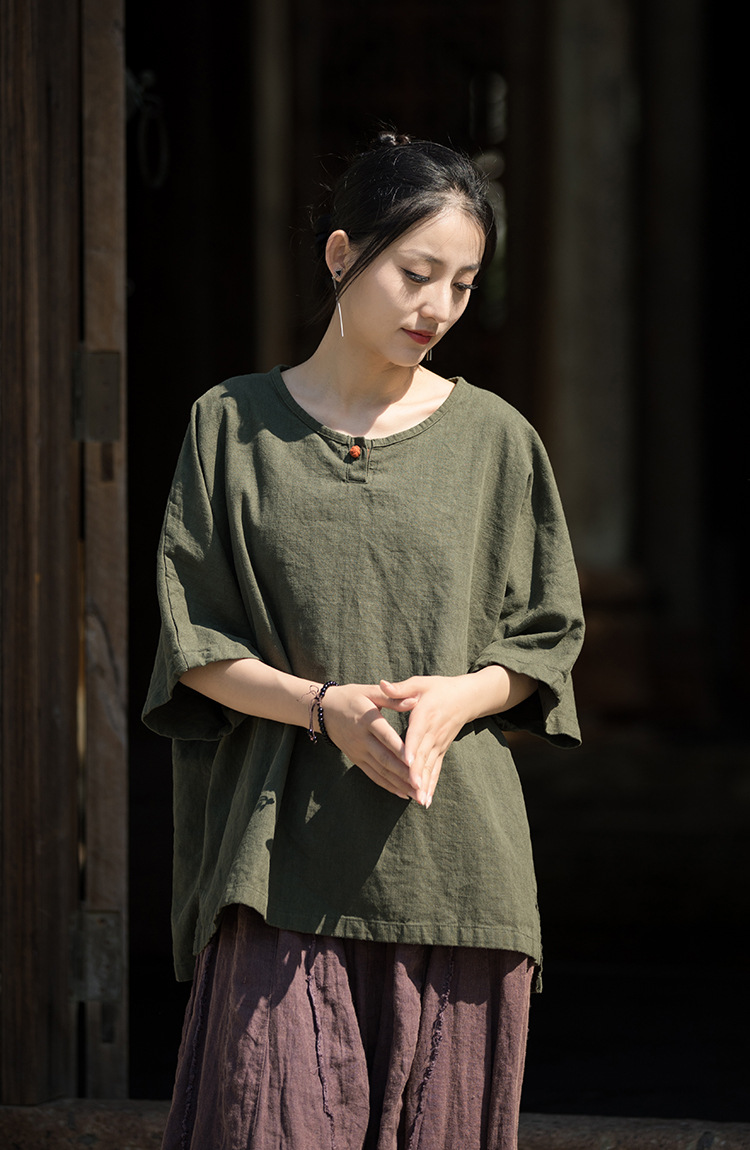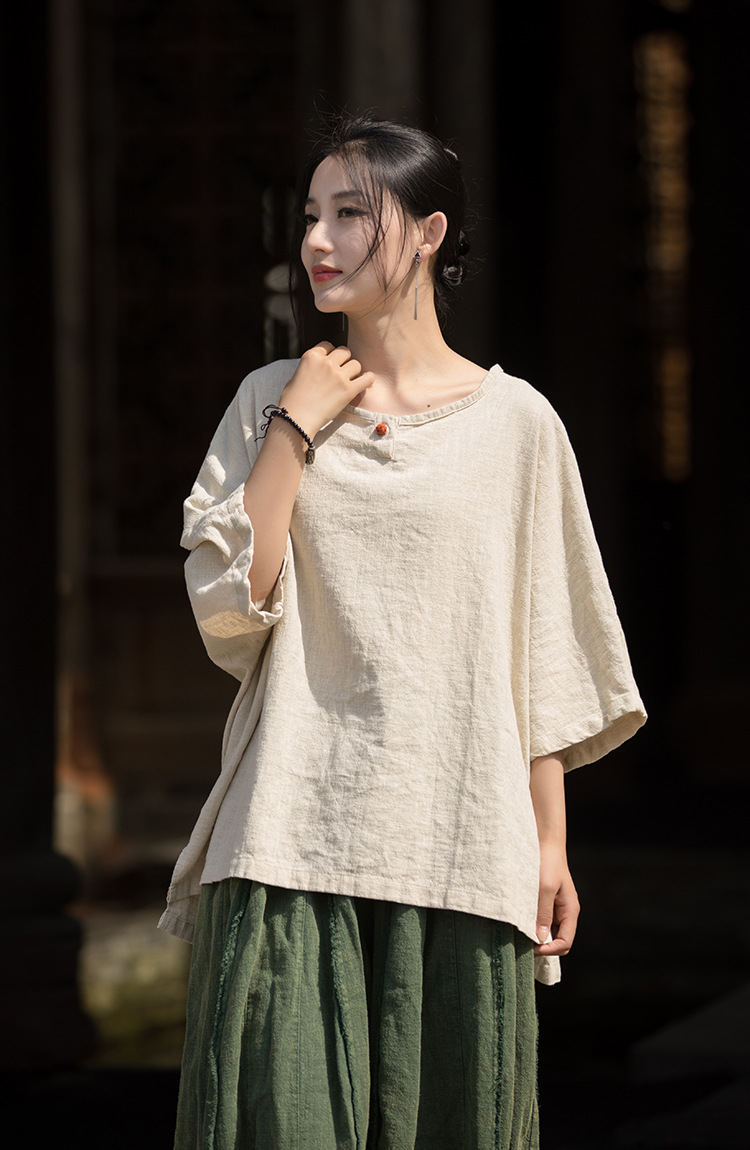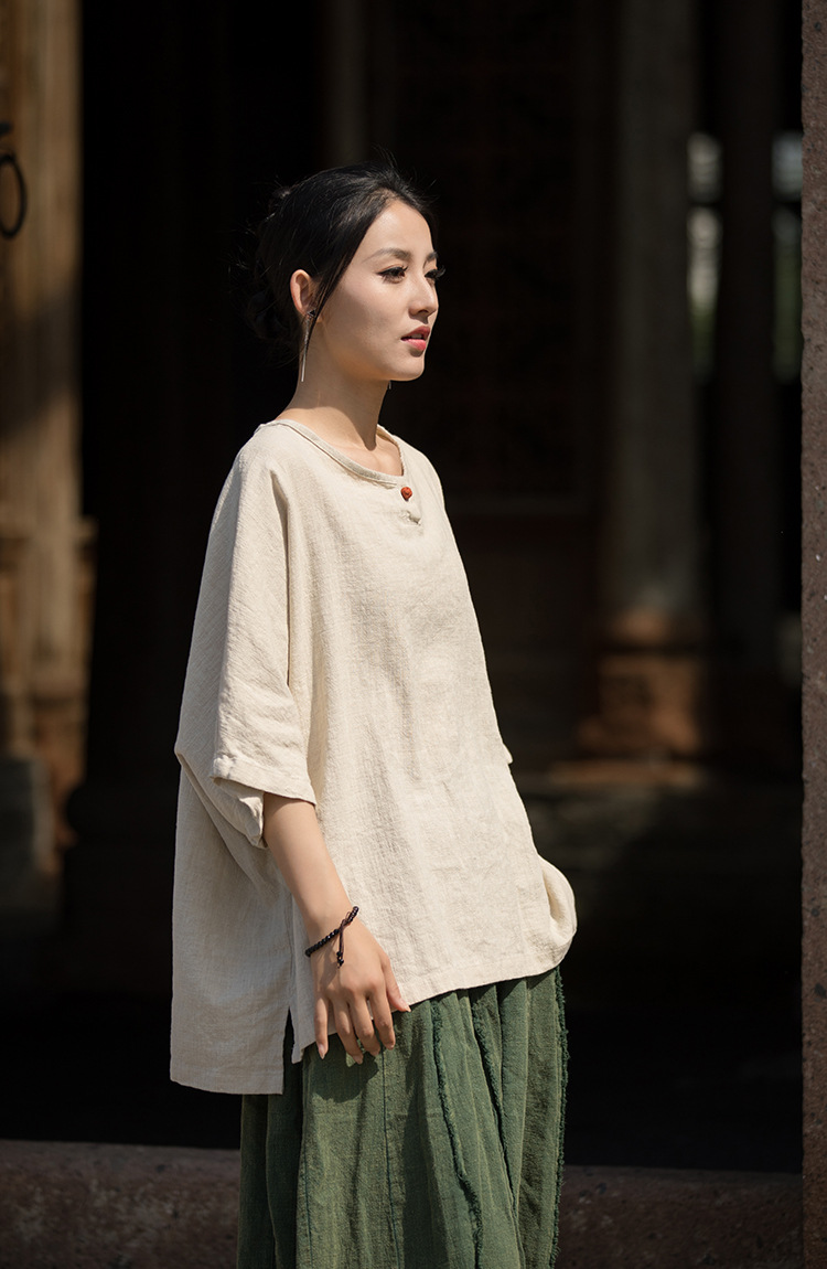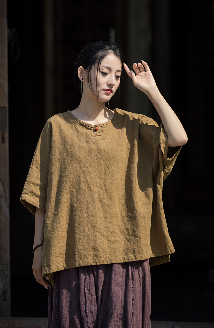 여름 면화와 리넨 여성 의류 새로운 원래 새로운 중국 스타일 수정 된 풀오버 라미 샌드 워시 버클 여성의 짧은 소매 티셔츠스토어 가기
