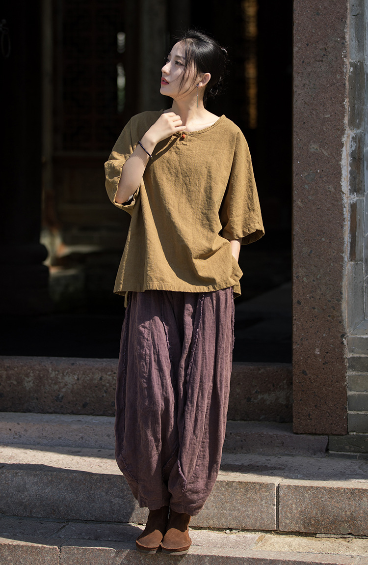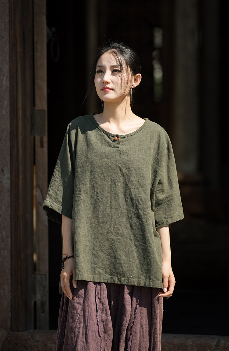 여름 면화와 리넨 여성 의류 새로운 원래 새로운 중국 스타일 수정 된 풀오버 라미 샌드 워시 버클 여성의 짧은 소매 티셔츠