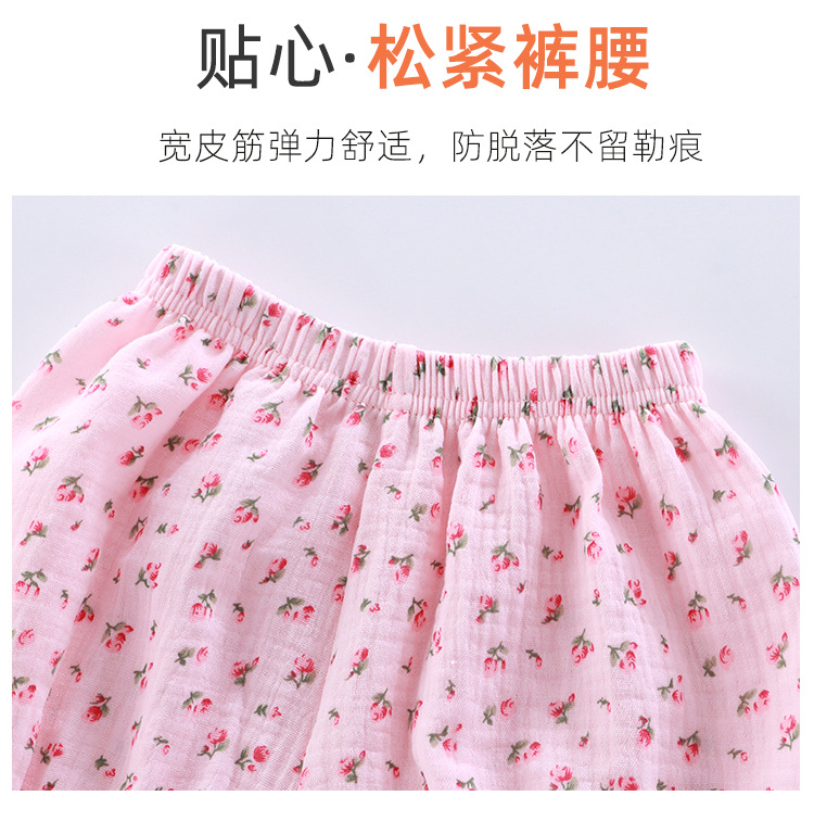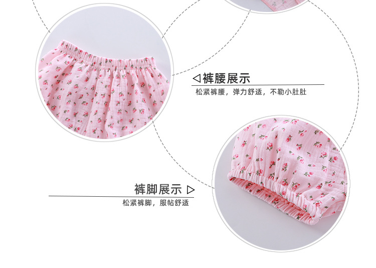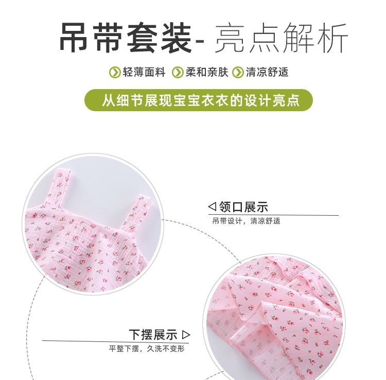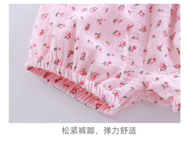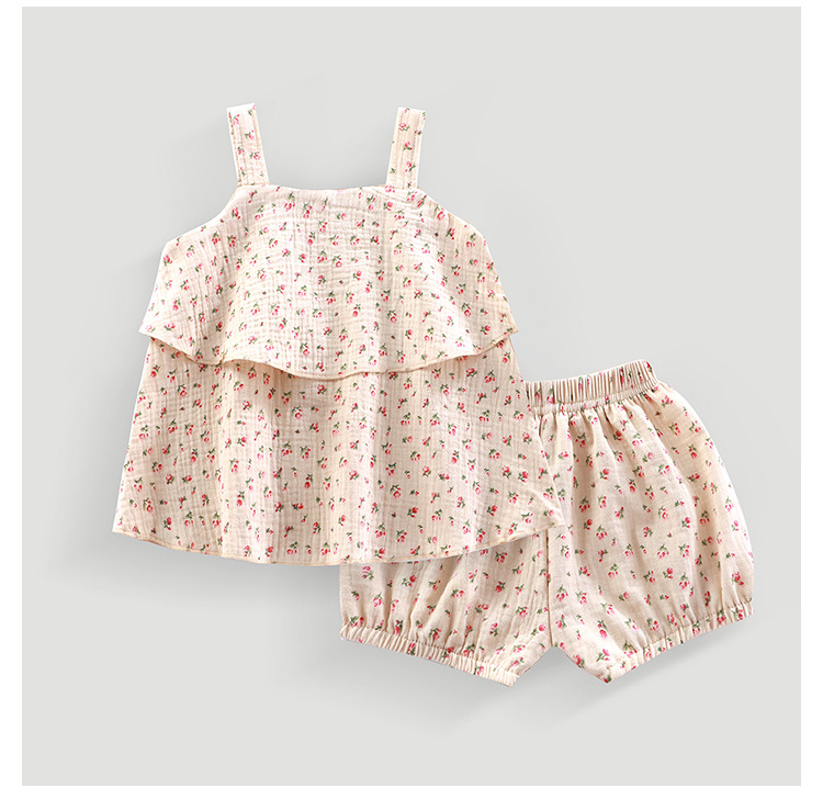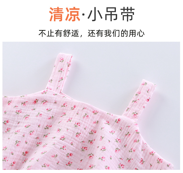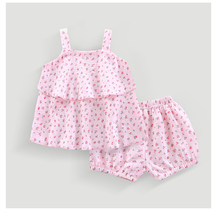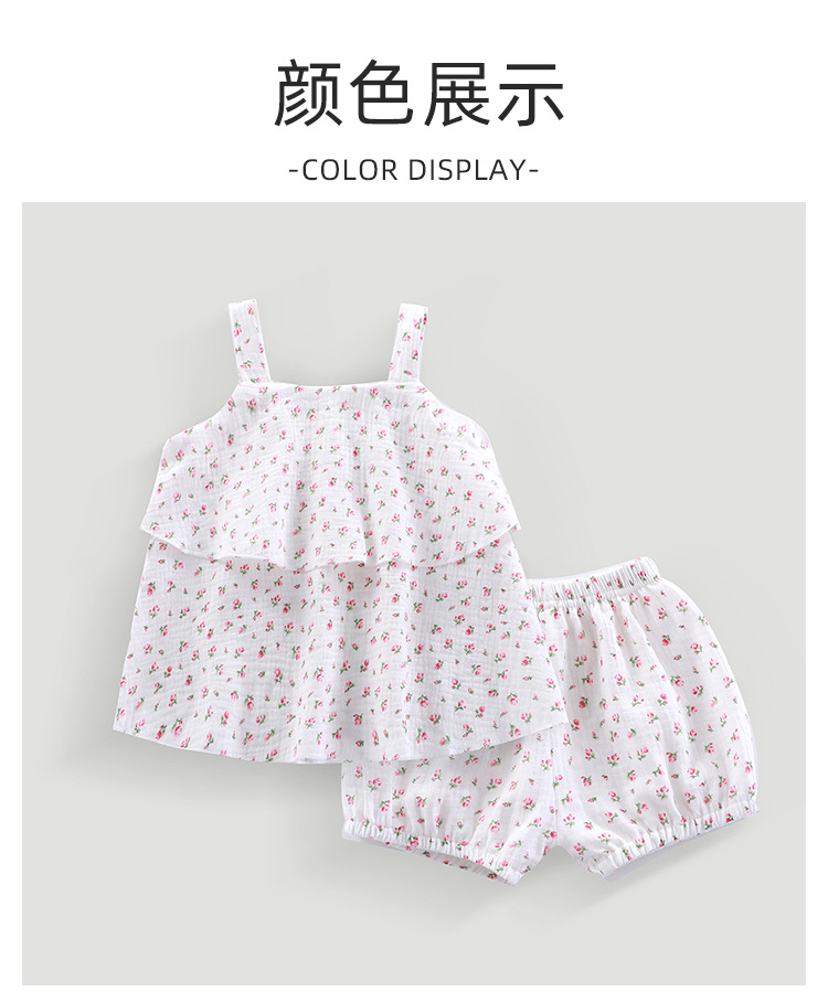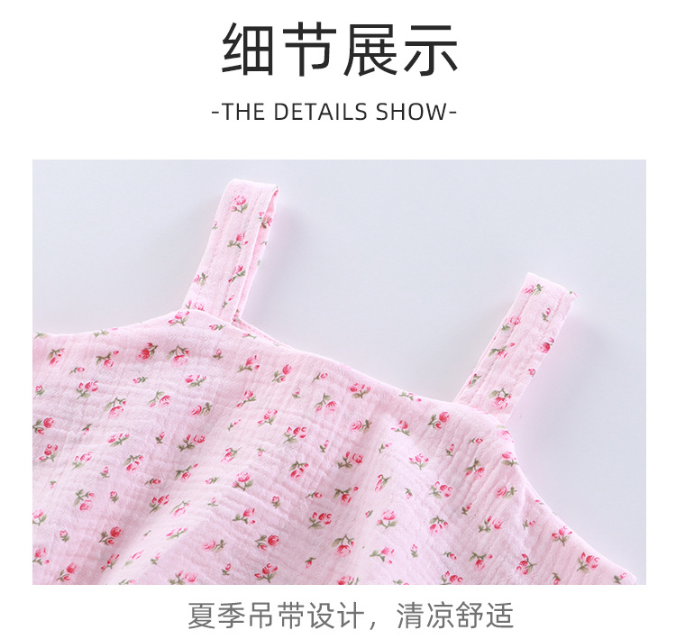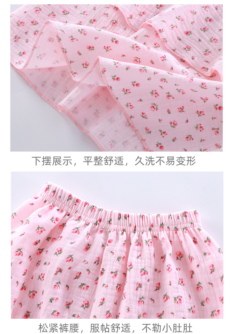어린이 여름 얇은 세트 꽃 민소매 더블 레이어 거즈 통기성 땀 흡수성 코튼 크루 넥 짧은 스커트 반바지 투피스 세트