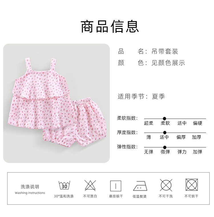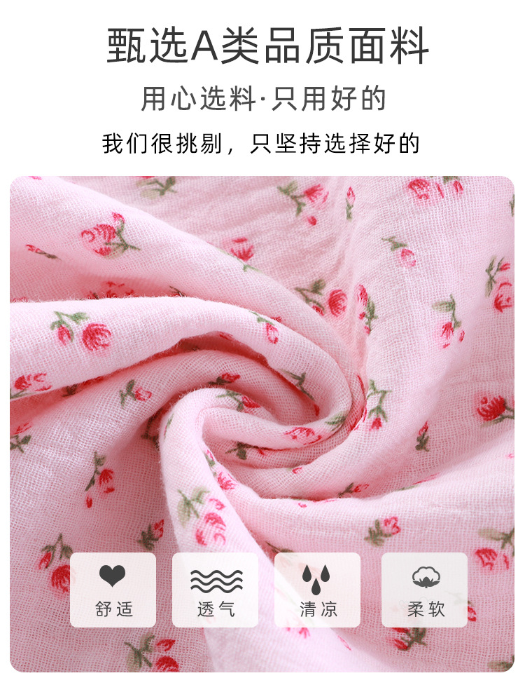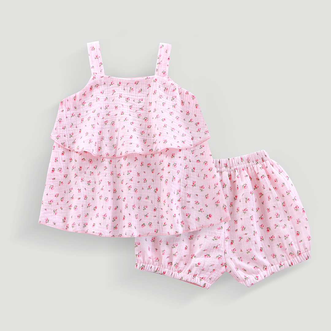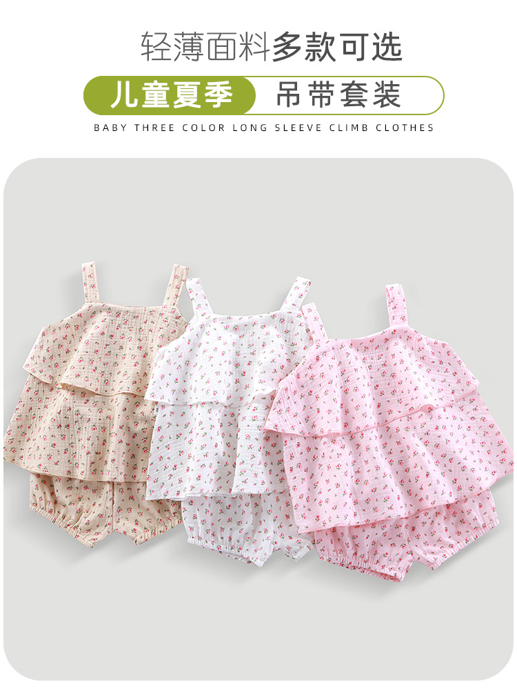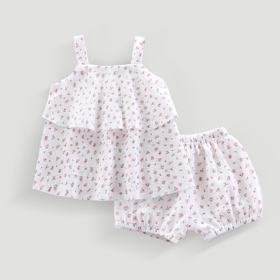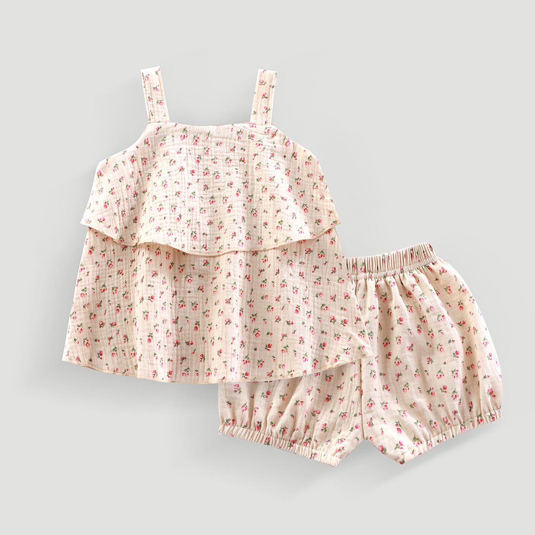어린이 여름 얇은 세트 꽃 민소매 더블 레이어 거즈 통기성 땀 흡수성 코튼 크루 넥 짧은 스커트 반바지 투피스 세트