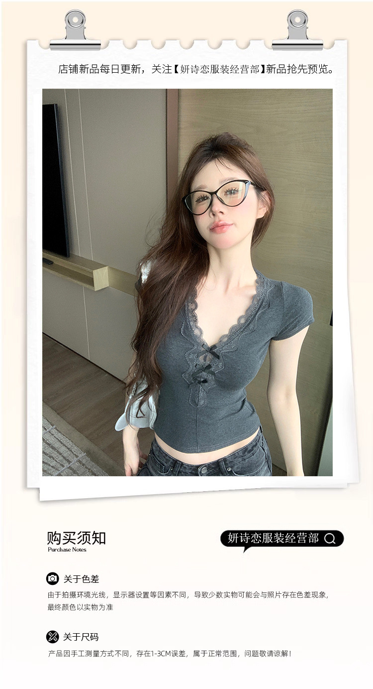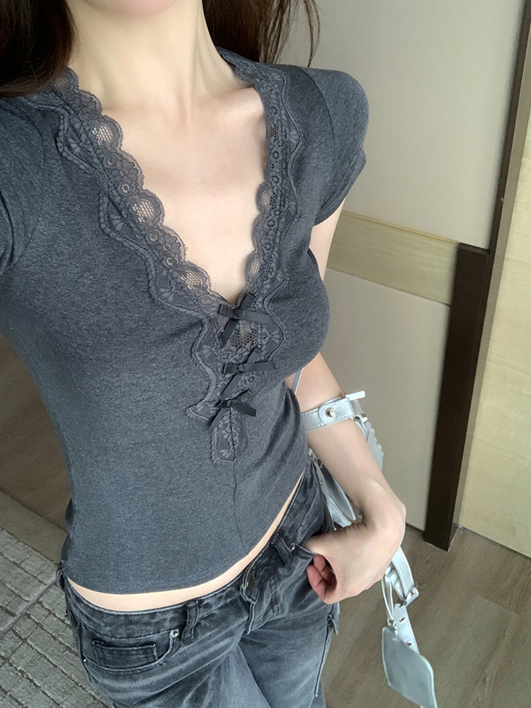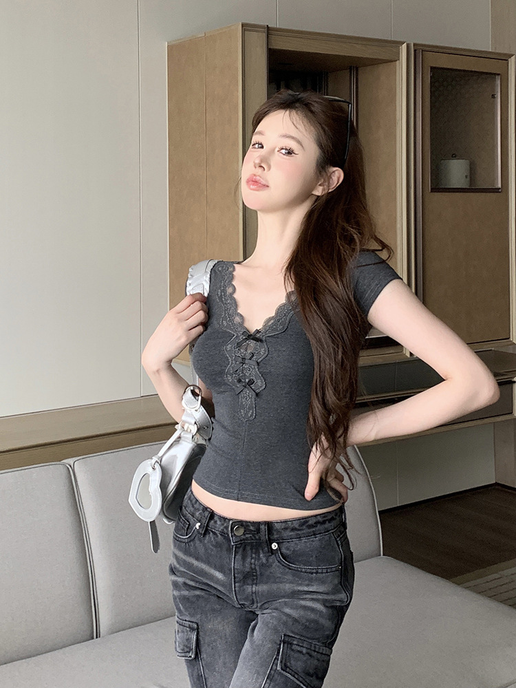 활 그레이 V 넥 반팔 티셔츠 여성용 여름 슬림 핏 슬리밍 스파이스 걸 레이스 스티칭 틈새 쇼트 탑스토어 가기