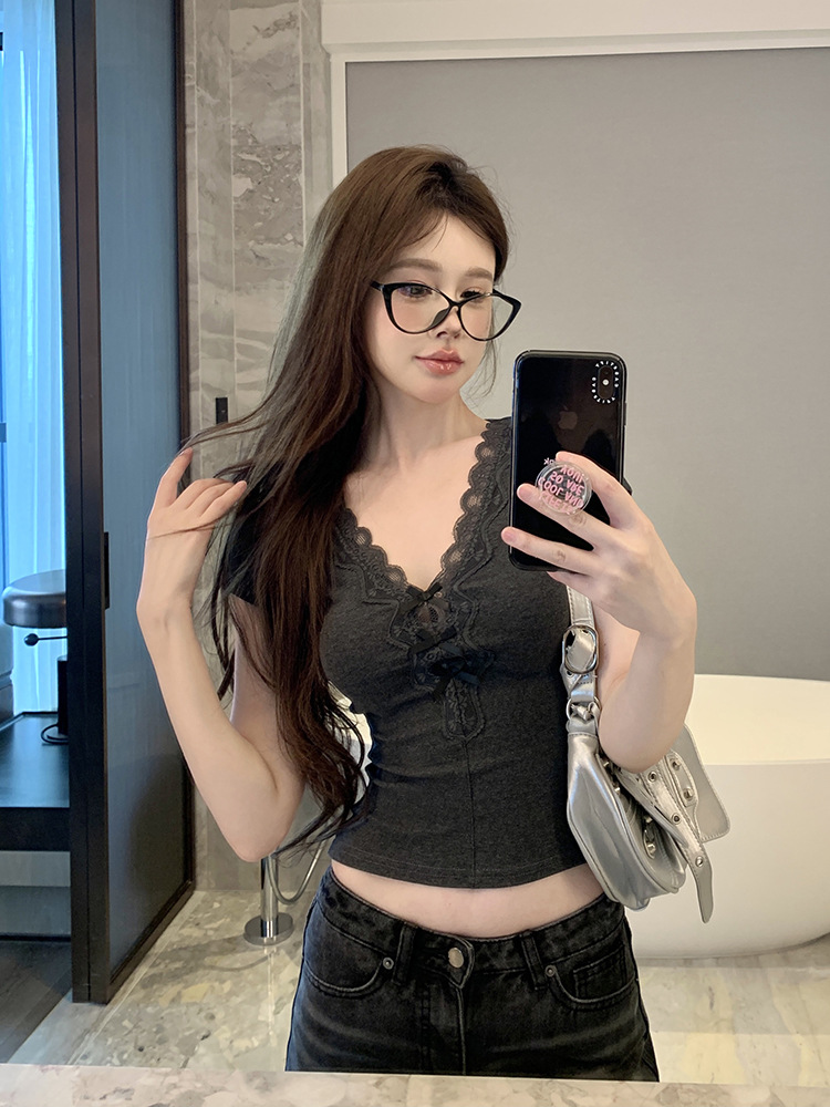 활 그레이 V 넥 반팔 티셔츠 여성용 여름 슬림 핏 슬리밍 스파이스 걸 레이스 스티칭 틈새 쇼트 탑