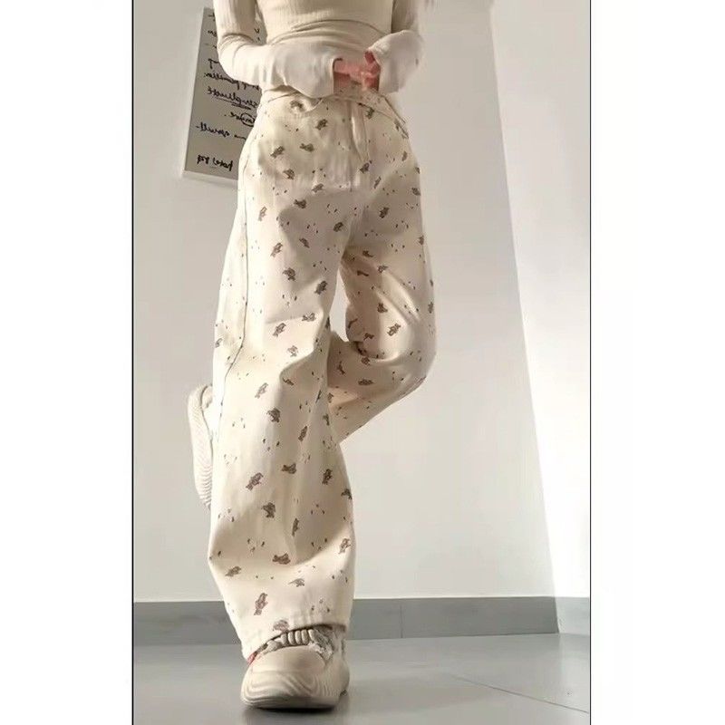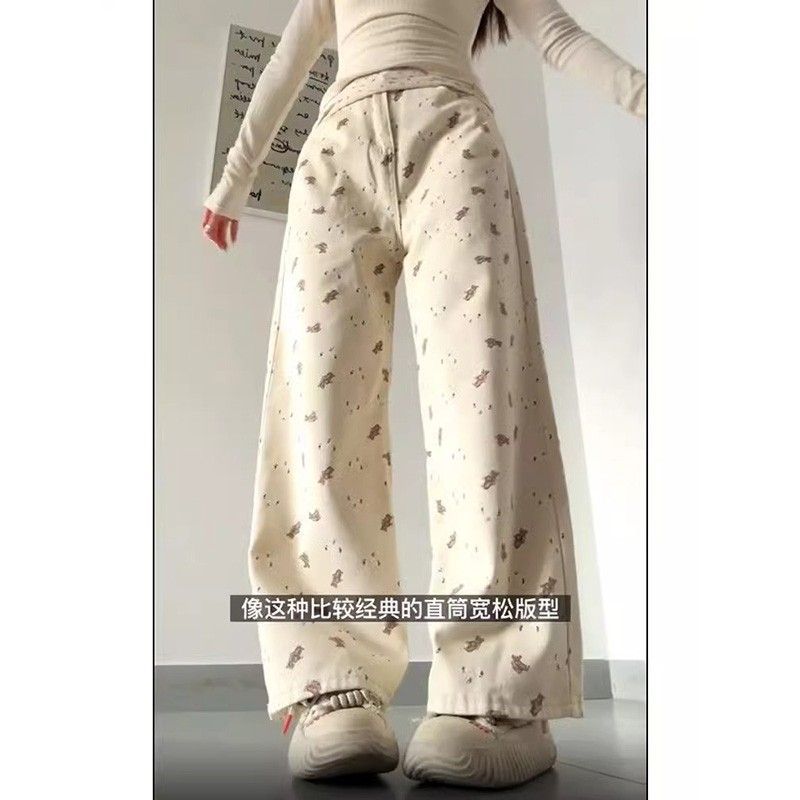 곰 인쇄 느슨한 청바지 여성의 여름 새로운 틈새 직선 바지 높은 허리 넓은 다리 유행 바지스토어 가기