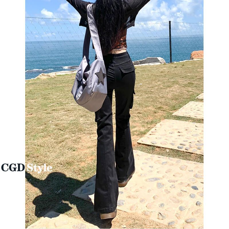 2024 봄과 가을 레트로 높은 허리 뿔 청바지 블랙 올 매치 세련된 디자인 새로운 슬림 핏 스파클 바지스토어 가기