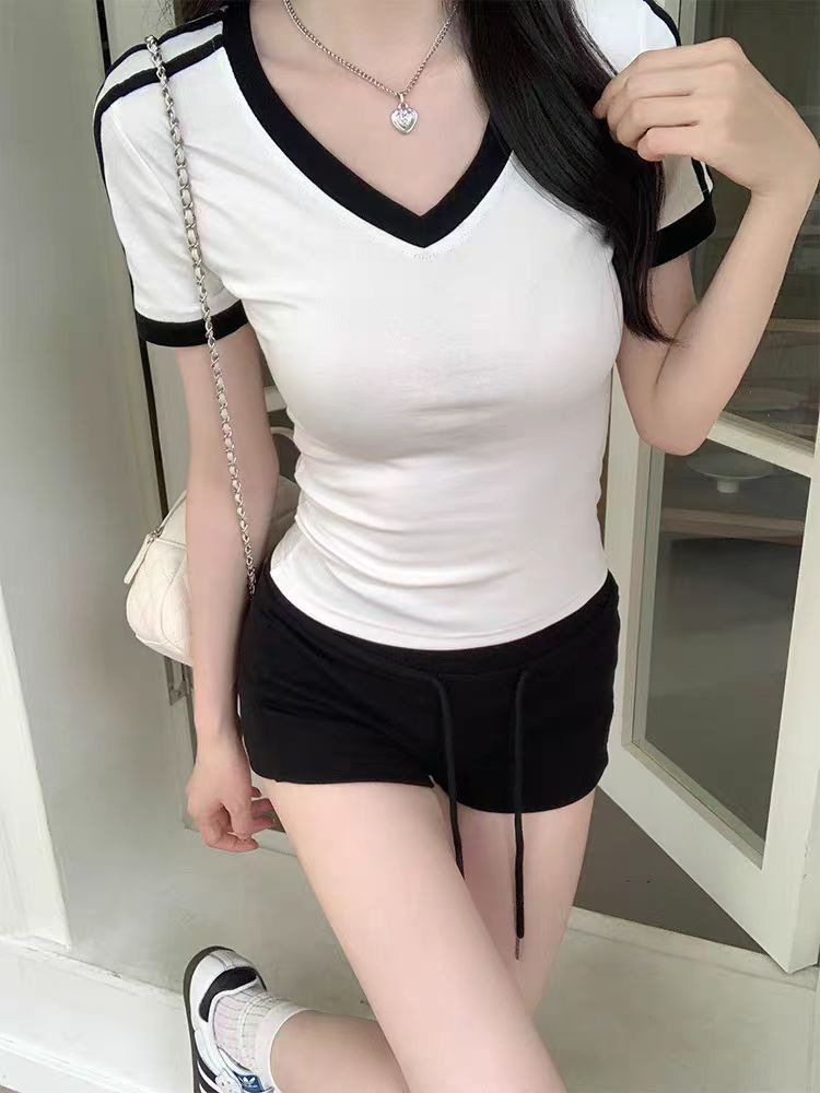 명암 V 넥 반팔 티셔츠 여성용 2024 년 여름 새로운 퓨어 스파이스 걸스 슬림핏 타이트한 세련된 어깨 탑