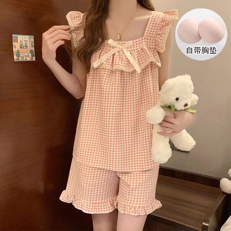 여자 파자마 가슴 패드 여름 폭발 작은 비행 소매 공주 스타일 Ins 달콤한 기숙사 사이버 연예인 홈 의류 세트 여성