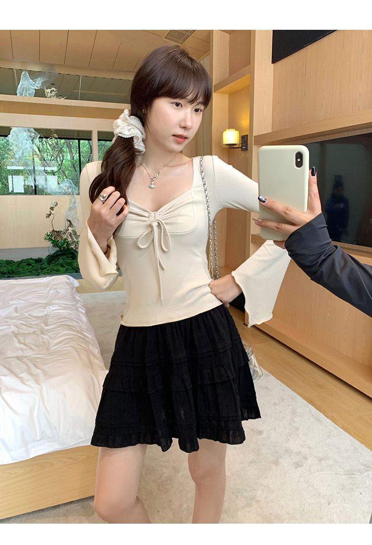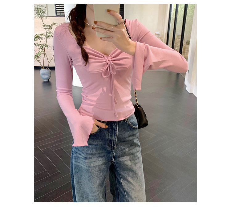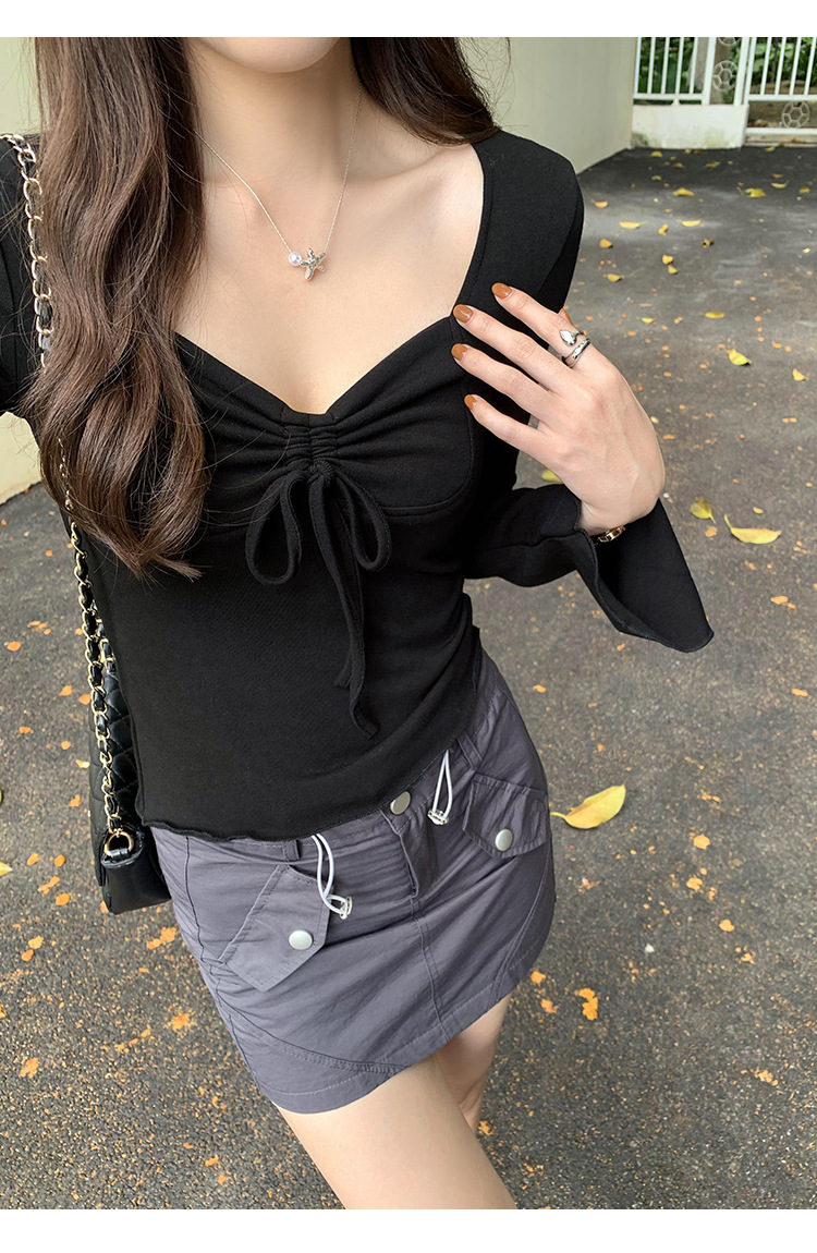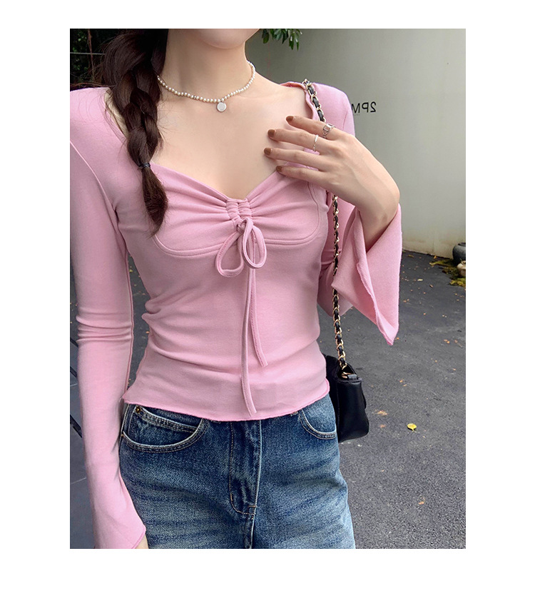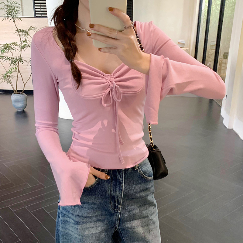 디자인 센스 스퀘어 칼라 칼라 보우 플리츠 레이스 업 티셔츠 여성용 여름 세련된 이너 혼 긴팔 탑