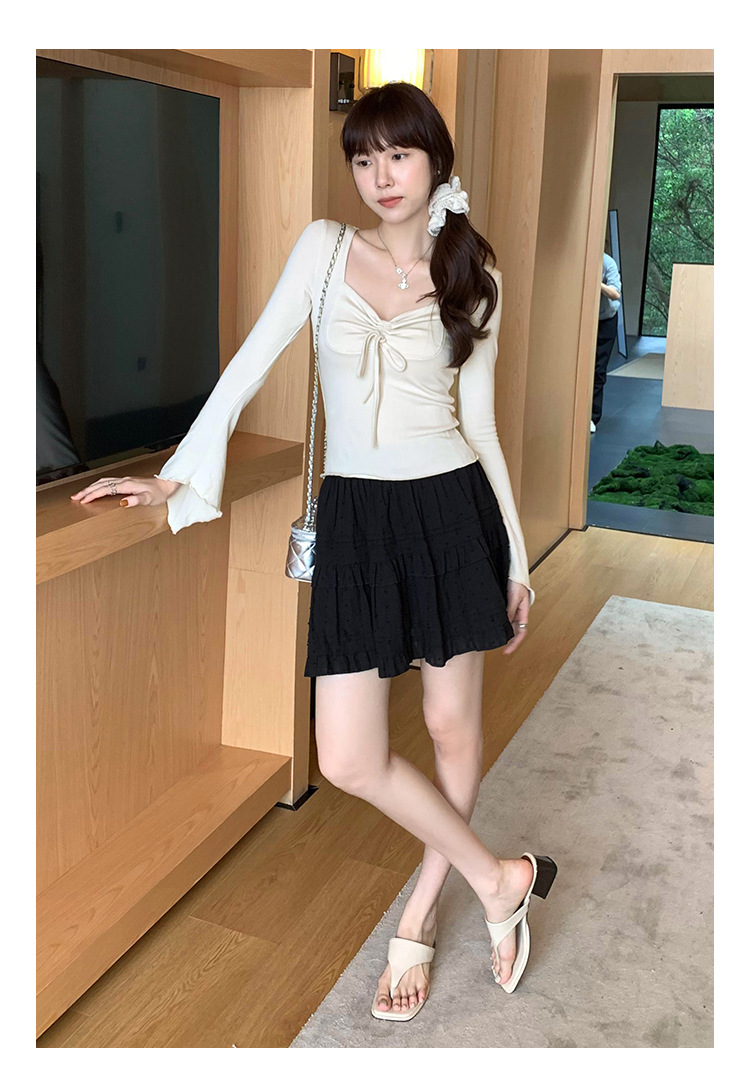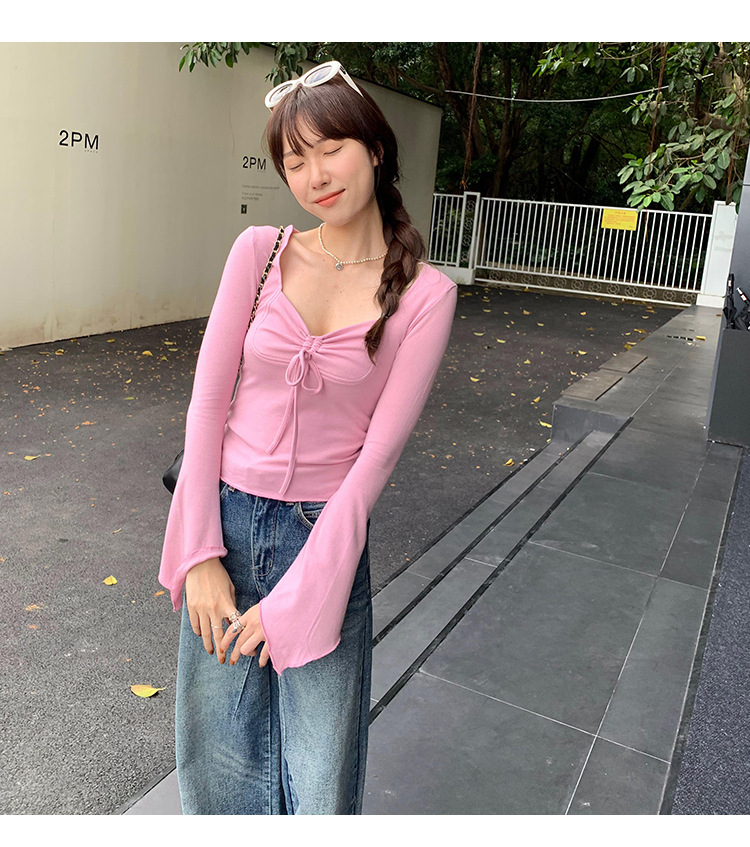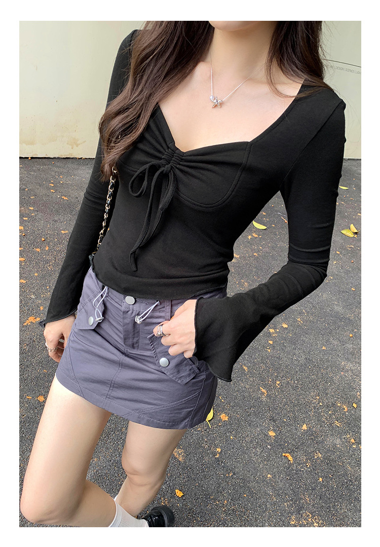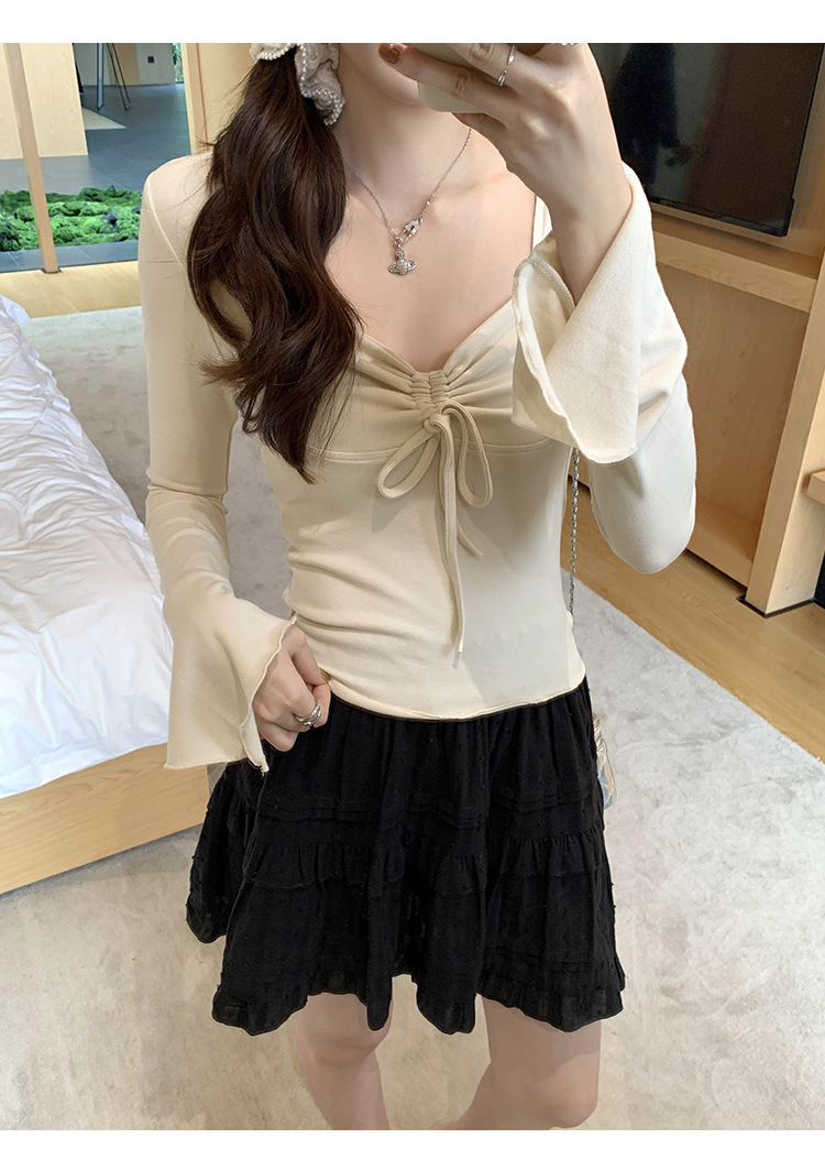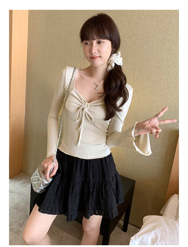 디자인 센스 스퀘어 칼라 칼라 보우 플리츠 레이스 업 티셔츠 여성용 여름 세련된 이너 혼 긴팔 탑