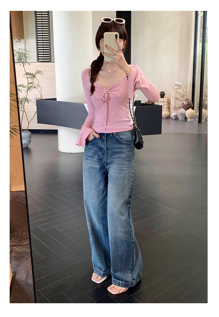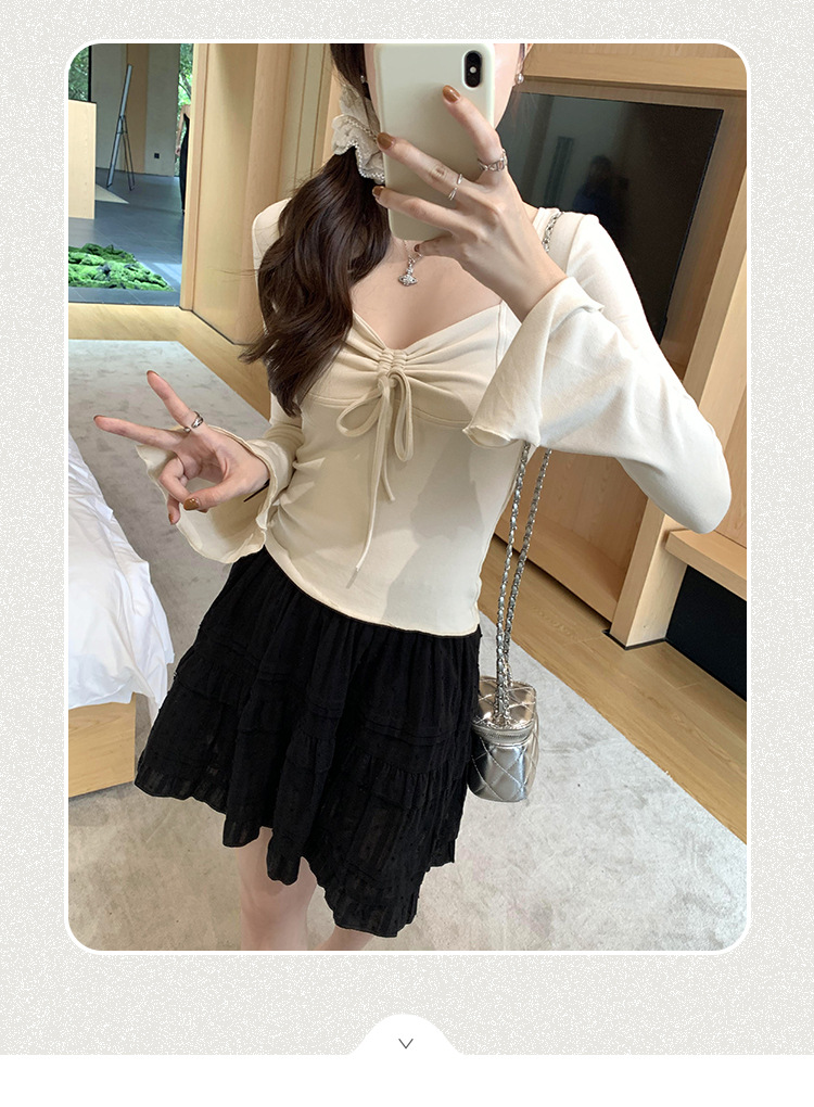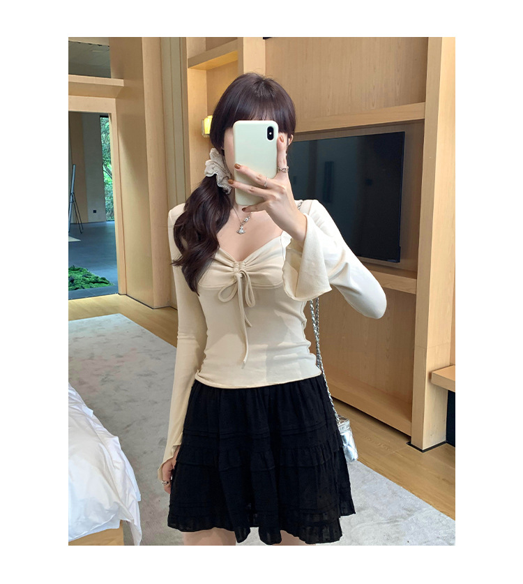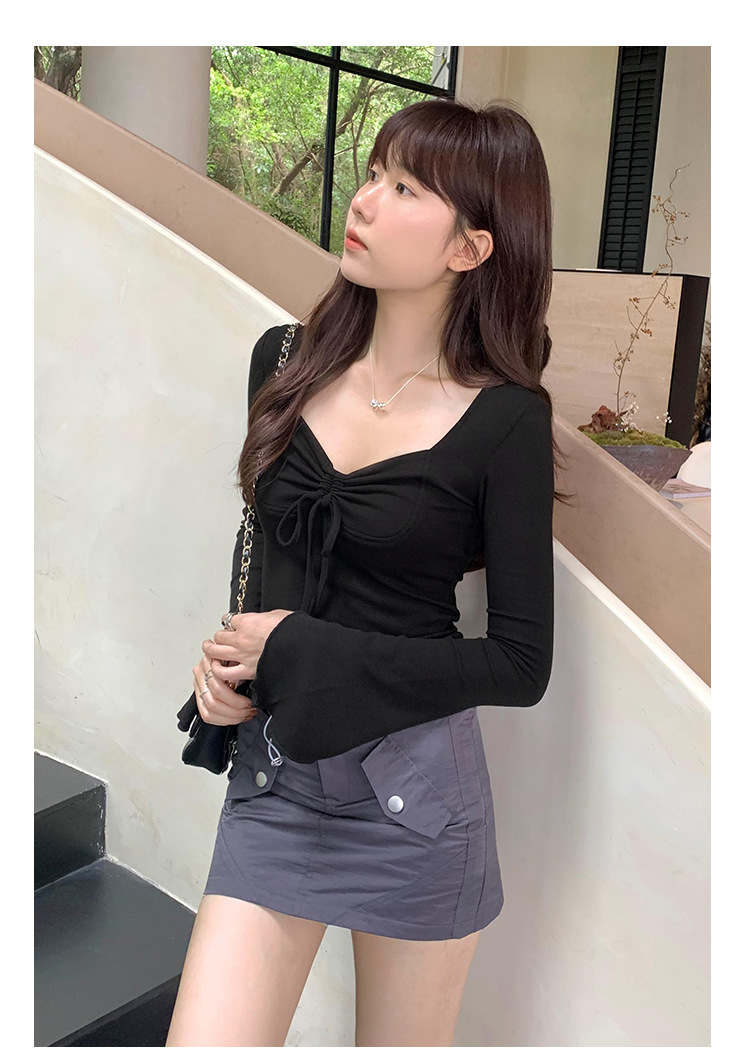 디자인 센스 스퀘어 칼라 칼라 보우 플리츠 레이스 업 티셔츠 여성용 여름 세련된 이너 혼 긴팔 탑스토어 가기