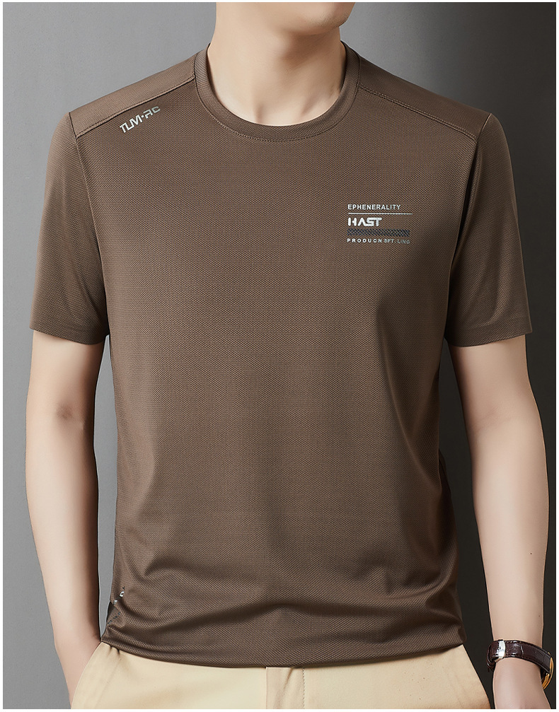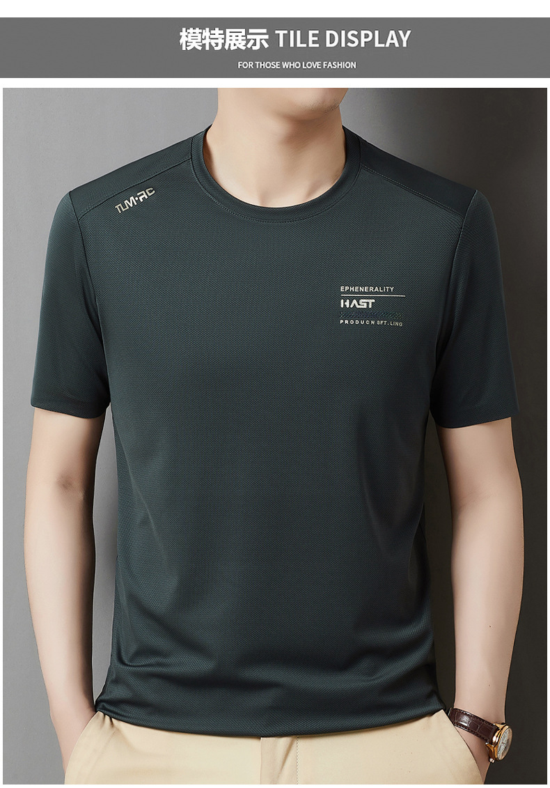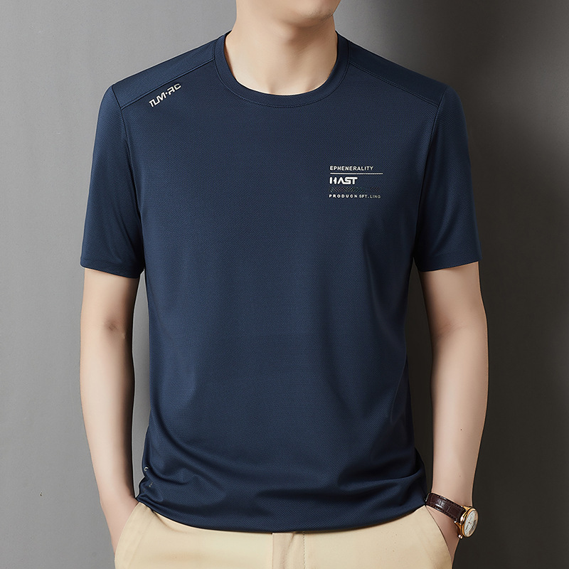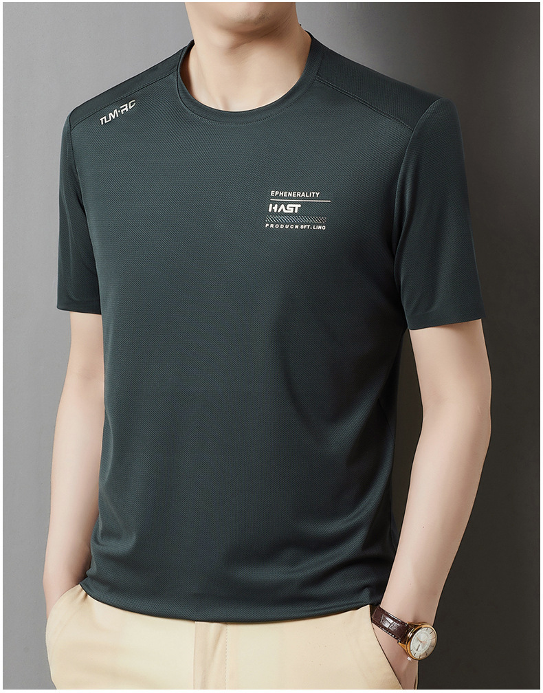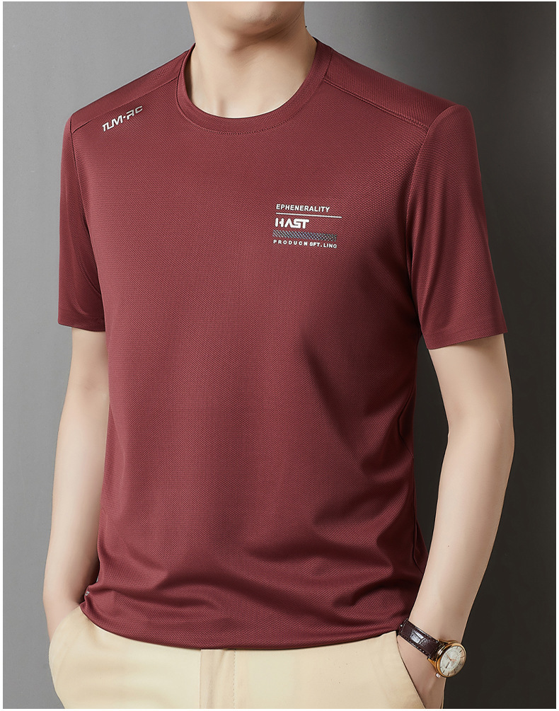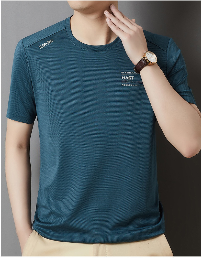 冰丝短袖T恤男士夏季圆领休闲印花上衣薄款弹力简约半袖体恤衫男