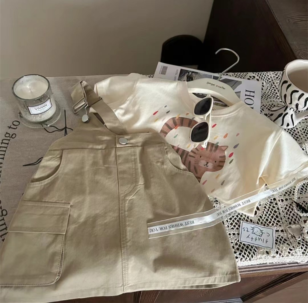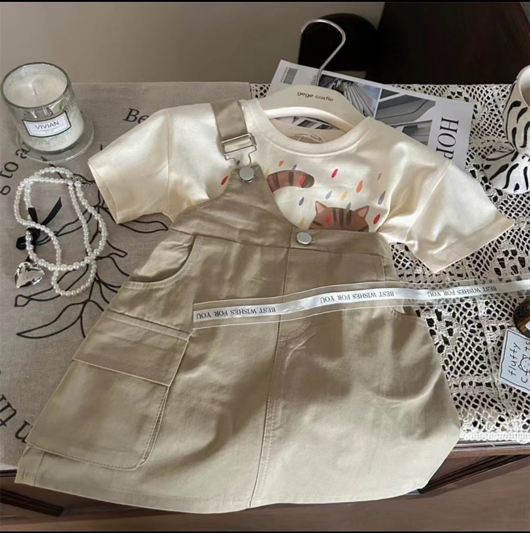 한국 아동복 2025 새로운 여름 소녀 만화 새끼 고양이 티셔츠 어린이 서양식 원 숄더 스트랩 스커트 투피스 세트
