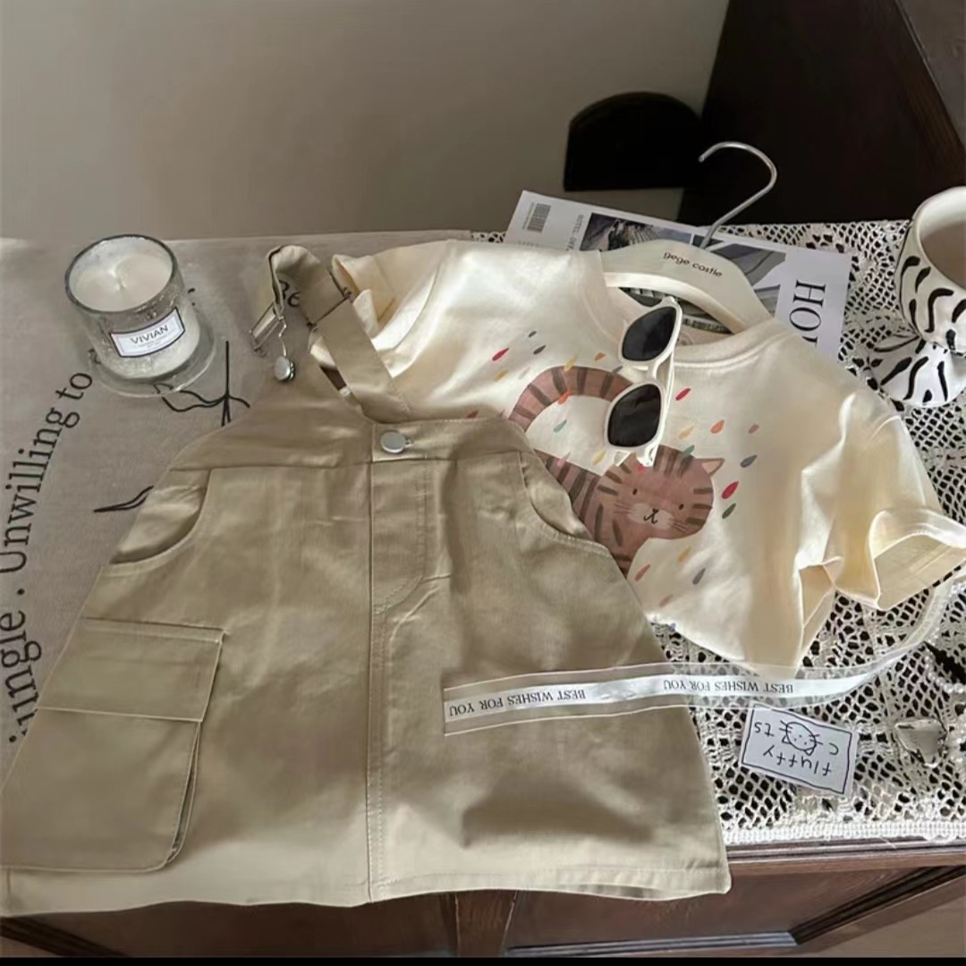 한국 아동복 2025 새로운 여름 소녀 만화 새끼 고양이 티셔츠 어린이 서양식 원 숄더 스트랩 스커트 투피스 세트스토어 가기
