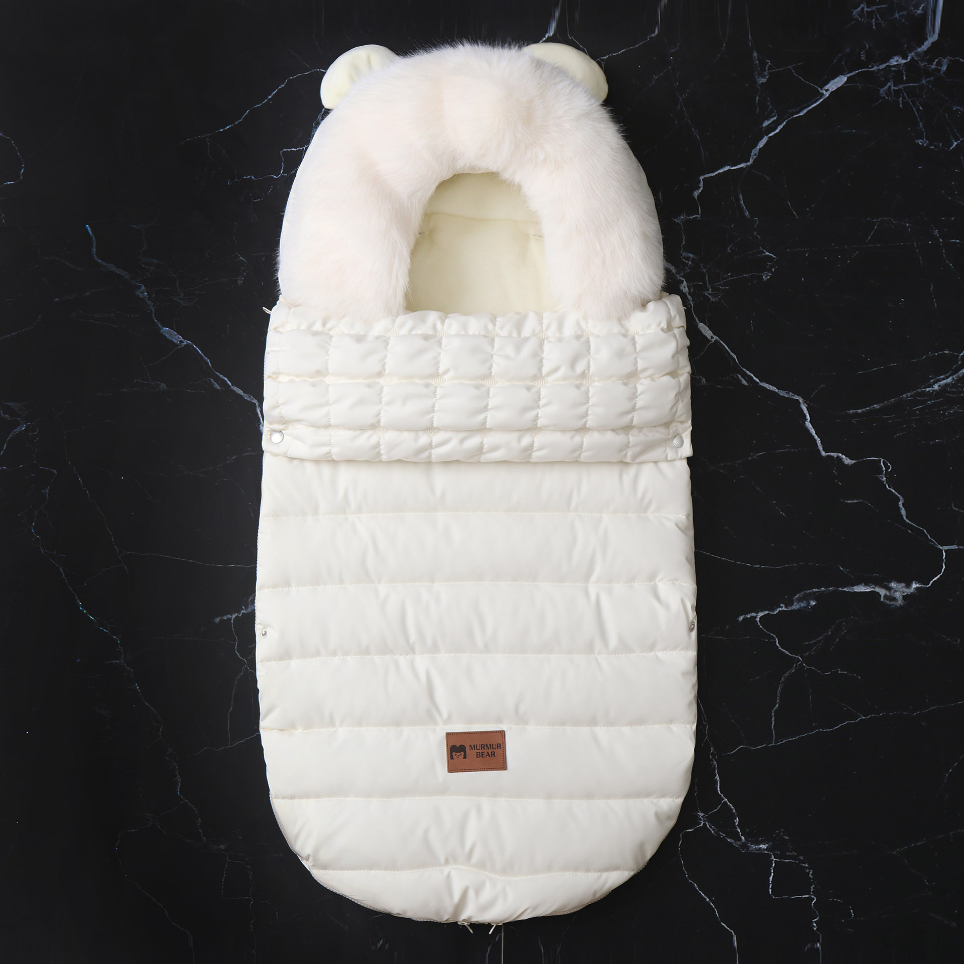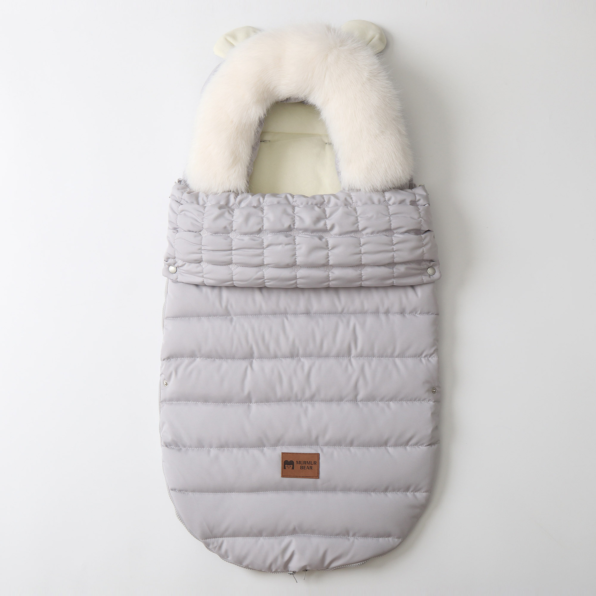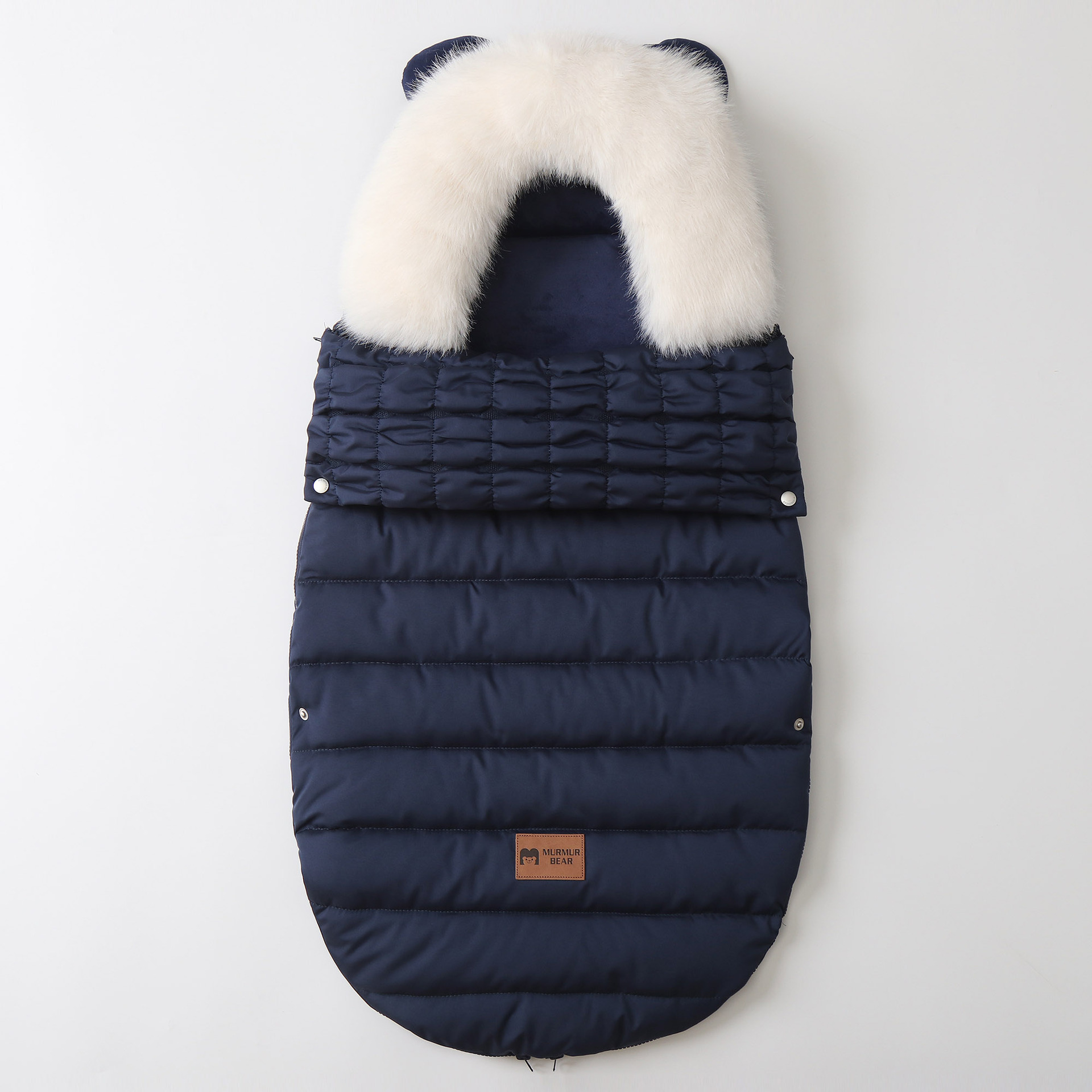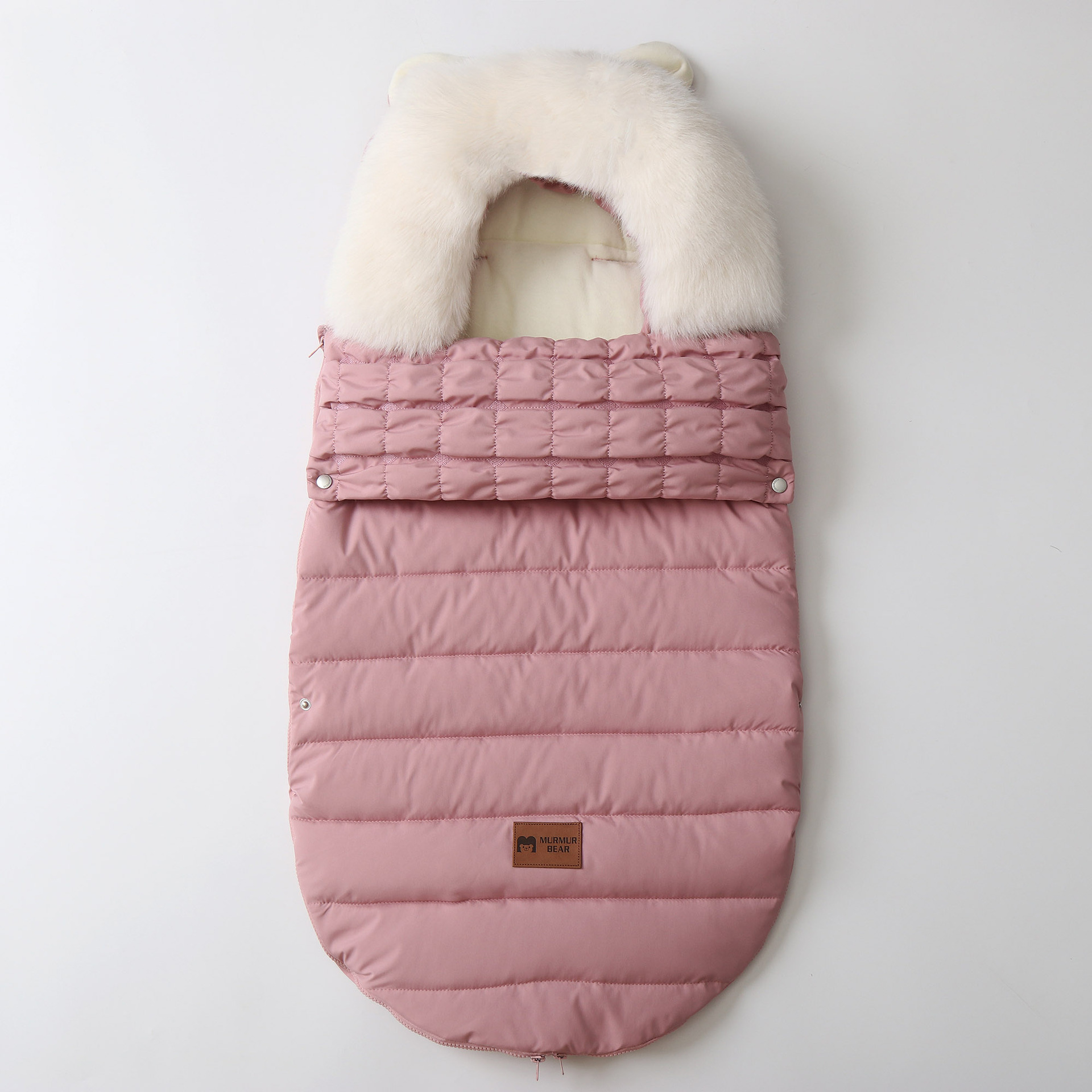 高品质睡袋,填充厚实羽绒棉,厚实保暖,内里摇粒绒,非常柔软,双向拉链可以完全打开,方便换纸尿裤。领口位置可以翻上去,也可以卷起来,好看又实用。背面有五个孔,方便婴儿车的安全带固定,真的是好看又实用。两个小熊耳朵超级萌,毛领可以脱卸,出口品质,长期供货。