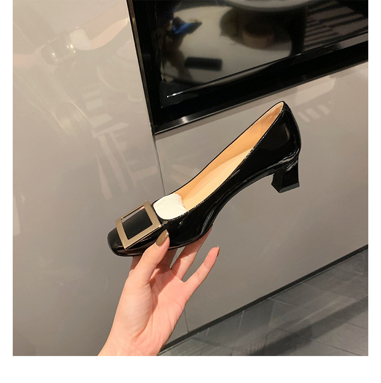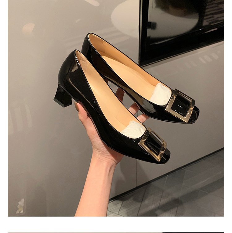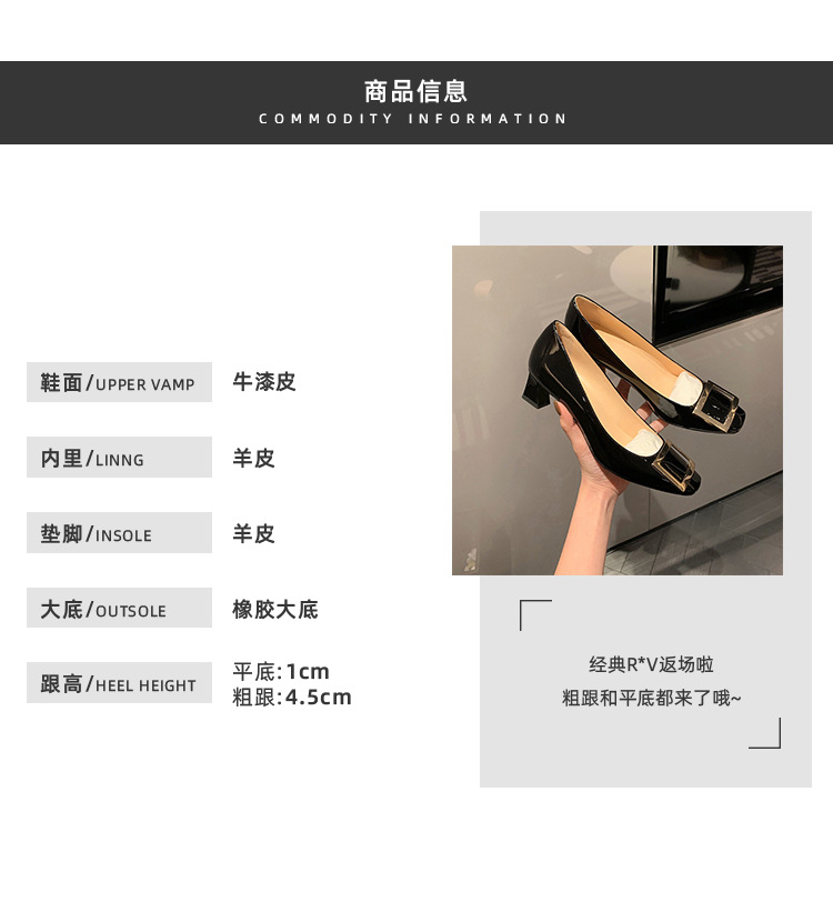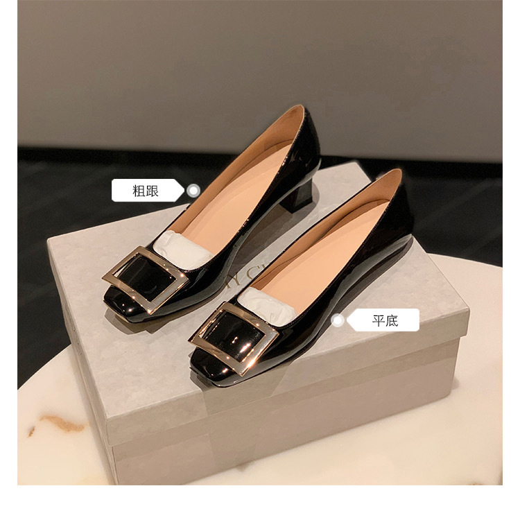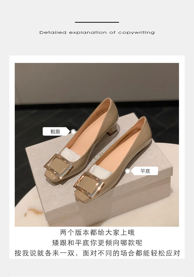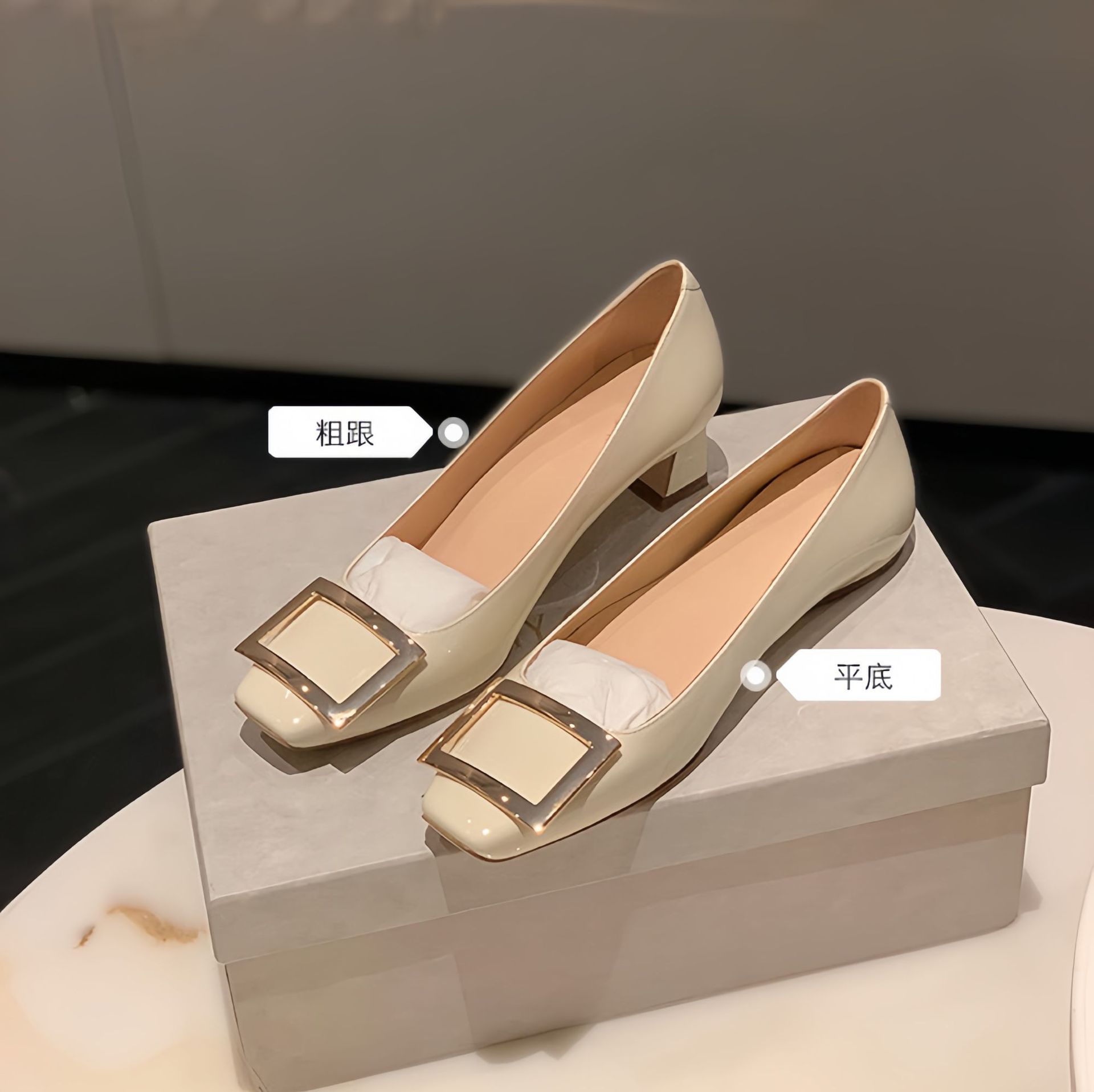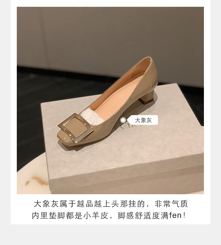 양가죽 판 ~ 클래식 스퀘어 버클 작은 광장 머리 얕은 입 하이힐 여성의 여름 두꺼운 힐 플랫 통근 신발 가죽 펌프