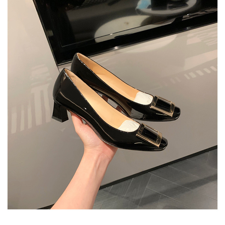 양가죽 판 ~ 클래식 스퀘어 버클 작은 광장 머리 얕은 입 하이힐 여성의 여름 두꺼운 힐 플랫 통근 신발 가죽 펌프스토어 가기