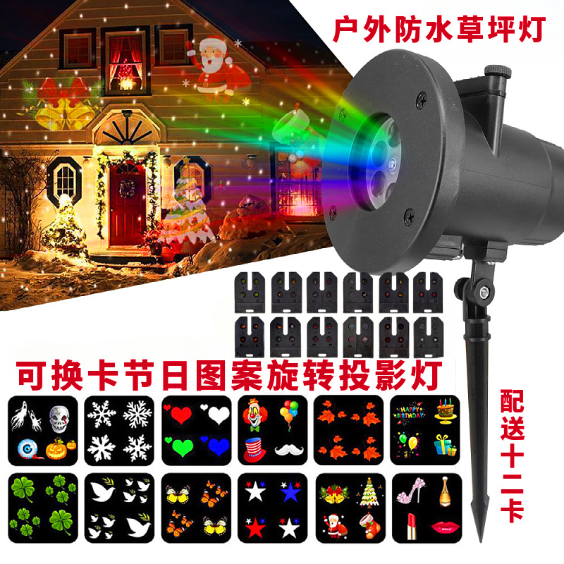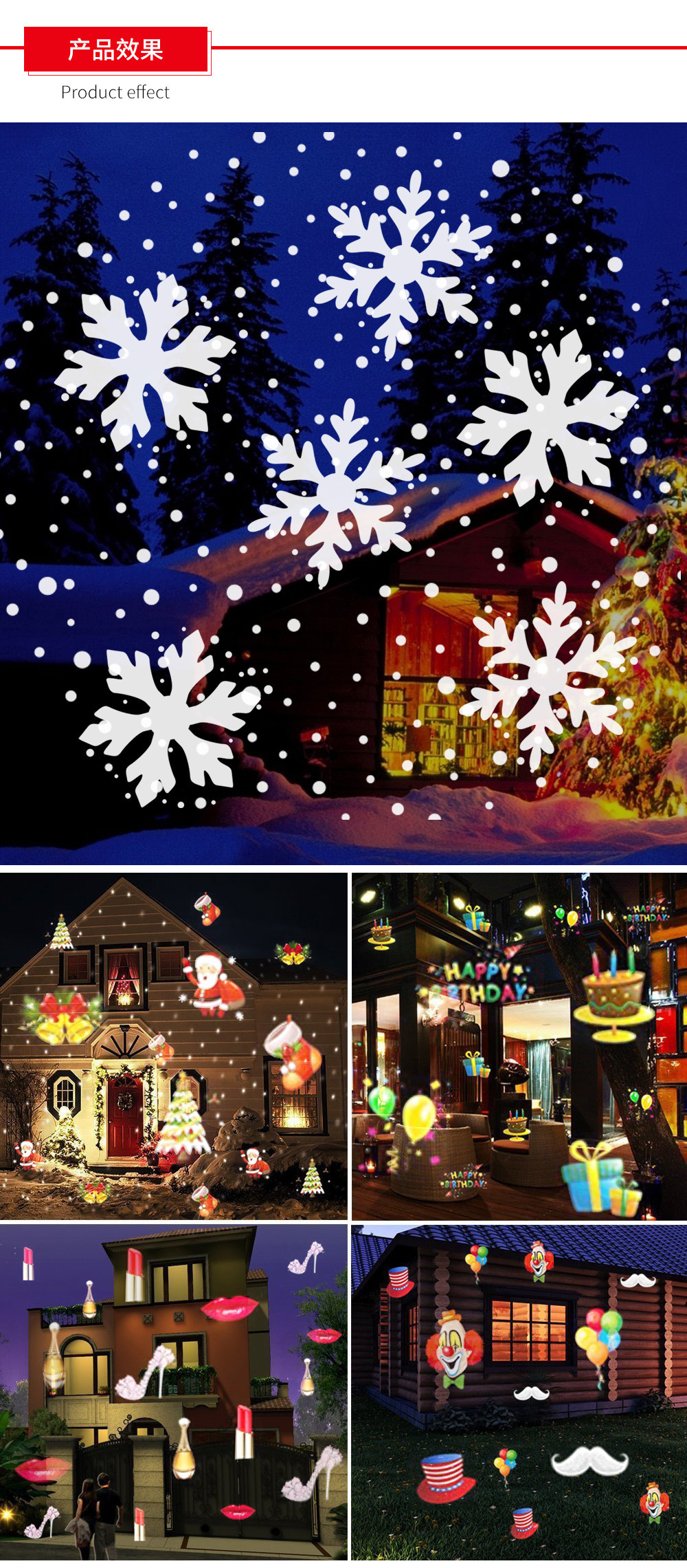 1、户外可换卡投影灯:投影图案有白色雪花、圣诞、万圣、生日快乐、烟花等等不同主题的图案。 适合圣诞装饰、派对聚会布置,花园/庭院/房子/墙壁装饰。为您的派对、节日和家庭派对增添更多乐趣