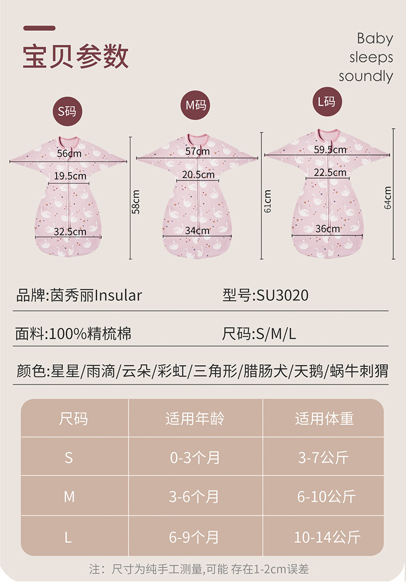 规格:S/58CM(适合0-3个月)M/61CM(适合3-6个月) L/64CM(适合6-9月)