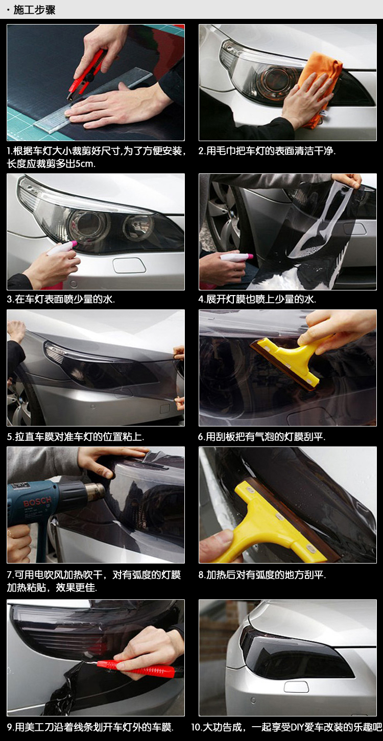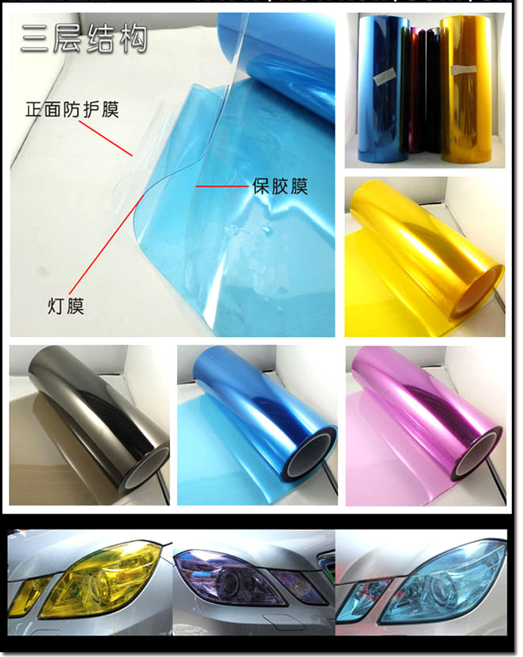 产品规格为10Mx30CM温馨提示:上面的标价为长度1的价钱,买就送刮板 美工刀!赠品不累计,仅送一套!(另外空运地区只能送刮板,空运地区包含新疆西藏内蒙古青海甘肃宁夏,港澳台)【备注:宽度不变,长度要多长有多长】【颜色】深蓝 大红 金黄 天蓝 绿色 紫红 橙色 荧光黄 深黑 浅黑 粉色 透明 熏黑【材质】高性能聚氨酯【结构】3层(改色膜/施工面保护层/胶面保护层)【规格】宽30cm厚0.15mm 长度自定【质保】5年【产品简介】采用高性能聚氨酯材料制作,做工精致、设计新颖、创意独特、贴心实用,做工细腻,绝对是您爱车最实用的贴心装备。替代汽车黑色透光喷漆的首选材料。不伤车灯不喜欢的话随时揭了,不留残胶,不影响汽车原样尾灯贴纸,不但具有防水,防晒,透光,表面光洁,伸缩延伸性强经久耐用等优点,更具有更换方便的特点。是车友们装饰爱车的首要选择。【产品特点】1.保护脆弱的车灯 r2.使车灯的颜色不再单调,达到展示个性的需求。r3.安装简易r4.便于更换r5.透光性强,不影响车灯的使用r6.拉伸性好,可完美贴合车灯全透光灯膜透光率高达99.9%不会影响光线亚光透光率相对差很多价格也相对低廉很多大灯膜分三层和两层之分,三层厚度加强使用受命更加长久,我们的产品全是三层加厚【建议购买颜色】大灯:金黄色浅黑色浅蓝色粉红色娇紫色荧光绿绚橙色尾灯:烟熏黑深黑色激情红雾灯:金黄色浅蓝色娇紫色特别提示,因为拍摄灯光和显示器问题,照片和实物颜色会有点点区别,对颜色有特别特别要求的请不要拍。不喜欢的话随时揭掉,不留残胶,不影响车原样尾灯贴纸,不但具有防水,防晒,透光性好,表面光洁,伸缩延伸性强经久耐用等优点,更具有更换方便的特点。是车友们装饰爱车的首要选择