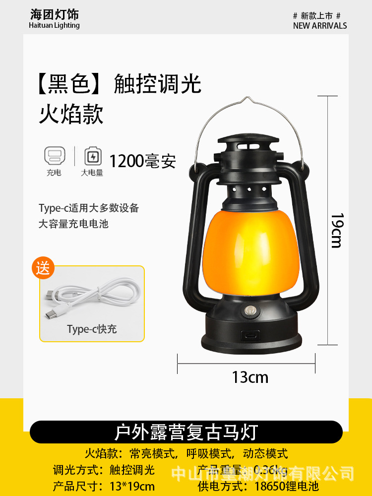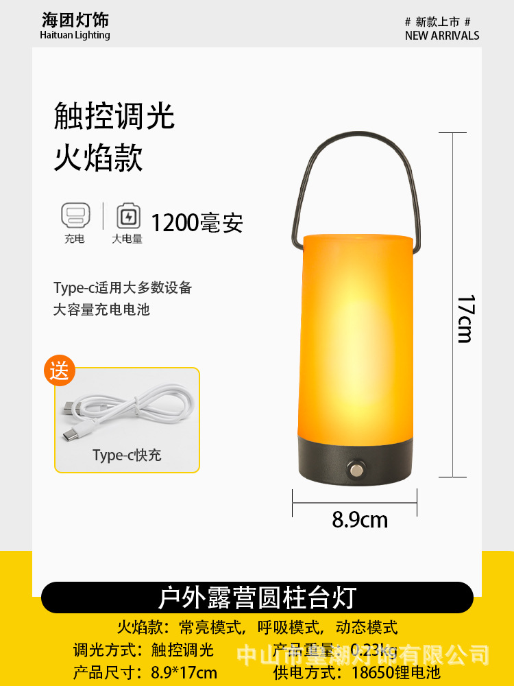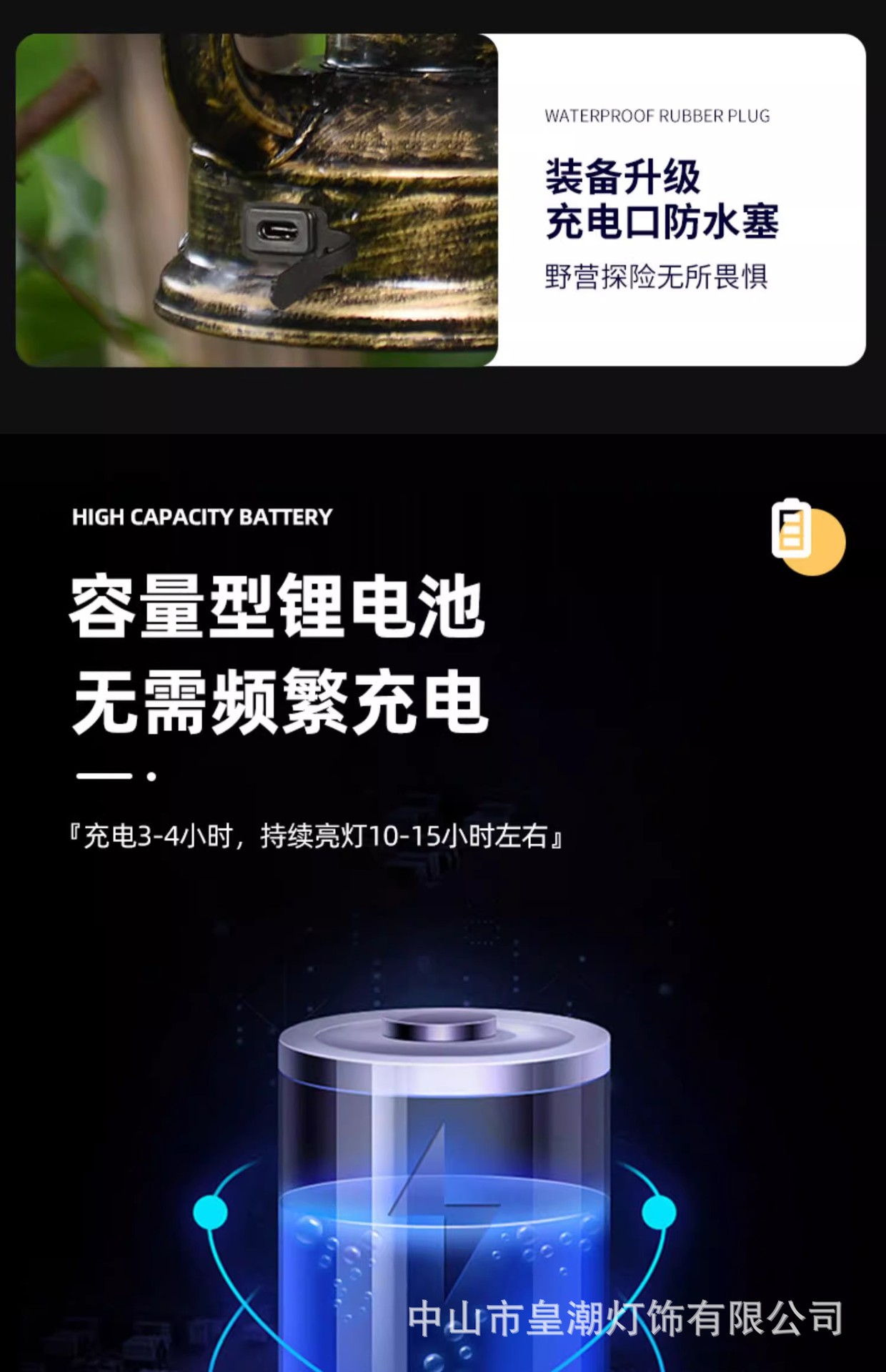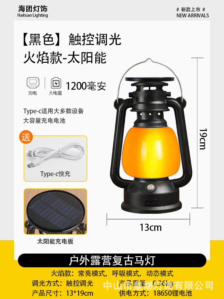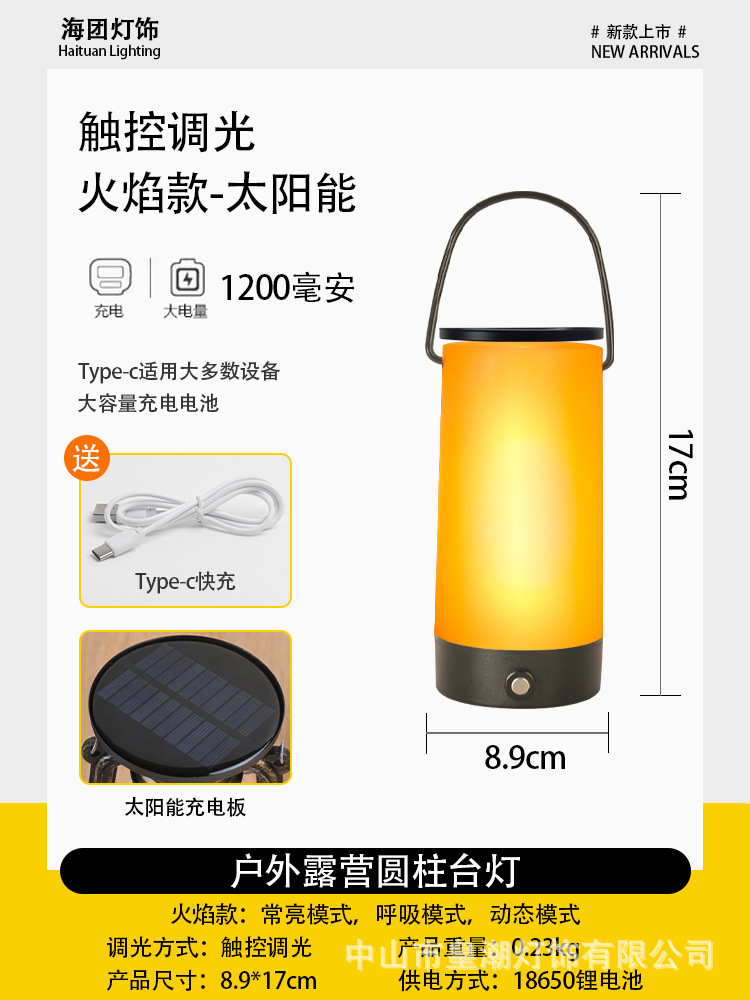 • 원통형 후크형 + 화염 조명 + 태양광 Type-C 고속 충전