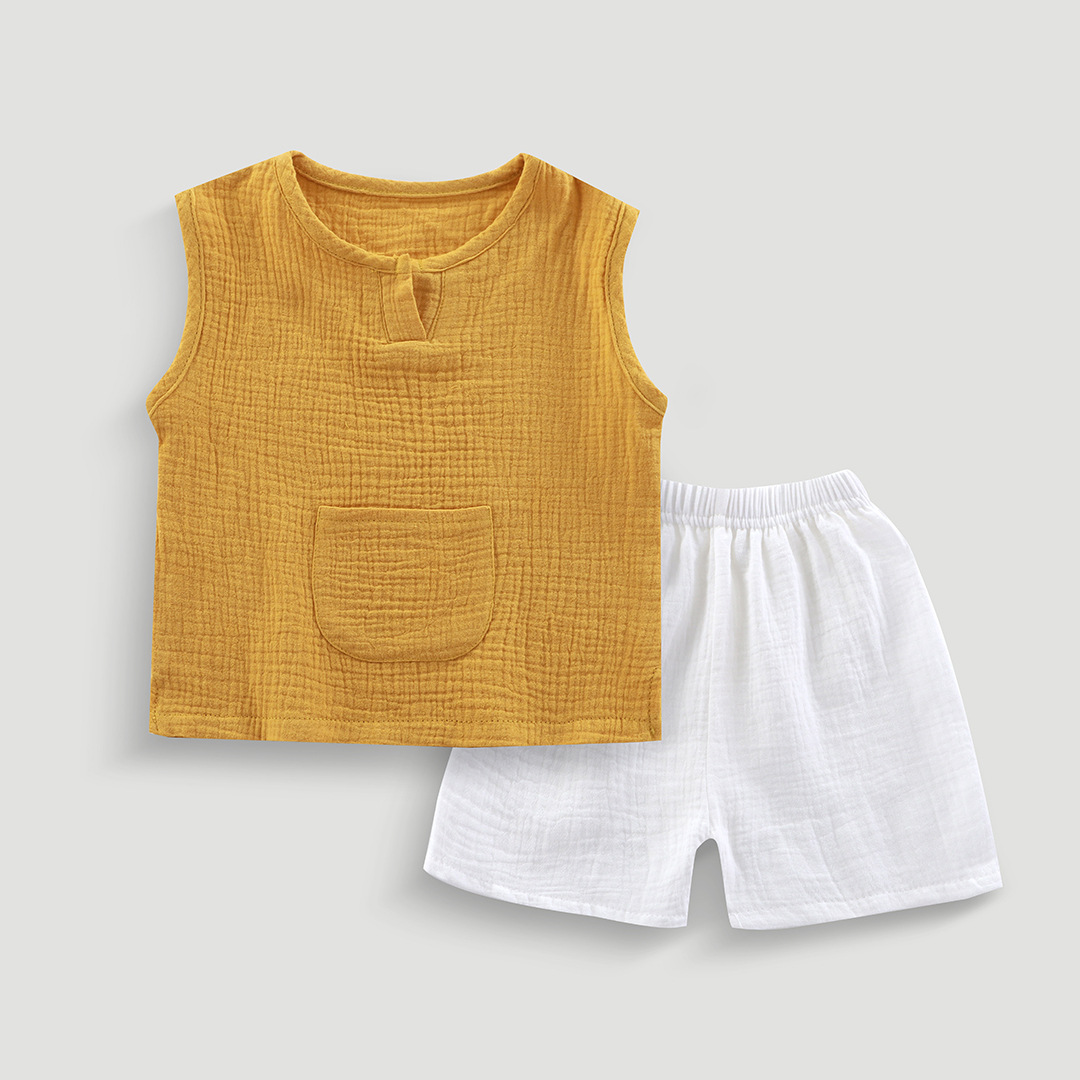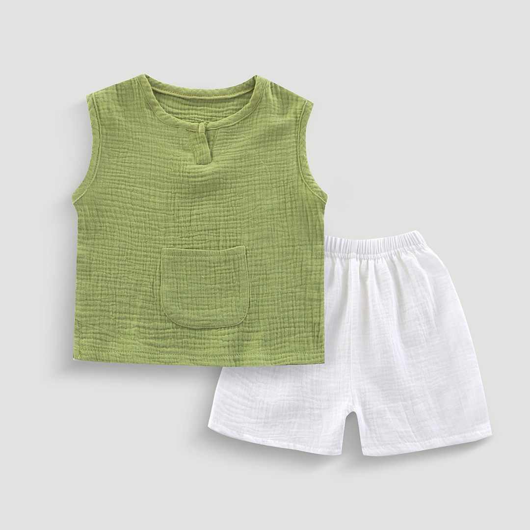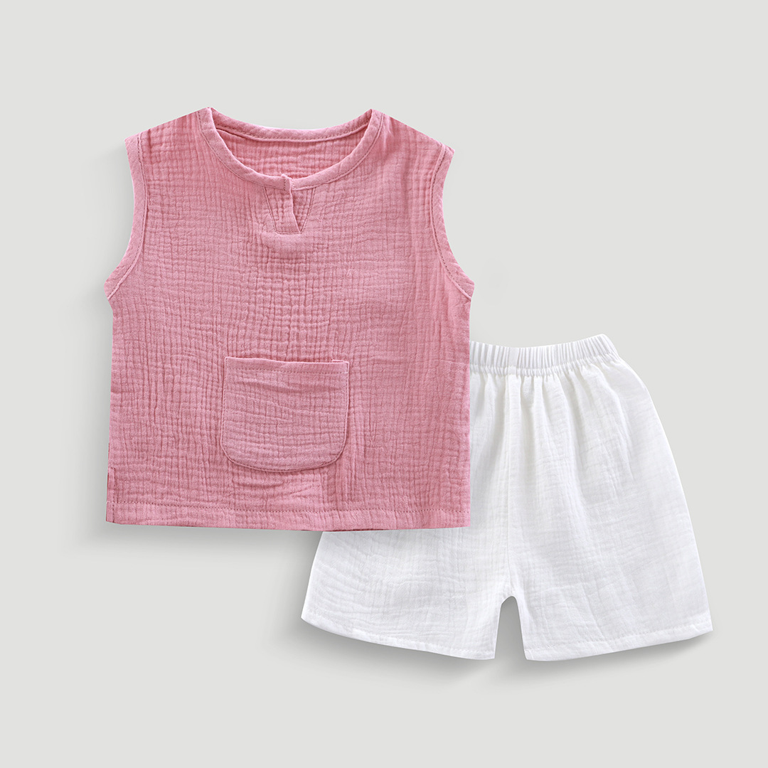 어린이 여름 얇은 세트 단색 더블 레이어 원사 통기성 땀 흡수 배꼽 패드 조끼 홈 의류 2 피스 세트