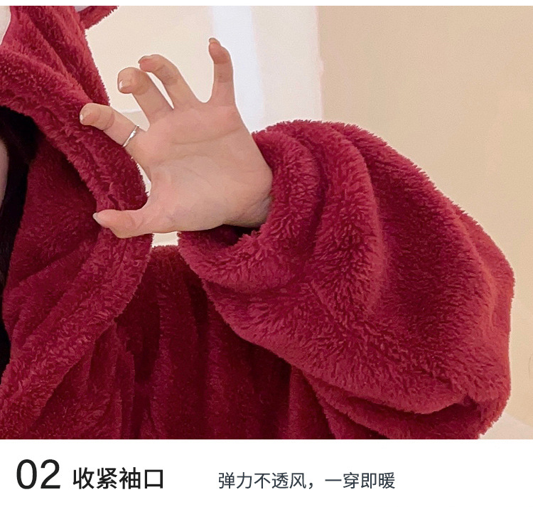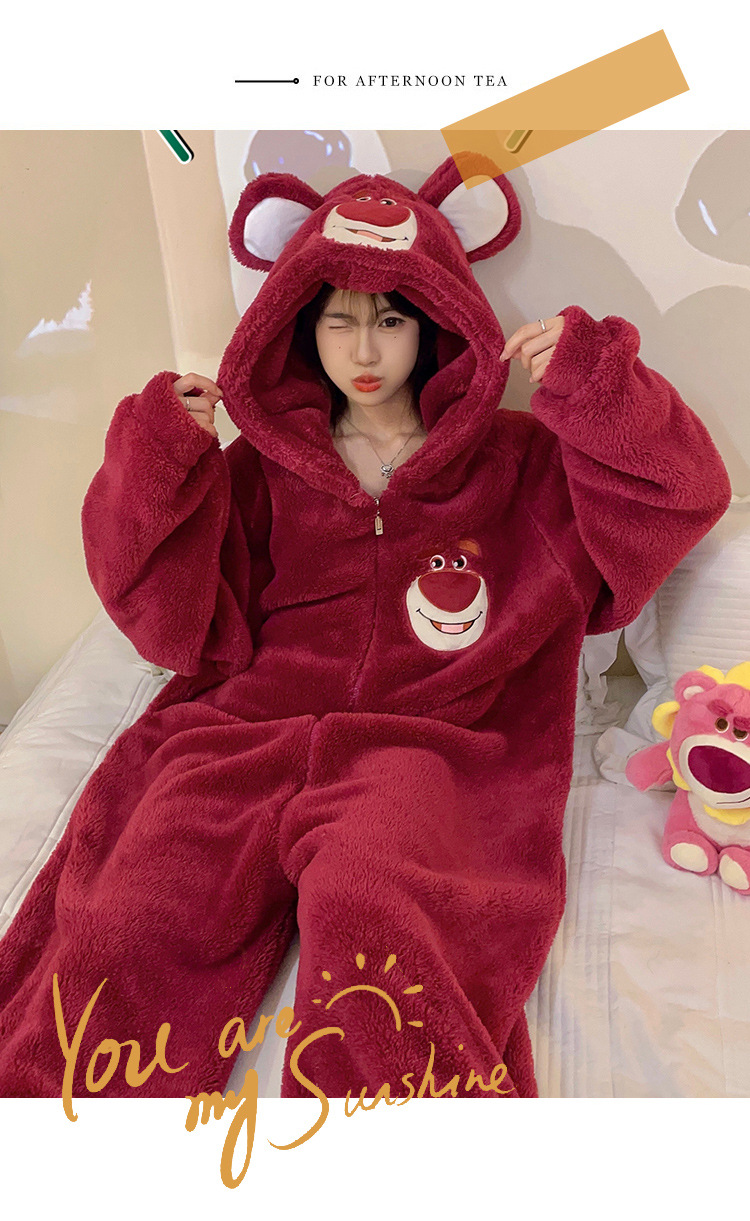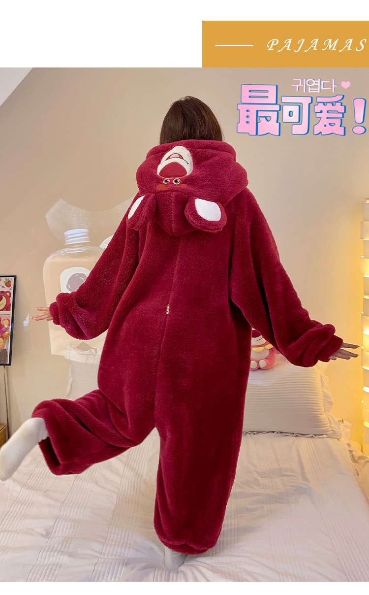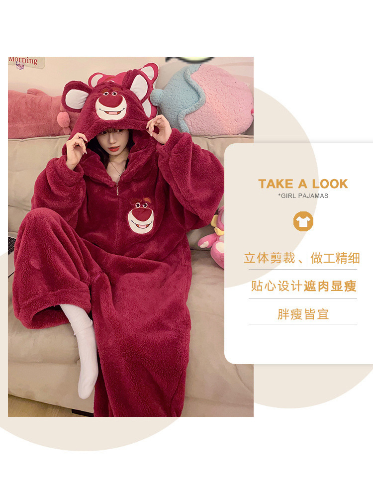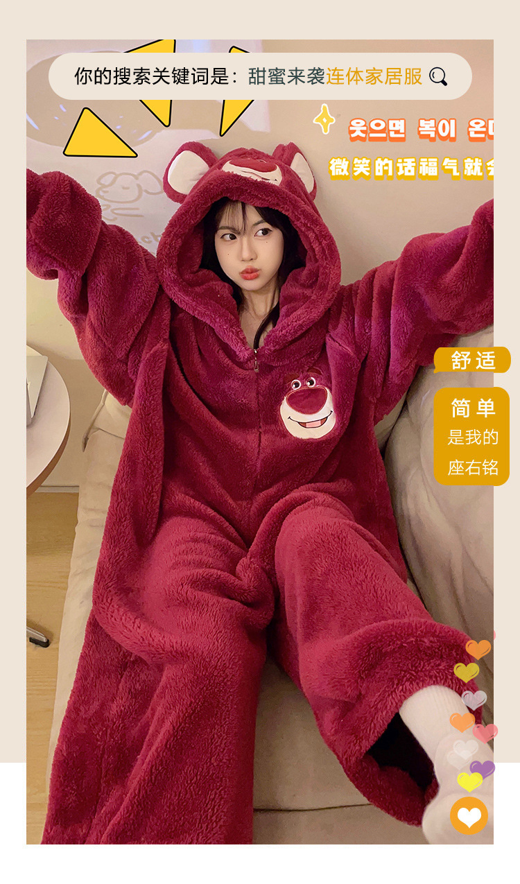 딸기곰 후드 잠옷 여성용 가을 겨울 산호 벨벳 따뜻한 절친복 파티 외출 가능 원피스 홈웨어