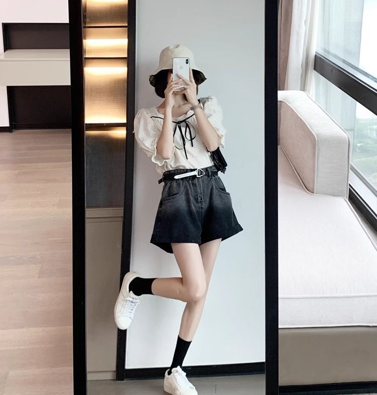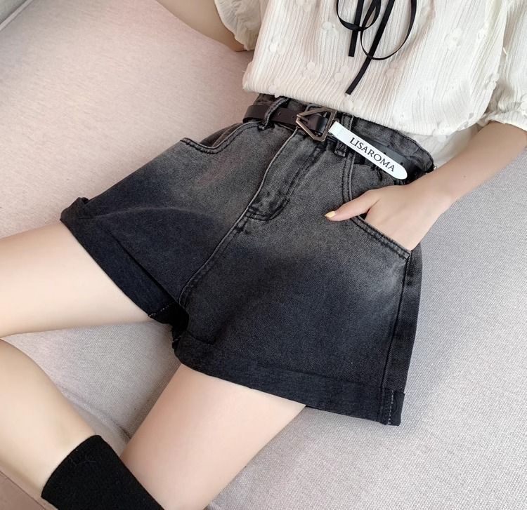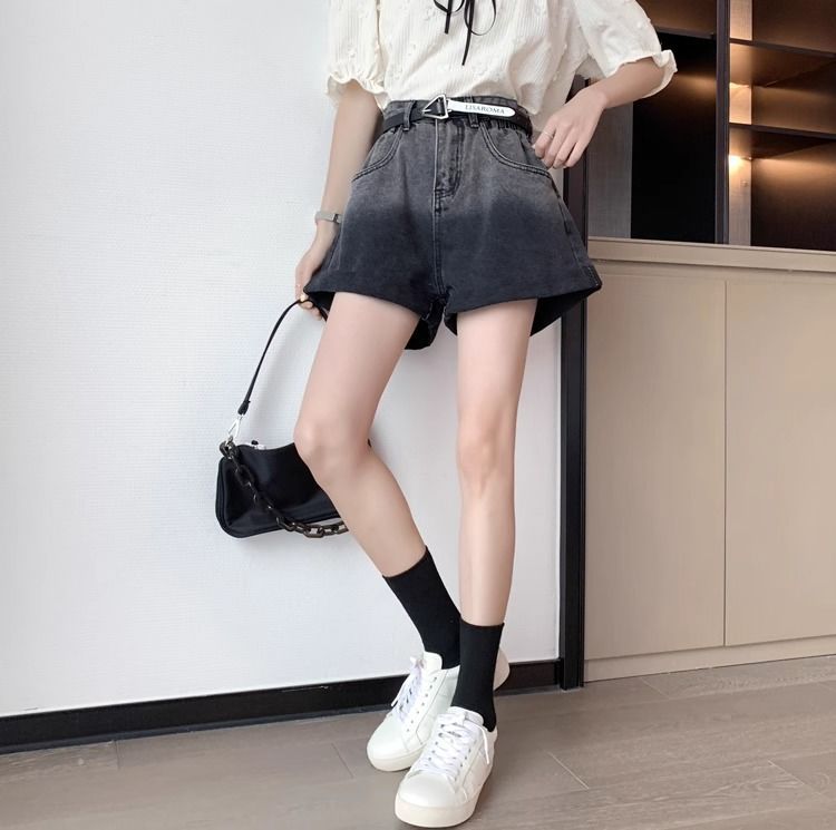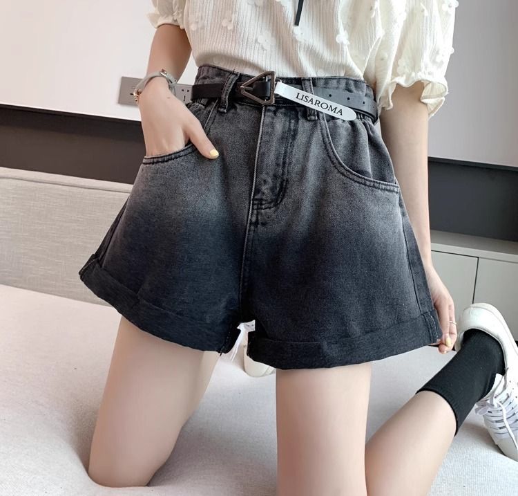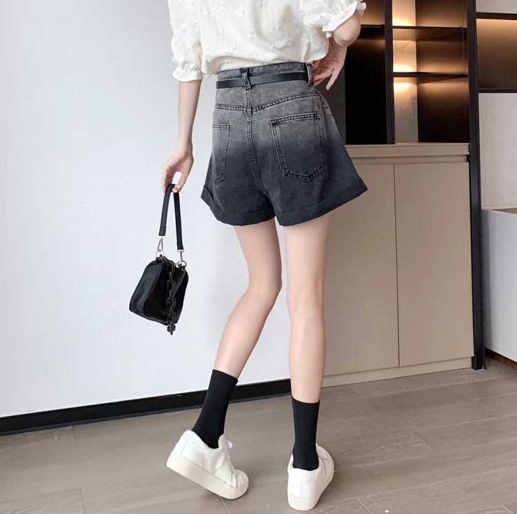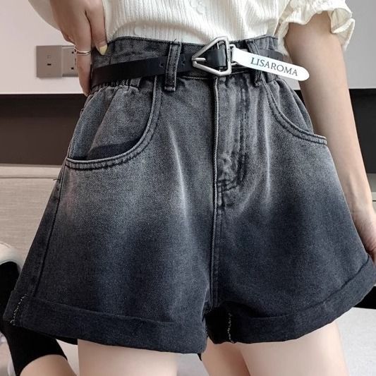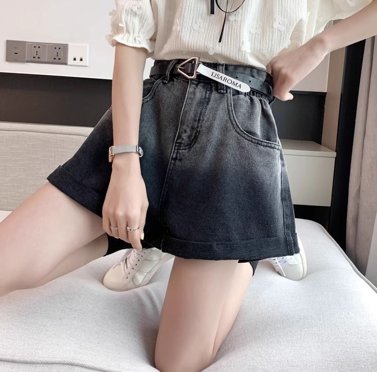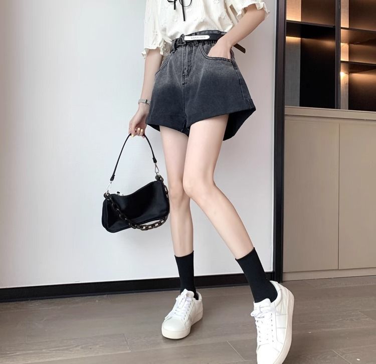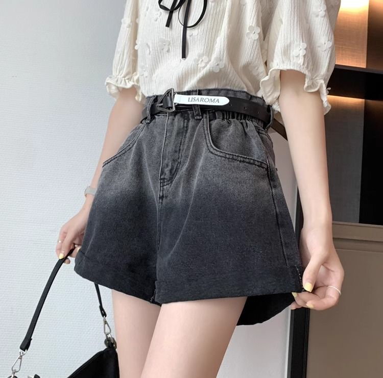 블랙 그레이 그라디언트 데님 반바지 여성 플러스 사이즈 2024 여름 레트로 느슨한 높은 허리 A 라인 턴업 와이드 레그 핫 팬츠스토어 가기