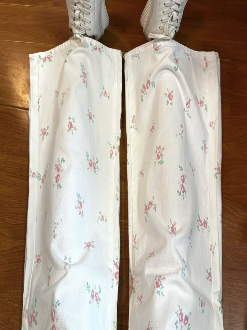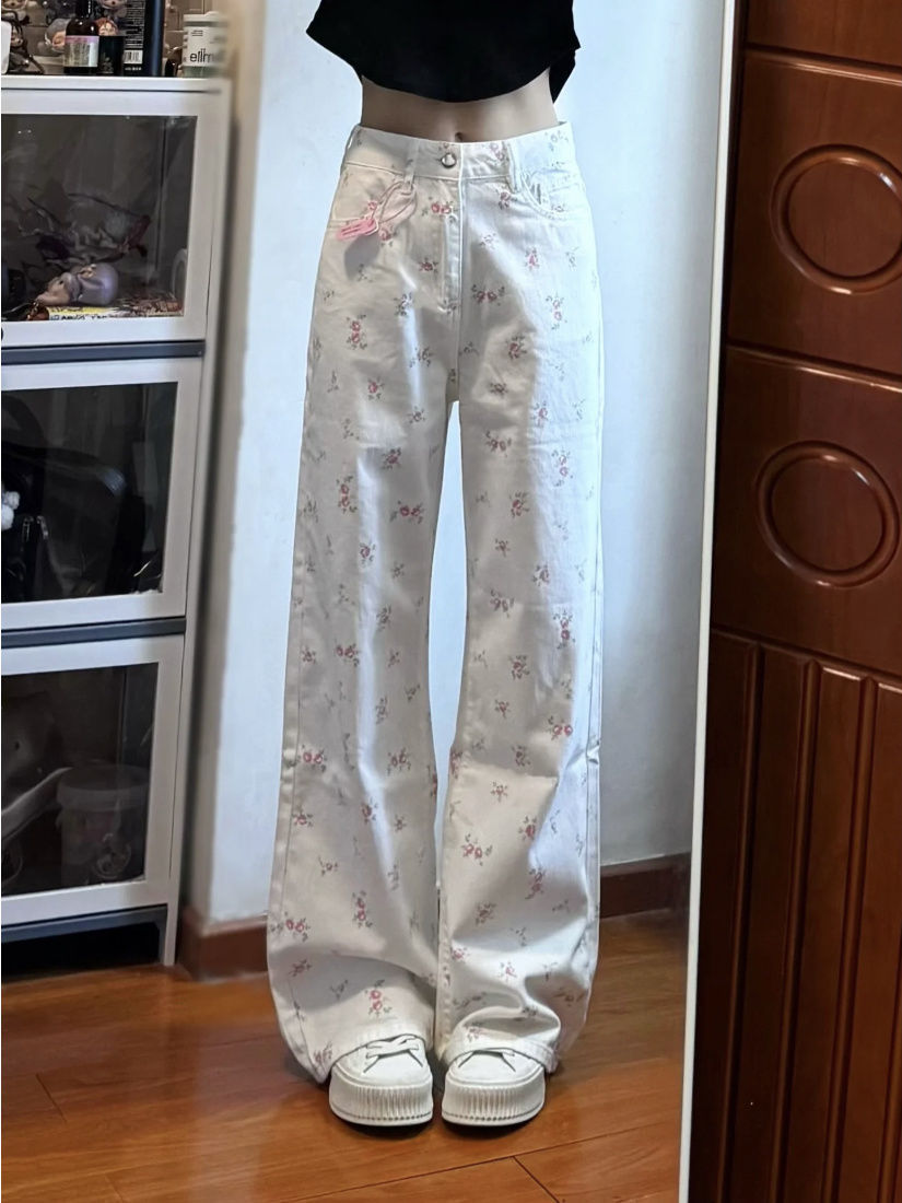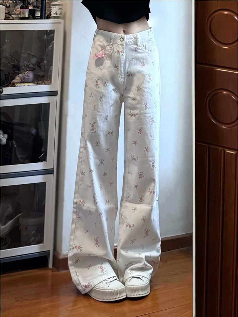 흰색 꽃 청바지 여성의 봄 2024 새로운 높은 허리 슬리밍 느슨한 넓은 다리 바지 스트레이트 튜브 긴 바지