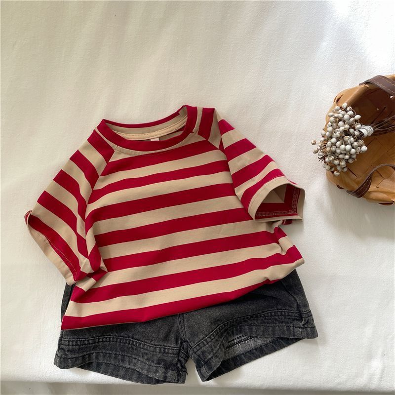 남학생과 여학생 여름 반팔 티셔츠 아기 외국식 어린이 세련된 한국식 컬러 매칭 스트라이프 타이 염색 인터넷 유명인 반소매스토어 가기