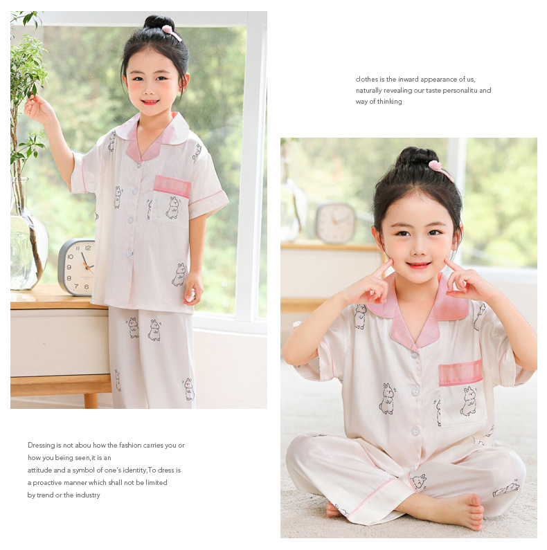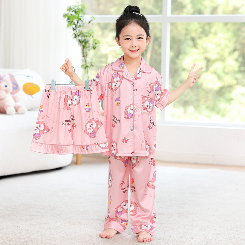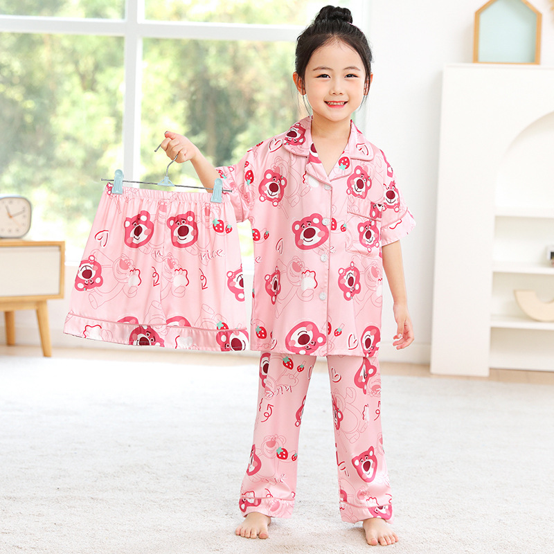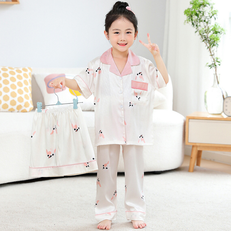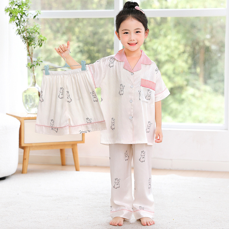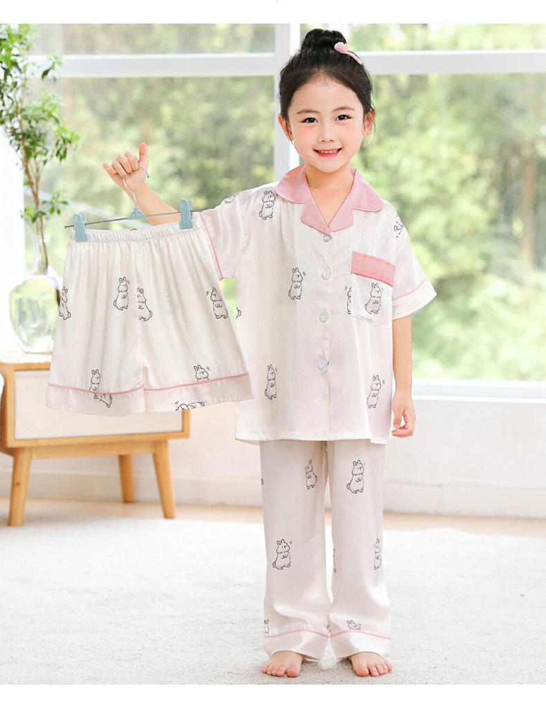 어린이 잠옷 소녀 2024 년 새 여름 얇은 얼음 실크 반팔 바지 3 피스 세트 소녀 홈 의류 세트