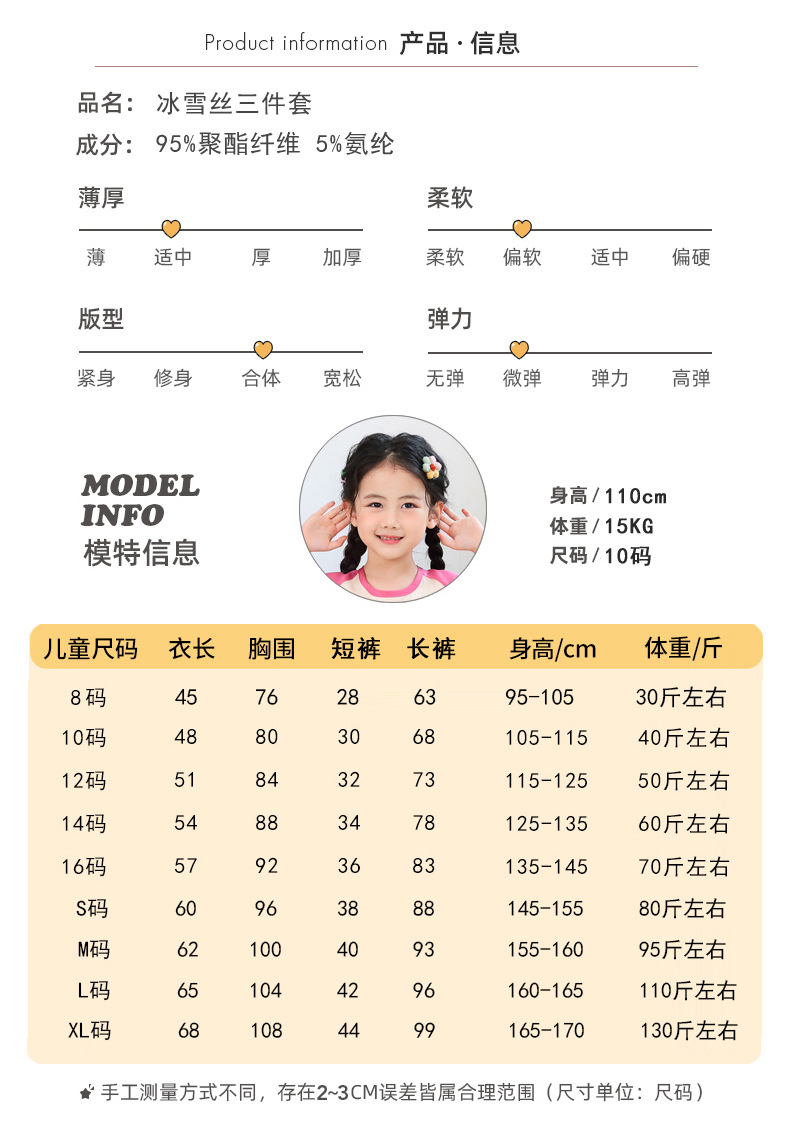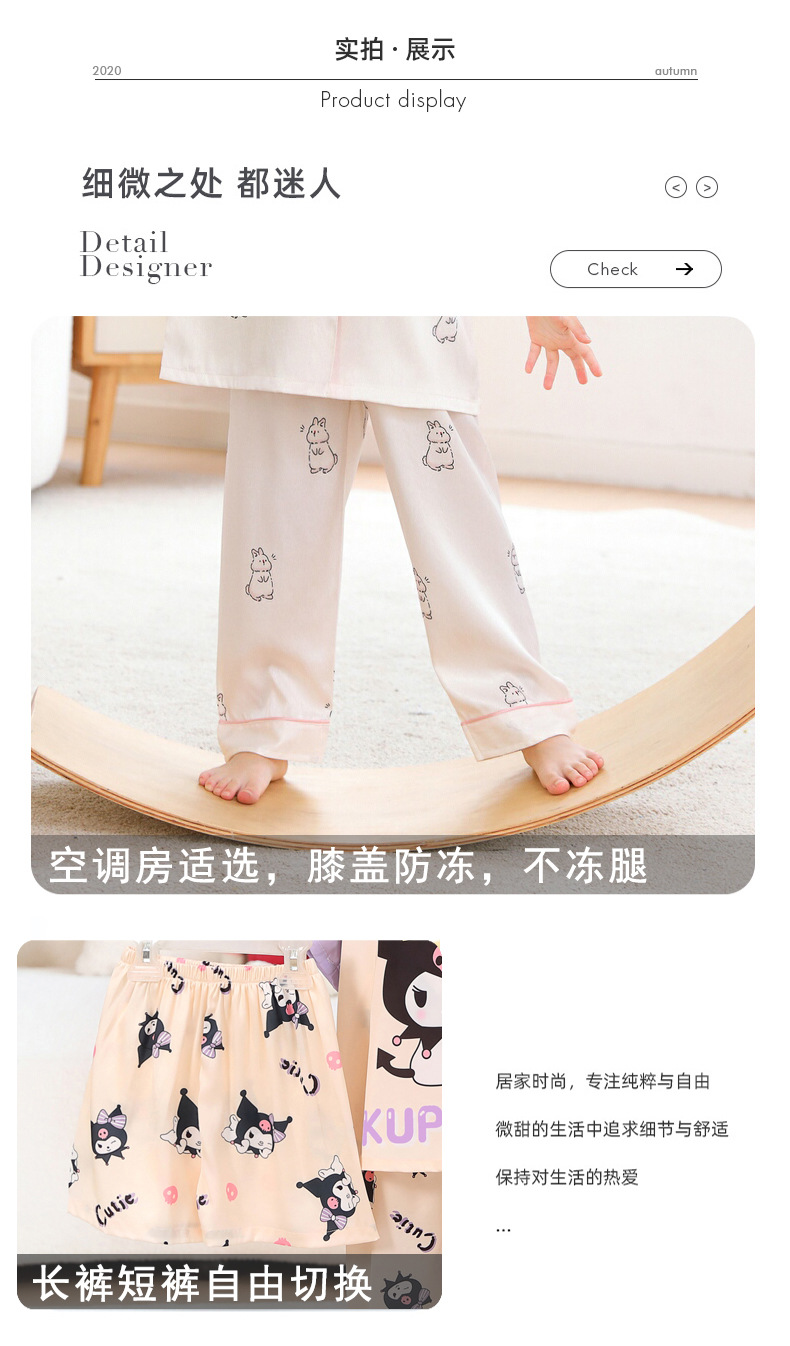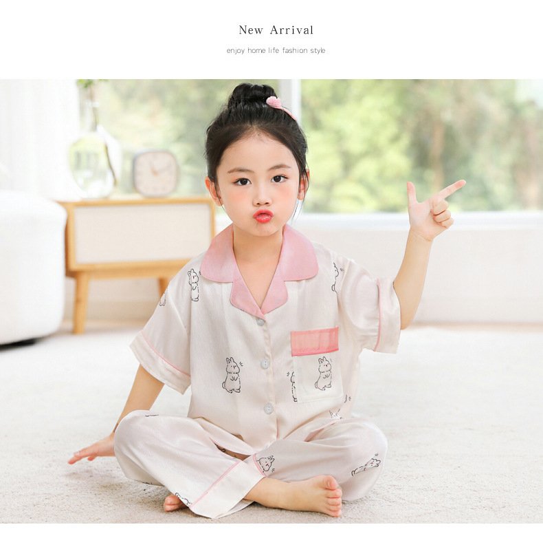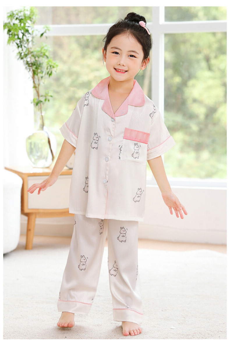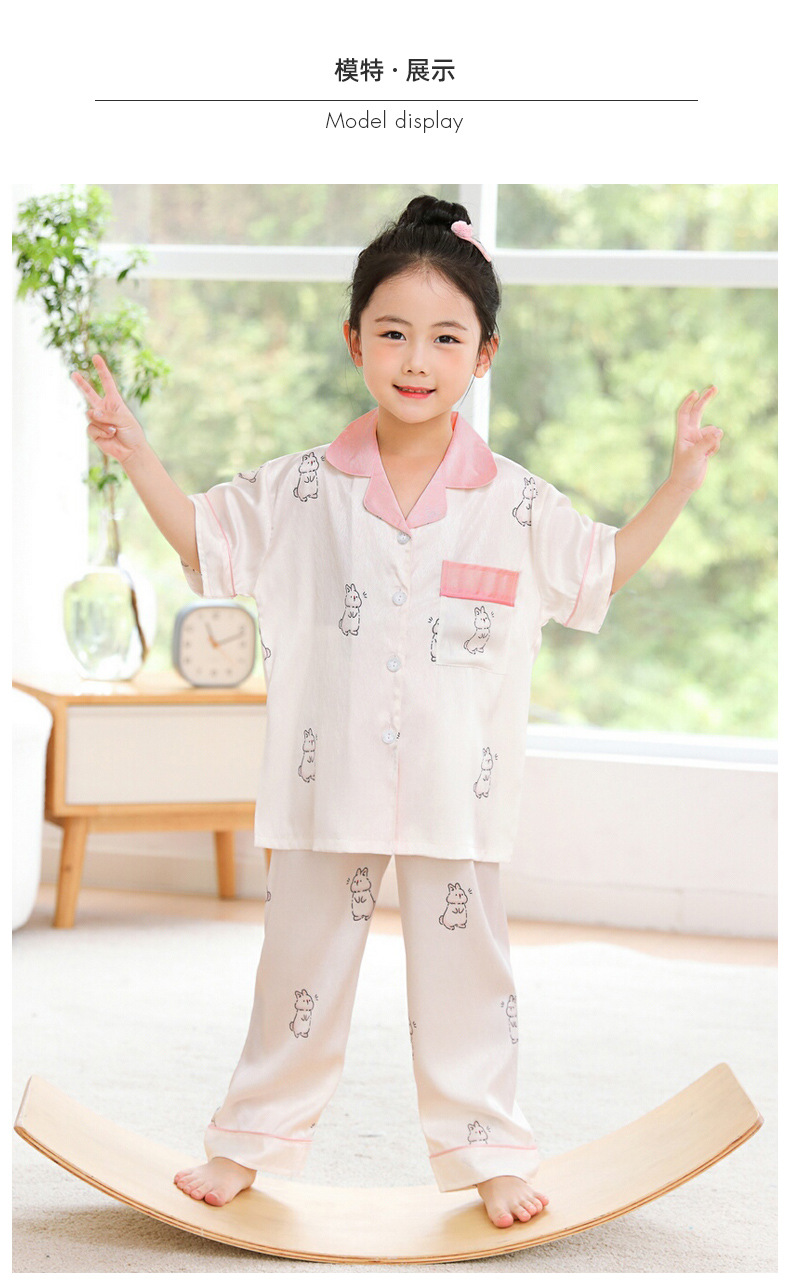어린이 잠옷 소녀 2024 년 새 여름 얇은 얼음 실크 반팔 바지 3 피스 세트 소녀 홈 의류 세트