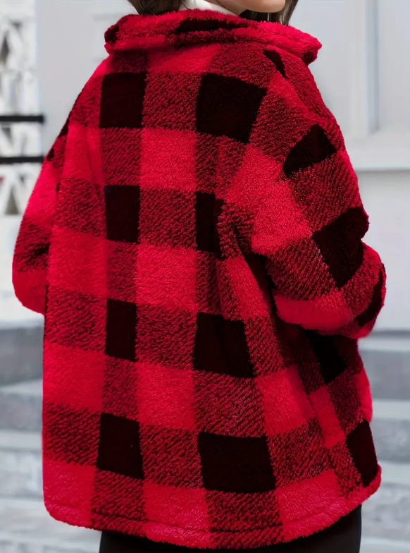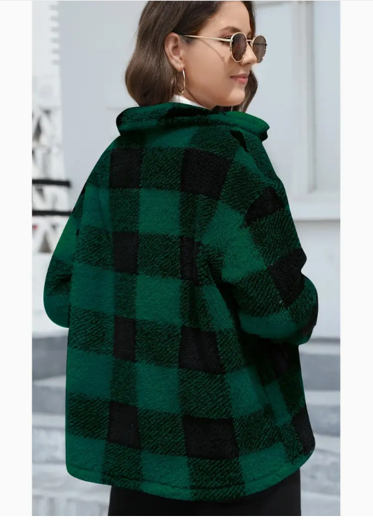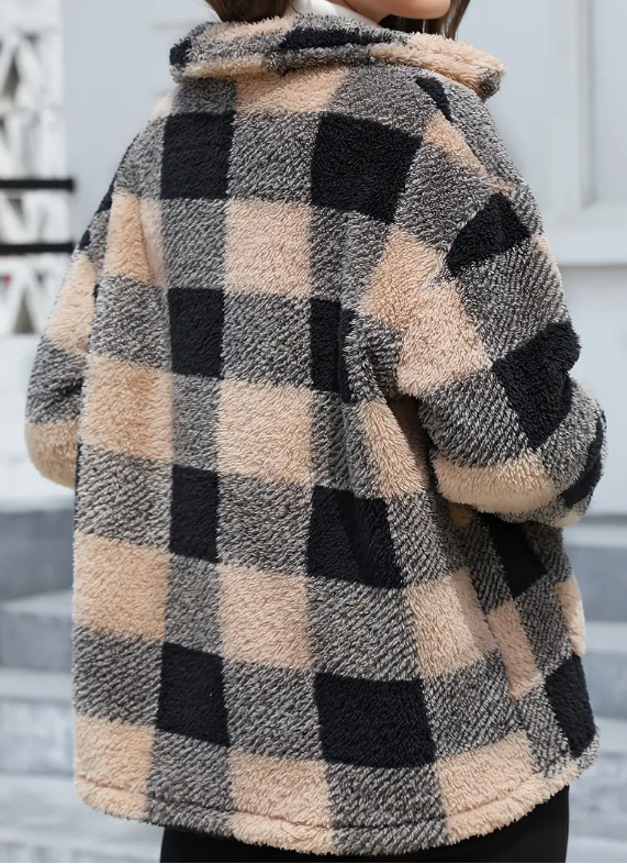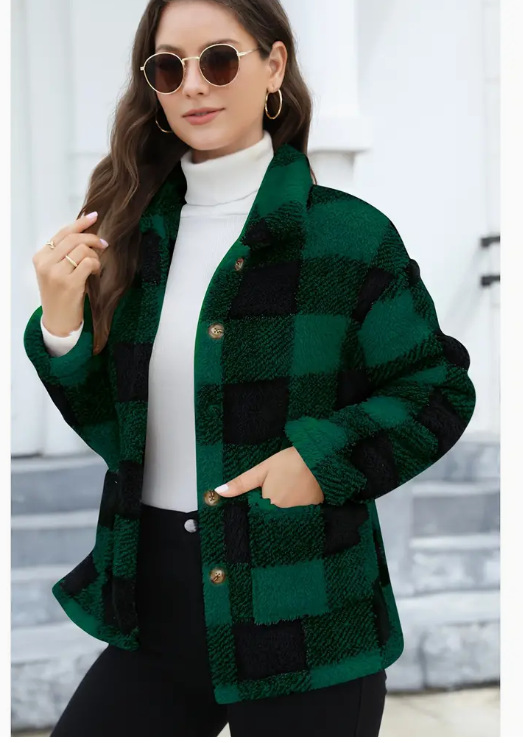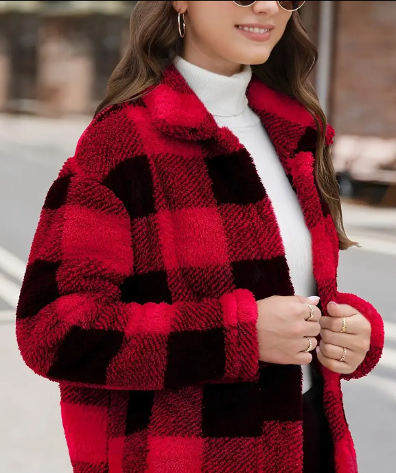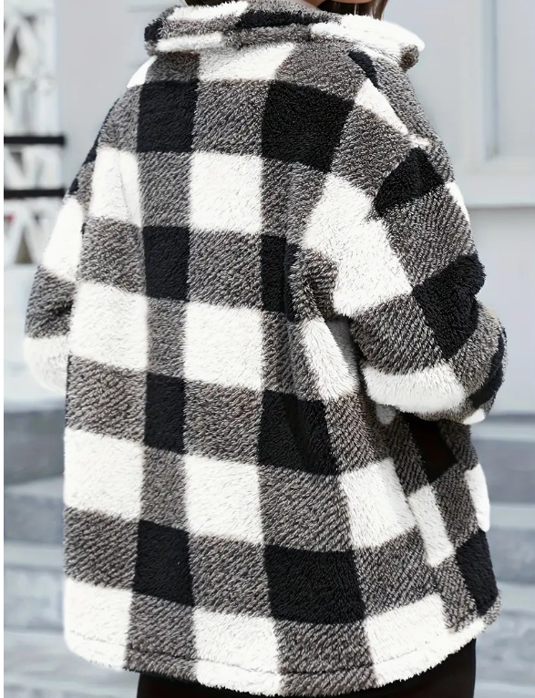 2024 국경을 넘는 유럽과 미국 여성 체크 무늬 플러시 코트 패치 백 올 매치 긴 소매 겨울 패션 캐주얼 코트스토어 가기