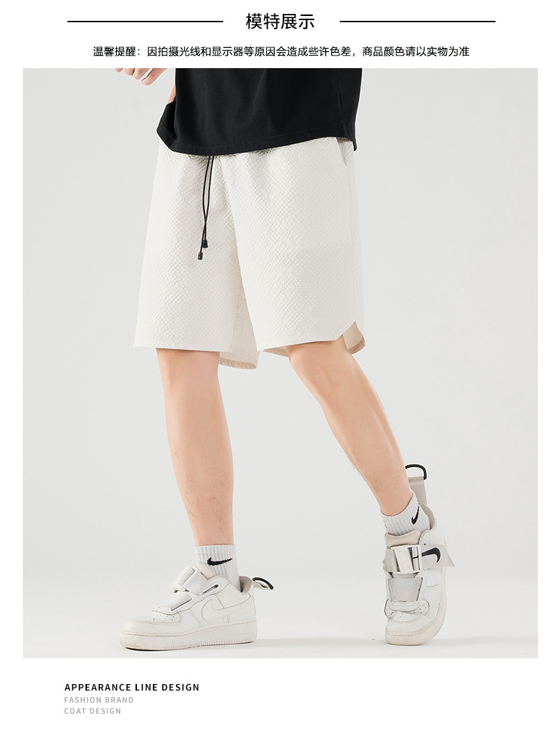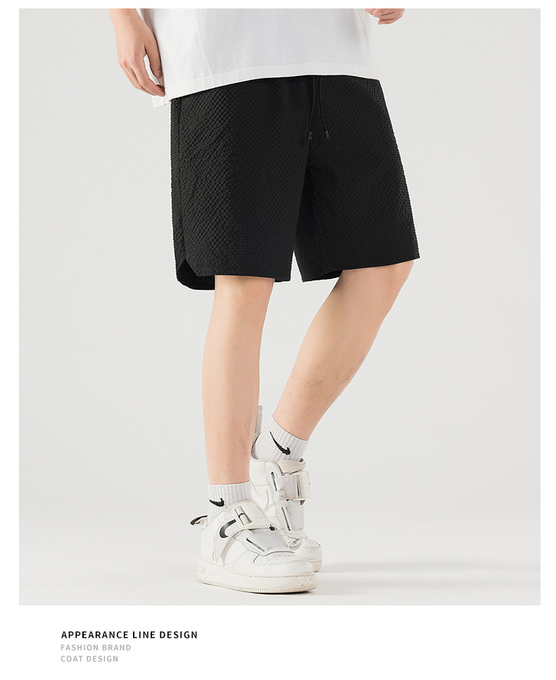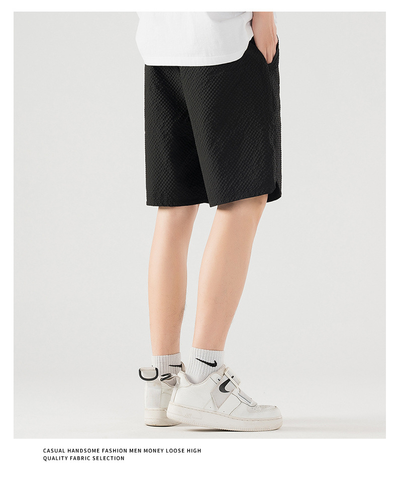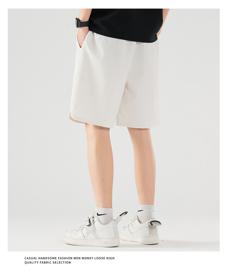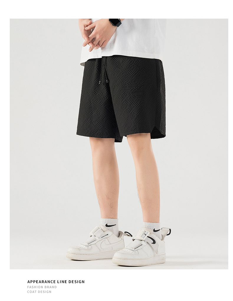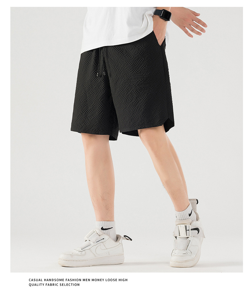 일본식 간단한 단색 버블 체크 무늬 캐주얼 반바지 남자 여름 유행 느슨한 올 매치 허리 끈 바지
