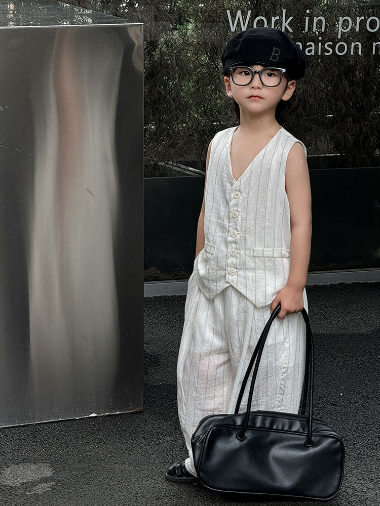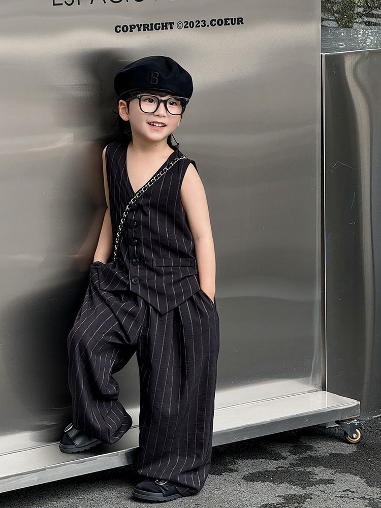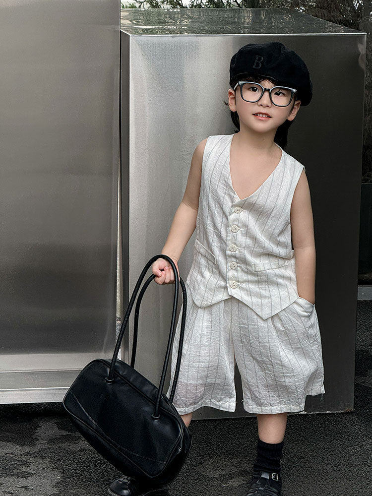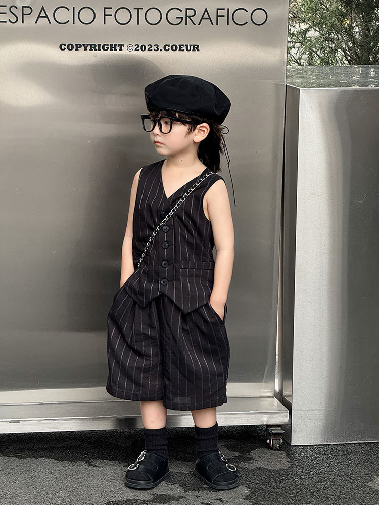 남아복 세트 2025 여름 신상 흑백 스트라이프 조끼 반바지 얇은 상의 트렌디한 아동복 원피스 도매스토어 가기