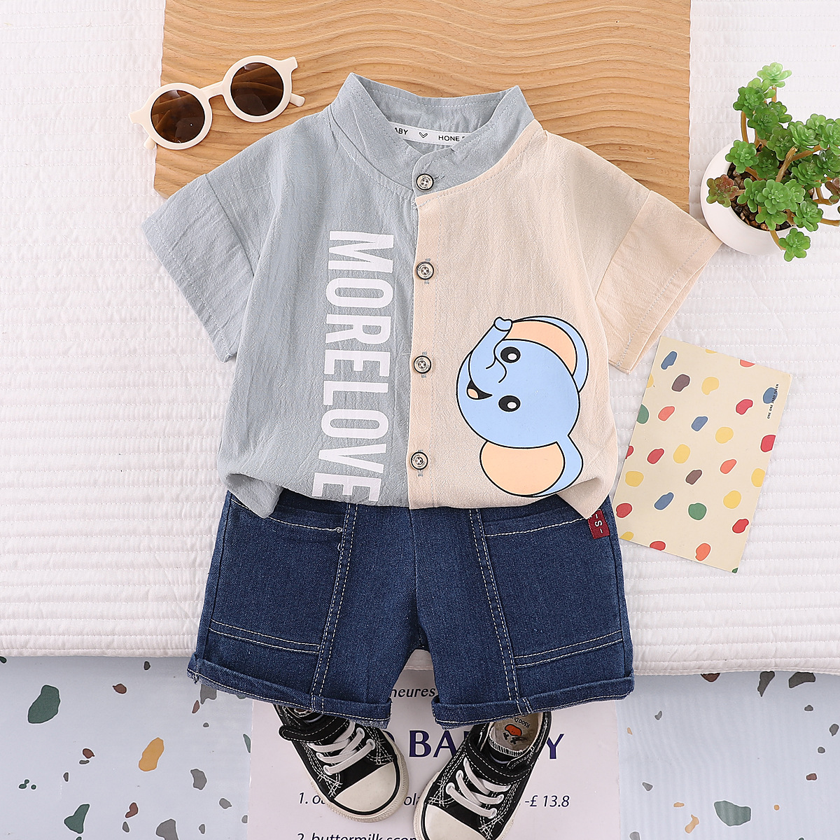 유아 및 어린이 멋진 세트 패션 스타일을위한 대외 무역 소년의 옷깃 반팔 2 피스 새 옷스토어 가기