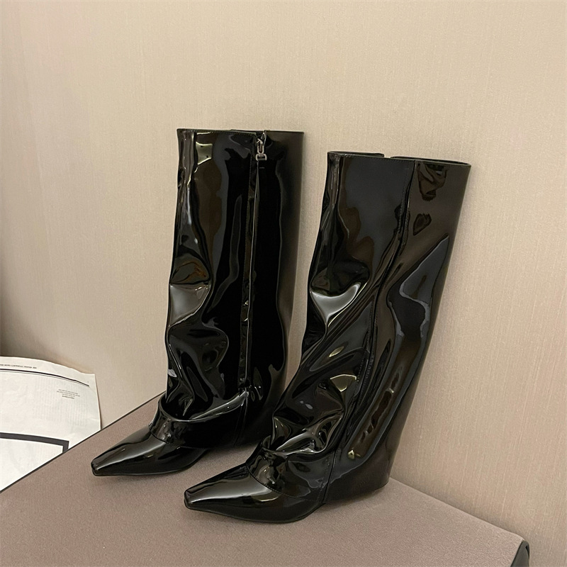 블랙 특허 가죽 힙 부츠 롱 부츠 여성용 2024 가을 및 겨울 라이더 부츠 거리 삶은 높이 증가 대형 삶은 바지 부츠 하이힐 부츠스토어 가기