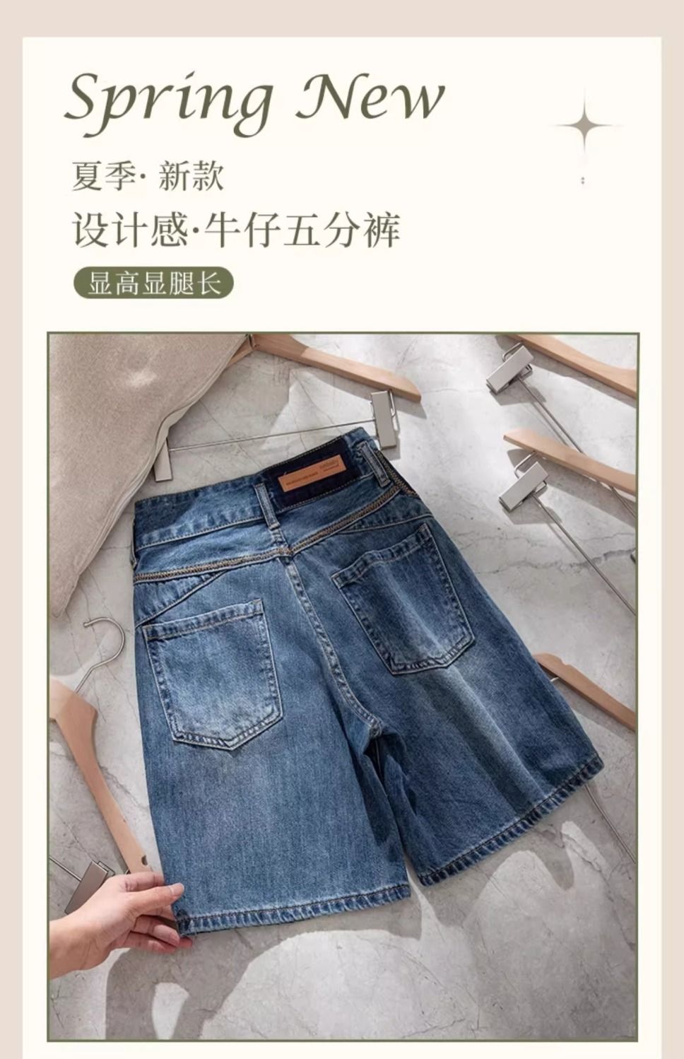 빈티지 콘트라스트 컬러 데님 반바지 여성 여름 2024 작은 새로운 높은 허리 슬리밍 느슨한 스트레이트 바지